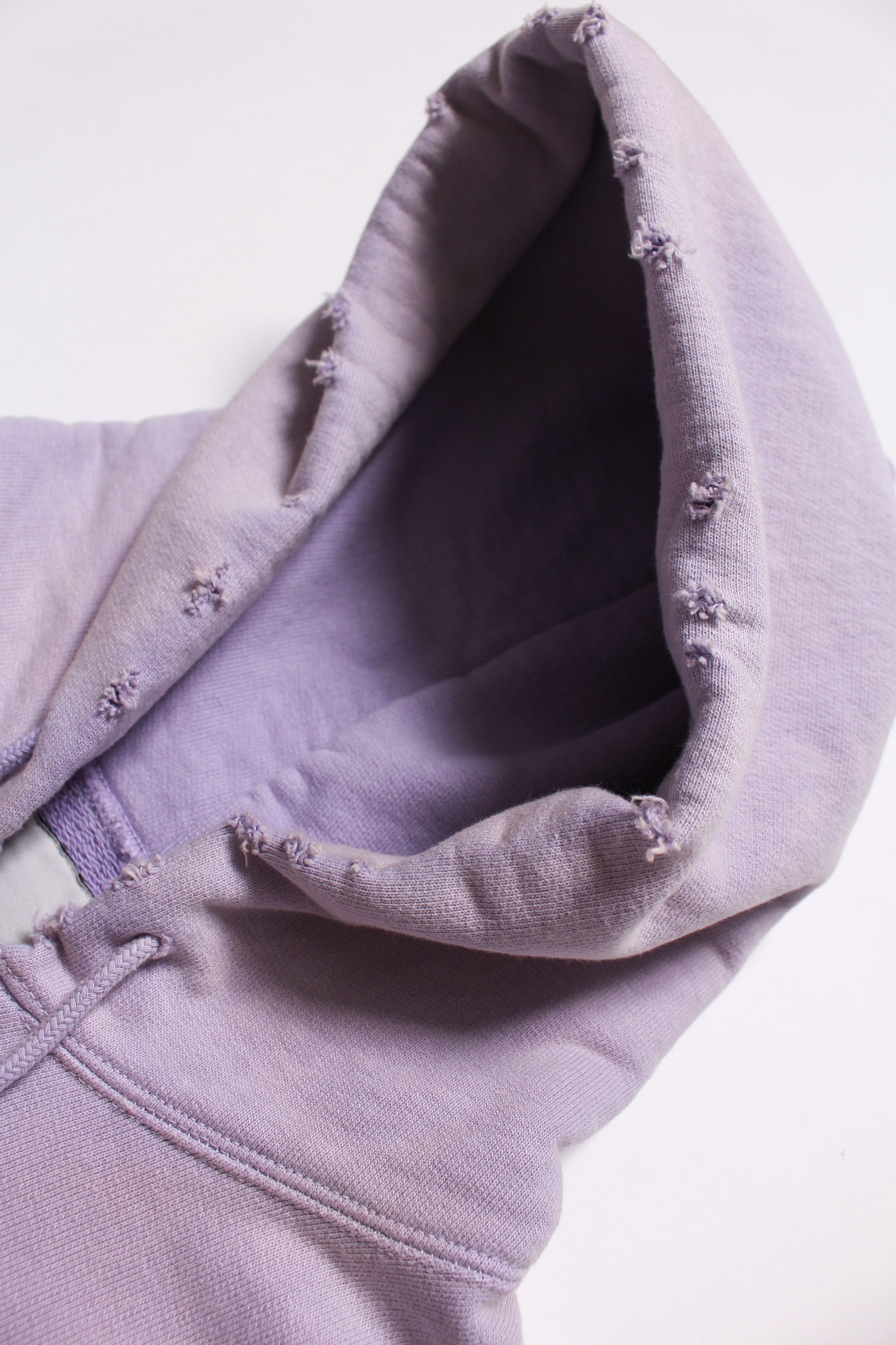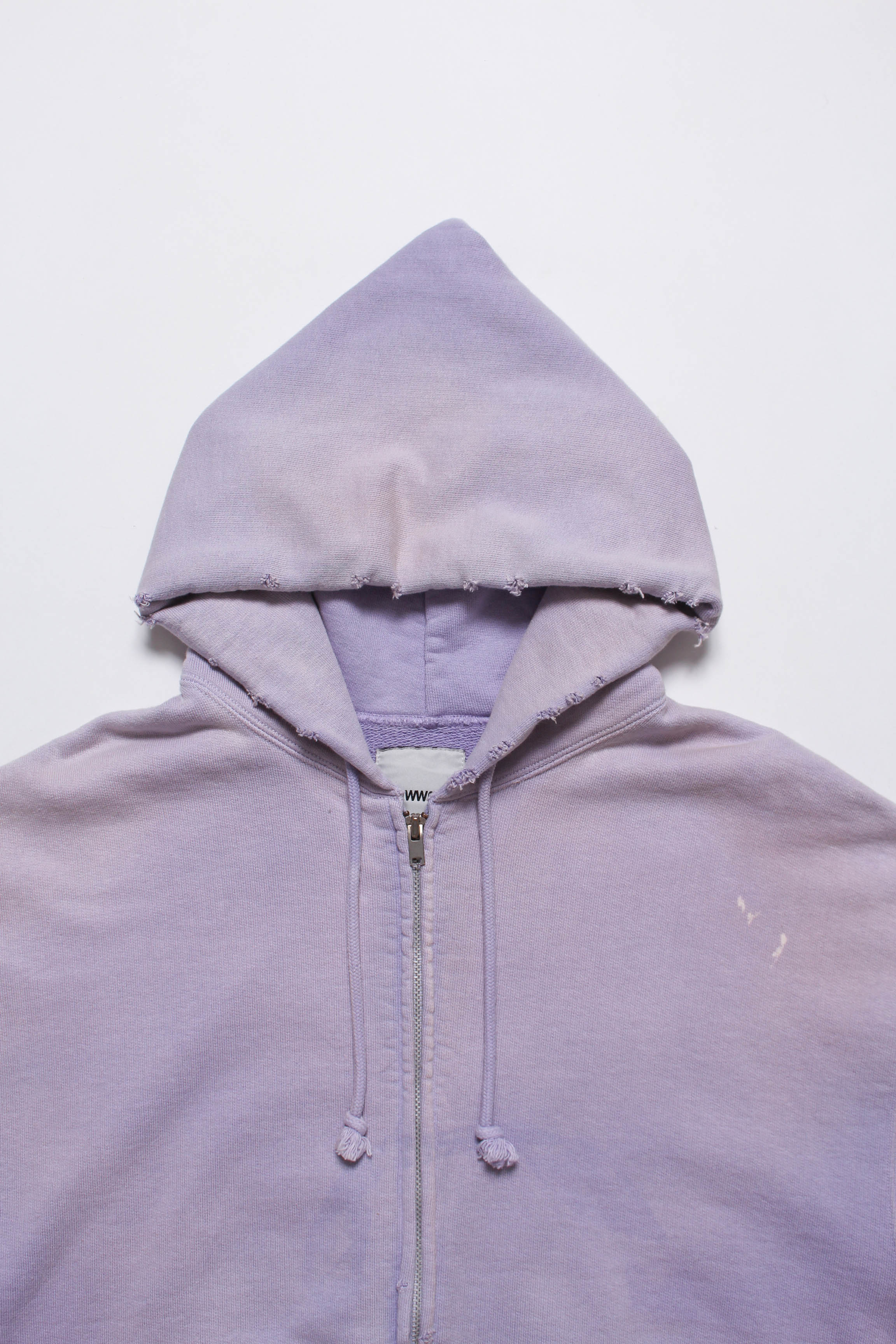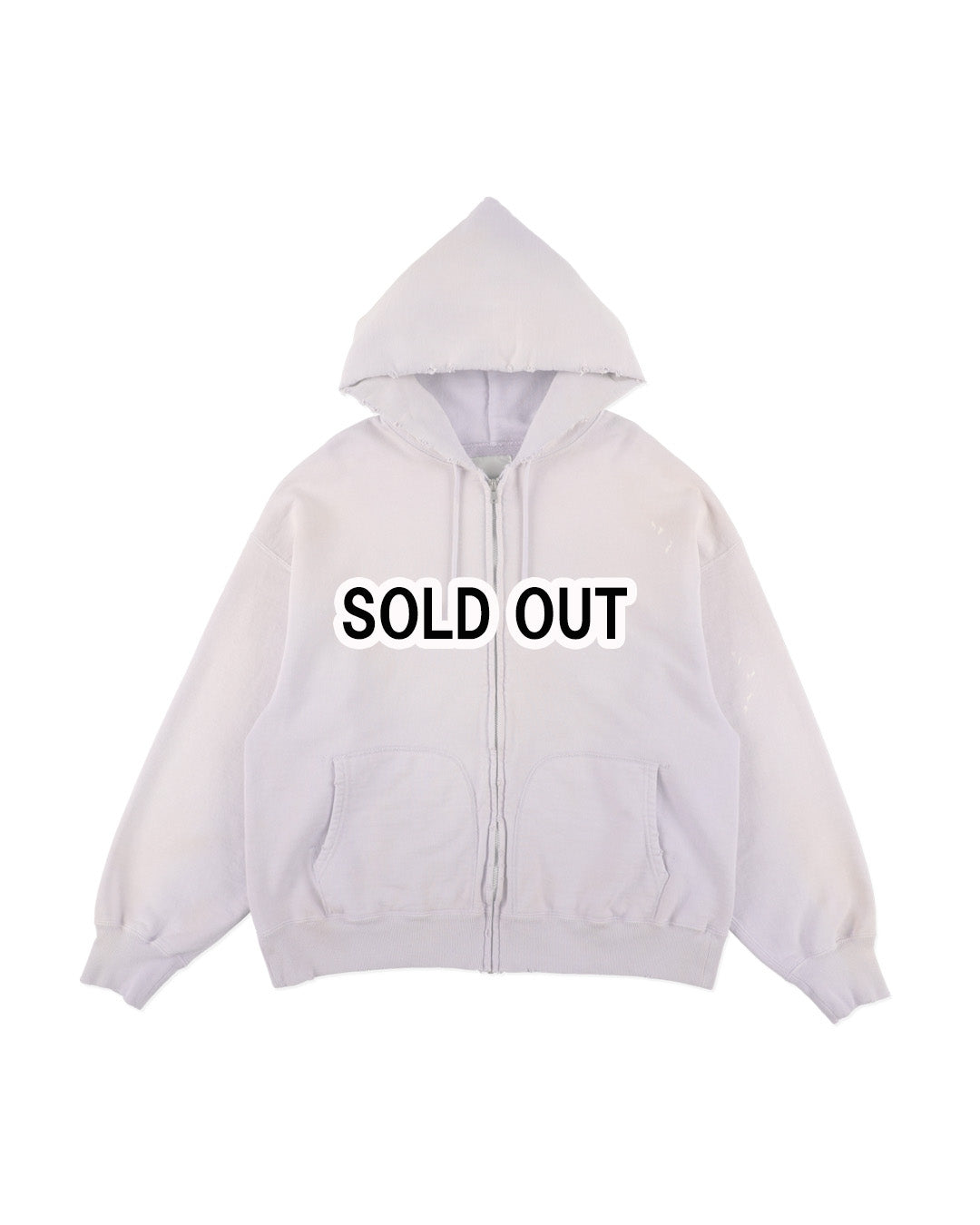Recreates a highly regarded lavender tone seen in 1990s sweatwear, layered with BOW WOW’s realistic aging—fade and uneven color built like repeated wear and washing. Based on a 1950s separate-pocket zip hoodie structure, keeping vintage silhouette and stitch character. Made from heavy, non-brushed French terry with special-machine vintage texture, finished with a rough yet solid presence.