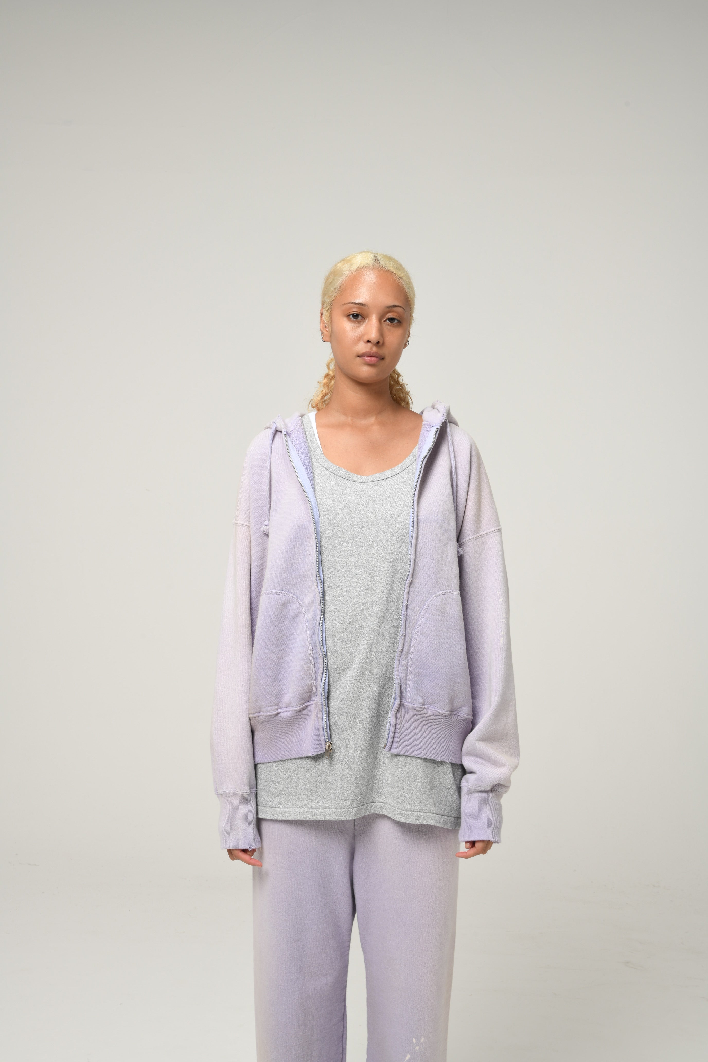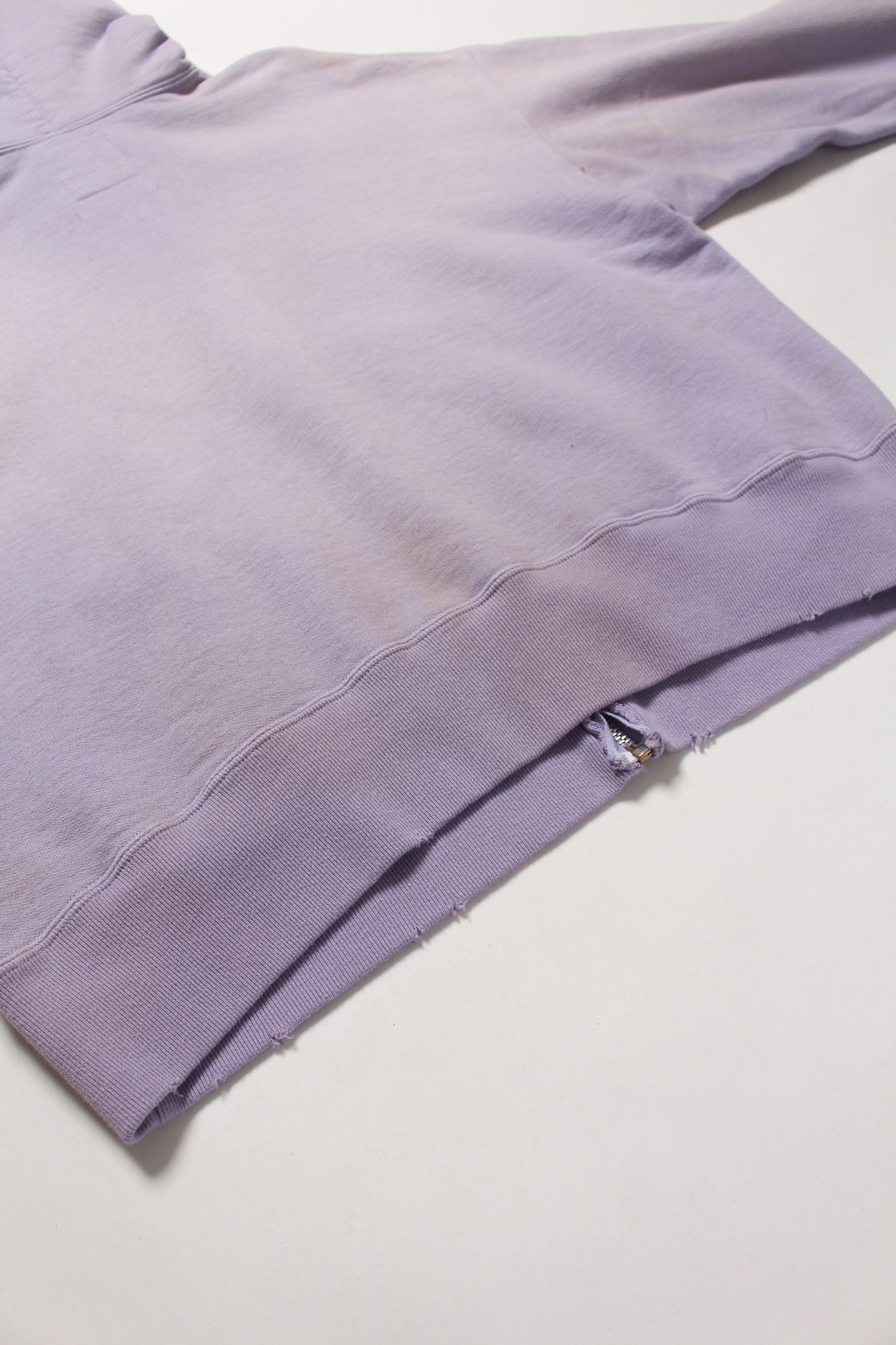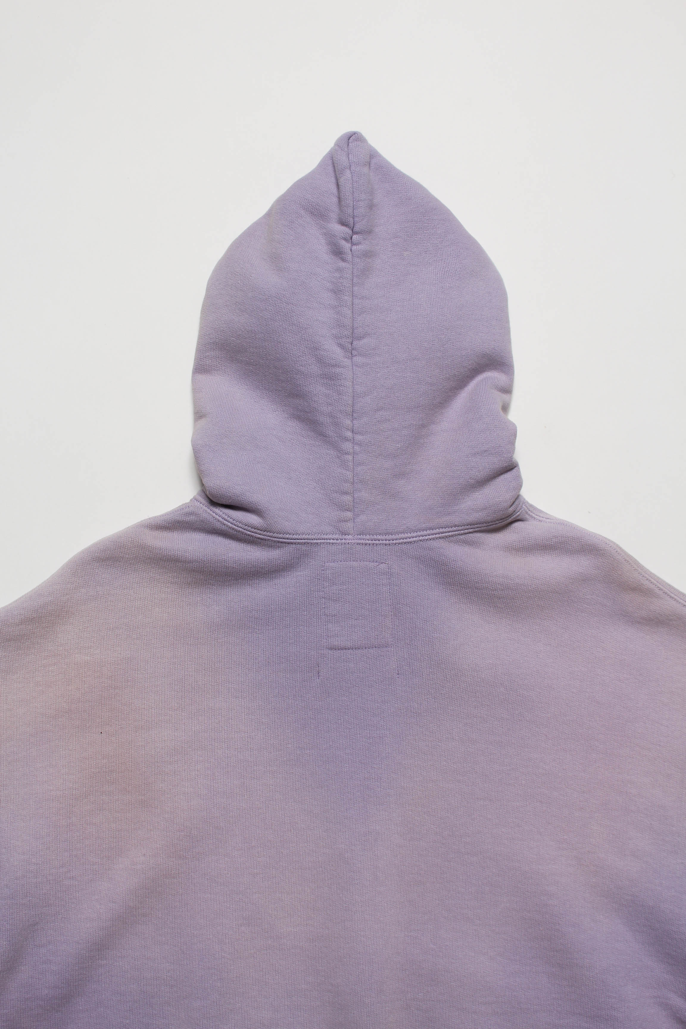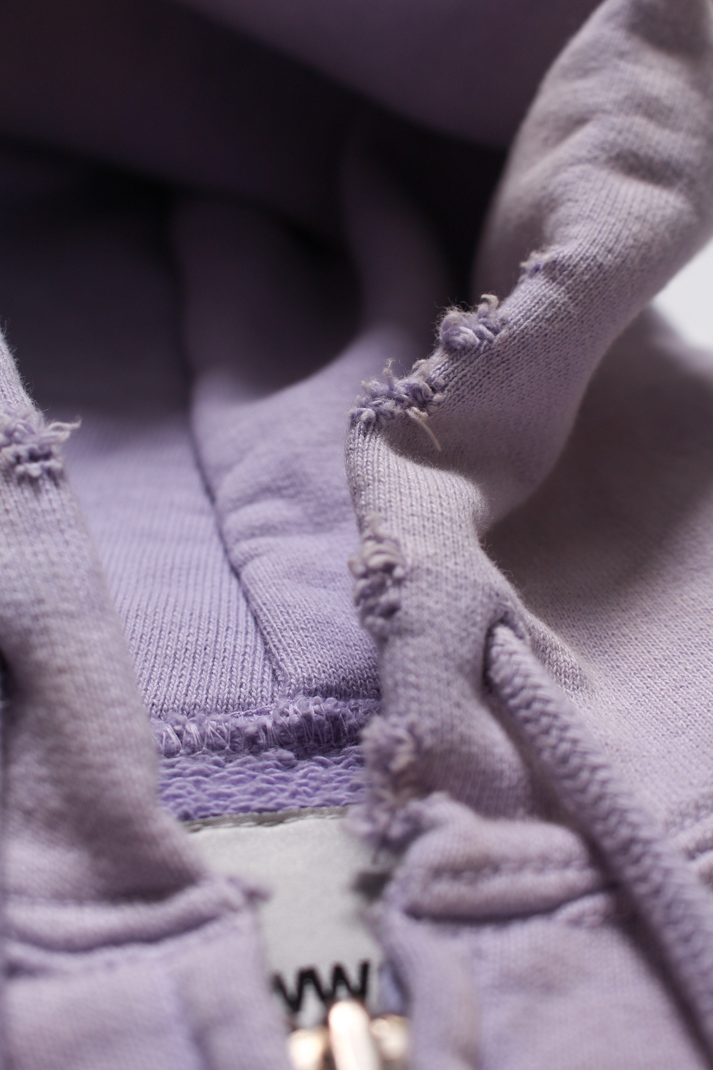 Recreates a highly regarded lavender tone seen in 1990s sweatwear, layered with BOW WOW’s realistic aging—fade and uneven color built like repeated wear and washing. Based on a 1950s separate-pocket zip hoodie structure, keeping vintage silhouette and stitch character. Made from heavy, non-brushed French terry with special-machine vintage texture, finished with a rough yet solid presence.