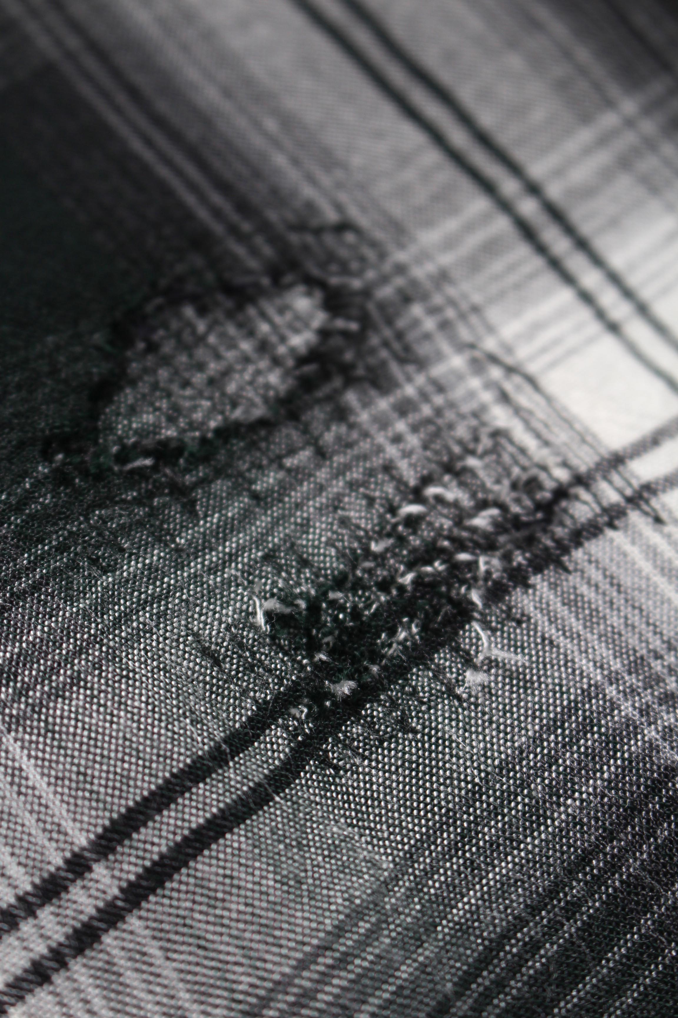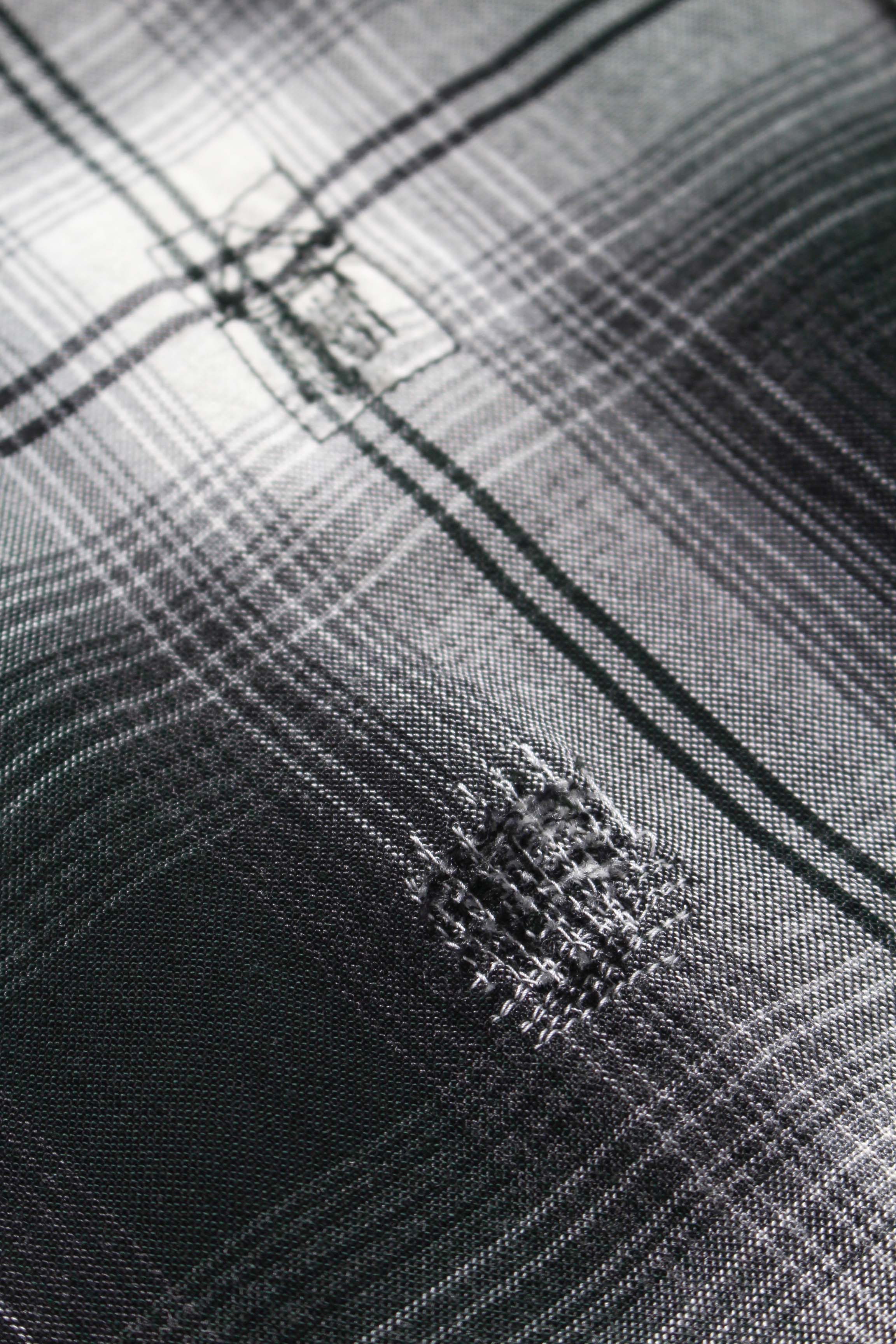 Inspired by a deep-green 1940s rayon plaid shirt, carrying the unmistakable presence of an earlier era. Fine pleats and a slightly larger, spread collar echo period-correct detailing. Imagined as a piece worn to the point of fraying and carefully kept through repeated repairs, with mending traces and aged expression rendered with realism.