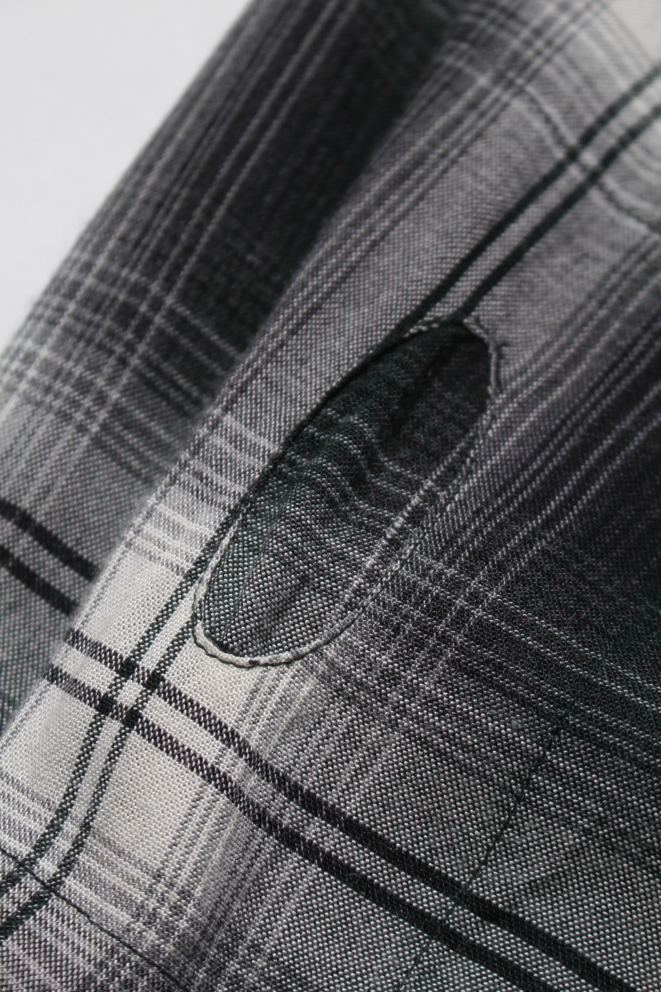 1940年代の深緑をベースとしたチェックレーヨンシャツを背景に、古い時代特有の佇まいを色濃く残した一着。所々に見られる細かなプリーツや、やや大きい広がった衿の形状などから、一段古い時代の趣を感じさせるディティールを踏襲している。 擦り切れるまで着込まれ、リペアを重ねながら大切に着続けられてきた様子をイメージし、補修痕や経年の表情まで含めてリアルに表現している。