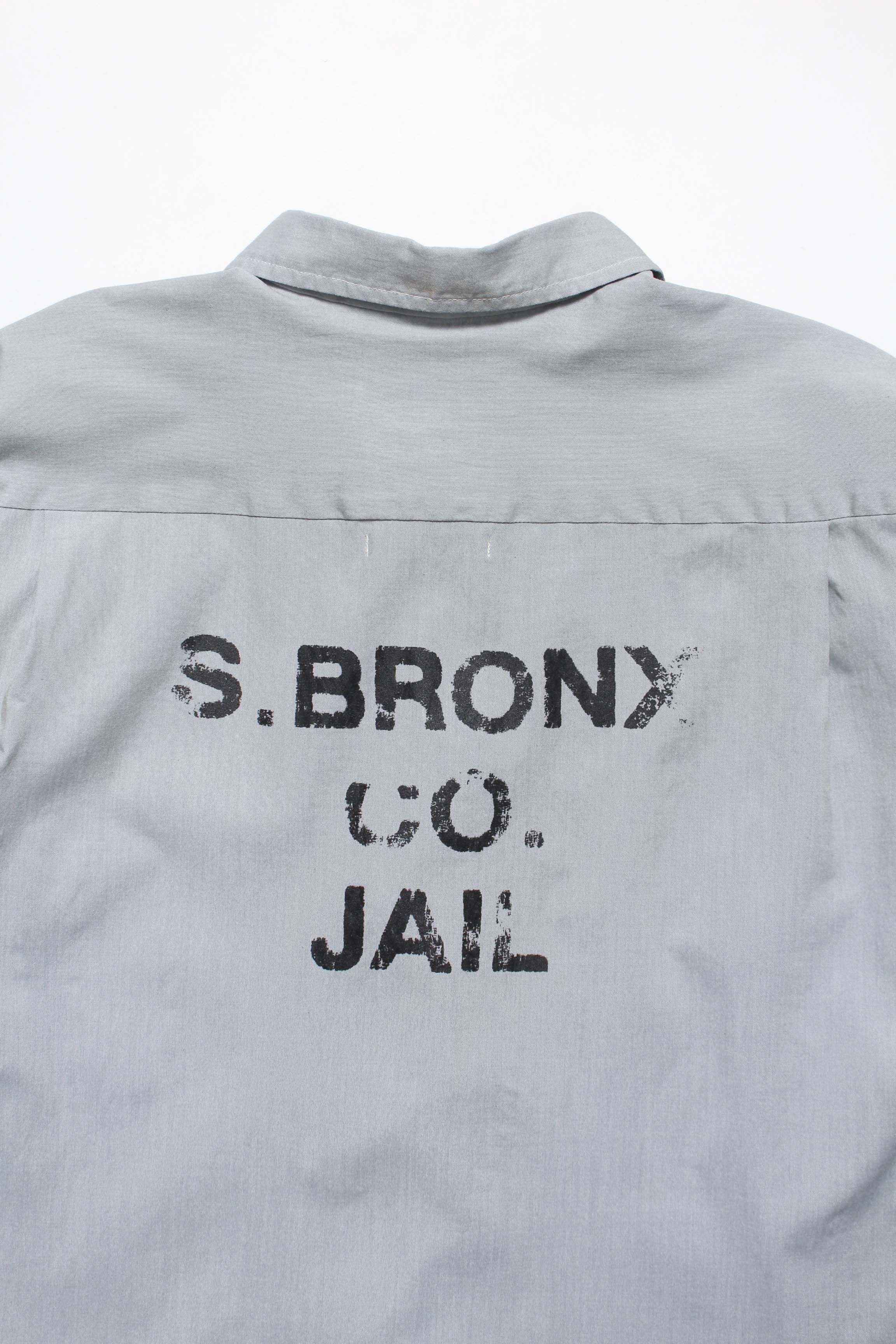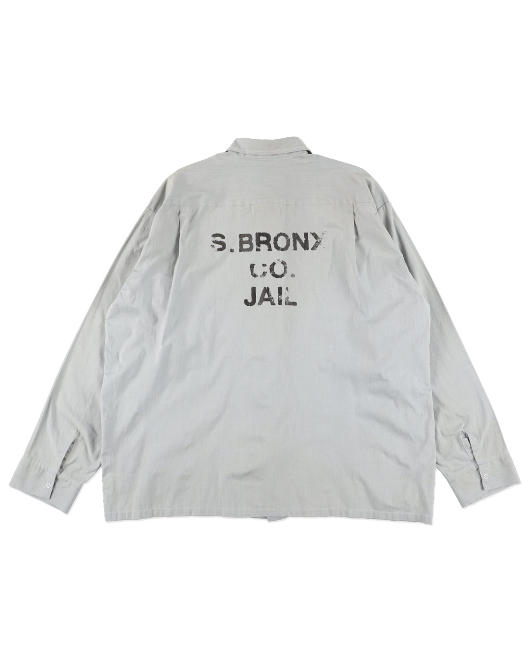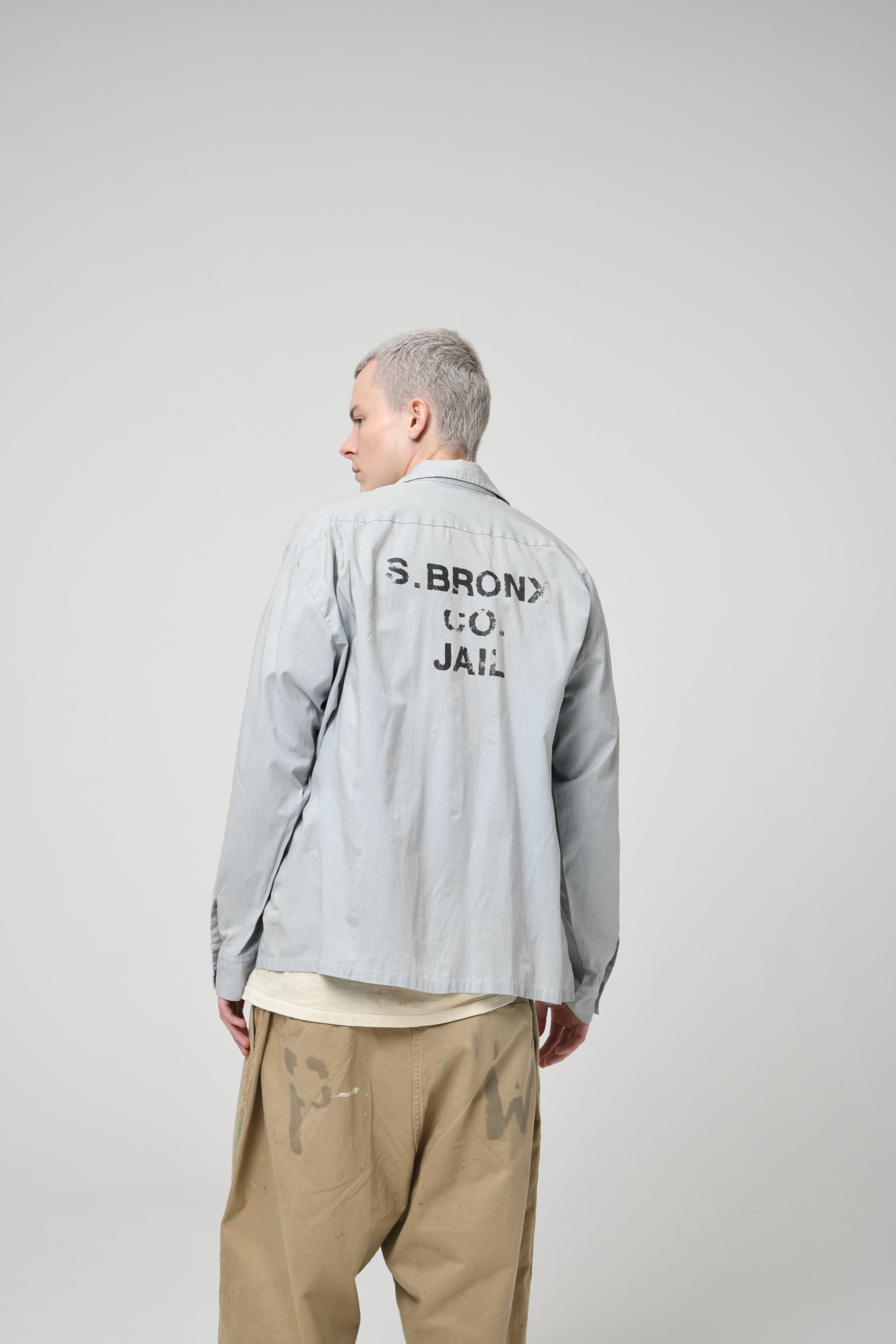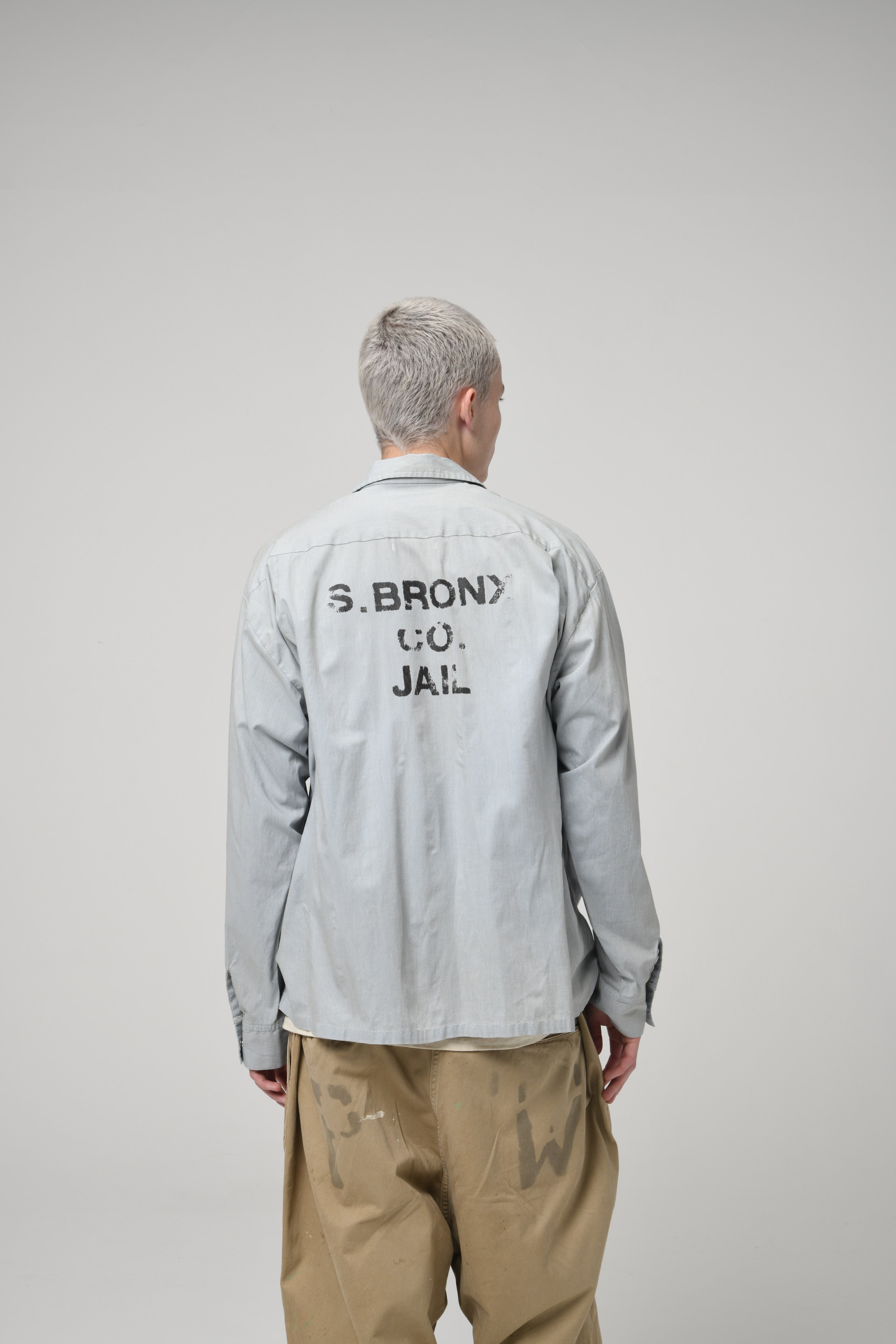 A prisoner shirt concept based on the fictional “S.BRONX CO JAIL,” built with the realistic presence of 1960s prisoner shirts. Constructed with a simple, inorganic feel intended for institutional use. Prisoner shirts were often discarded after service, making true vintage examples rare; surviving pieces tend to have strong atmosphere and value. Aging is applied to create the realism of long-term use within that context.