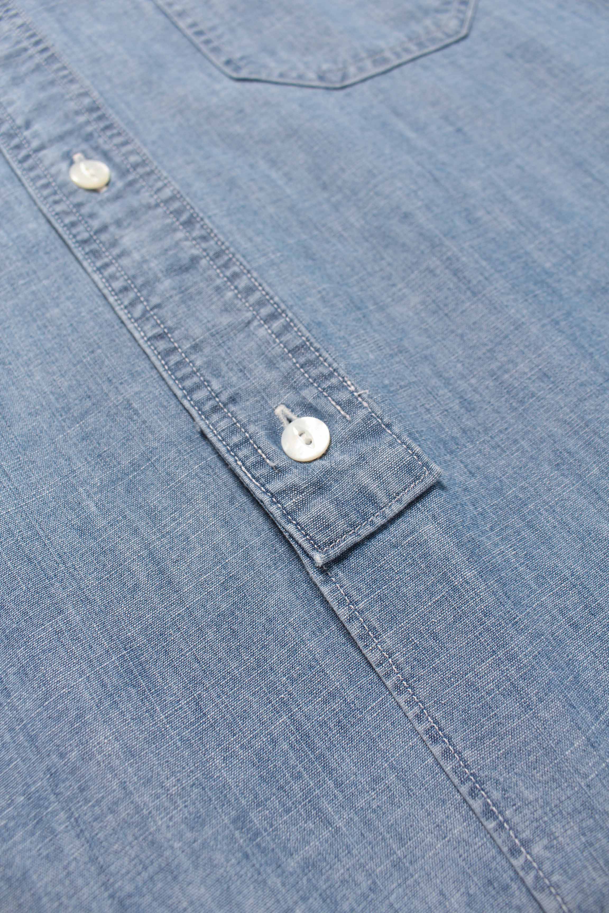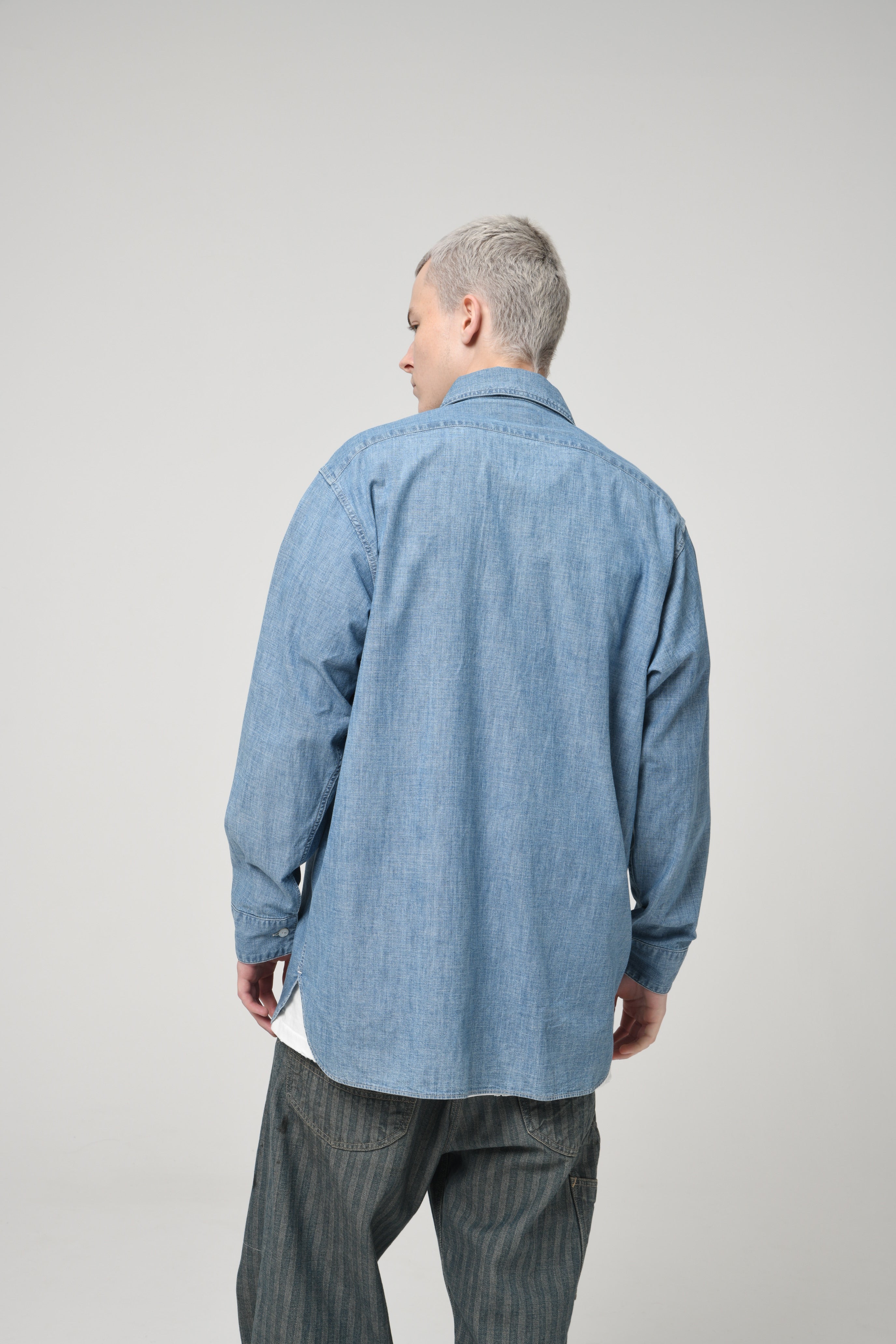 A chambray shirt built from exceptionally old pre-1930s details, keeping the naïve roughness of early work shirts in sewing and structure. Aging is intentionally restrained, recreating the natural look of a shirt worn and washed over time. Simple, honest wear becomes the core appeal.