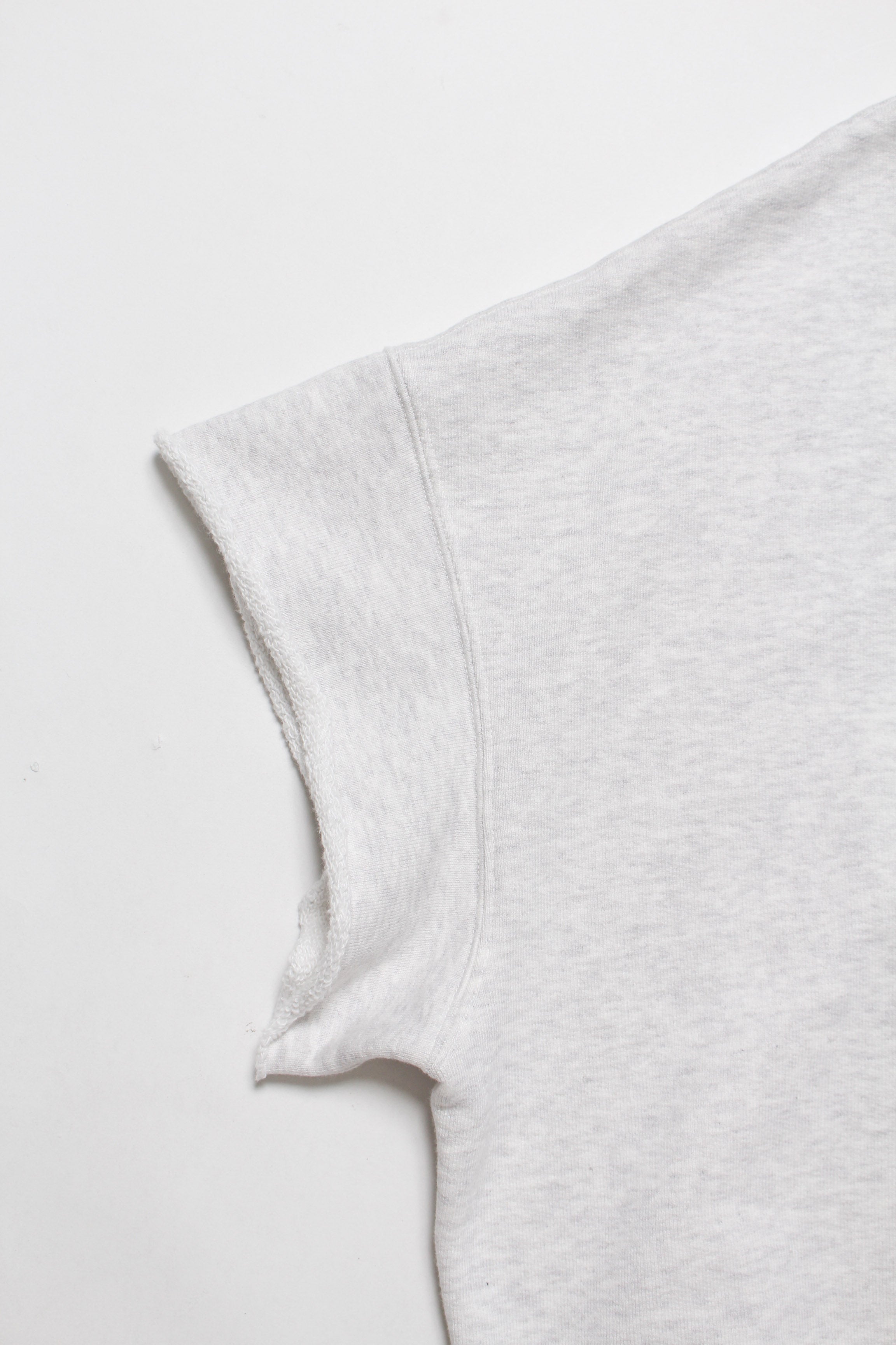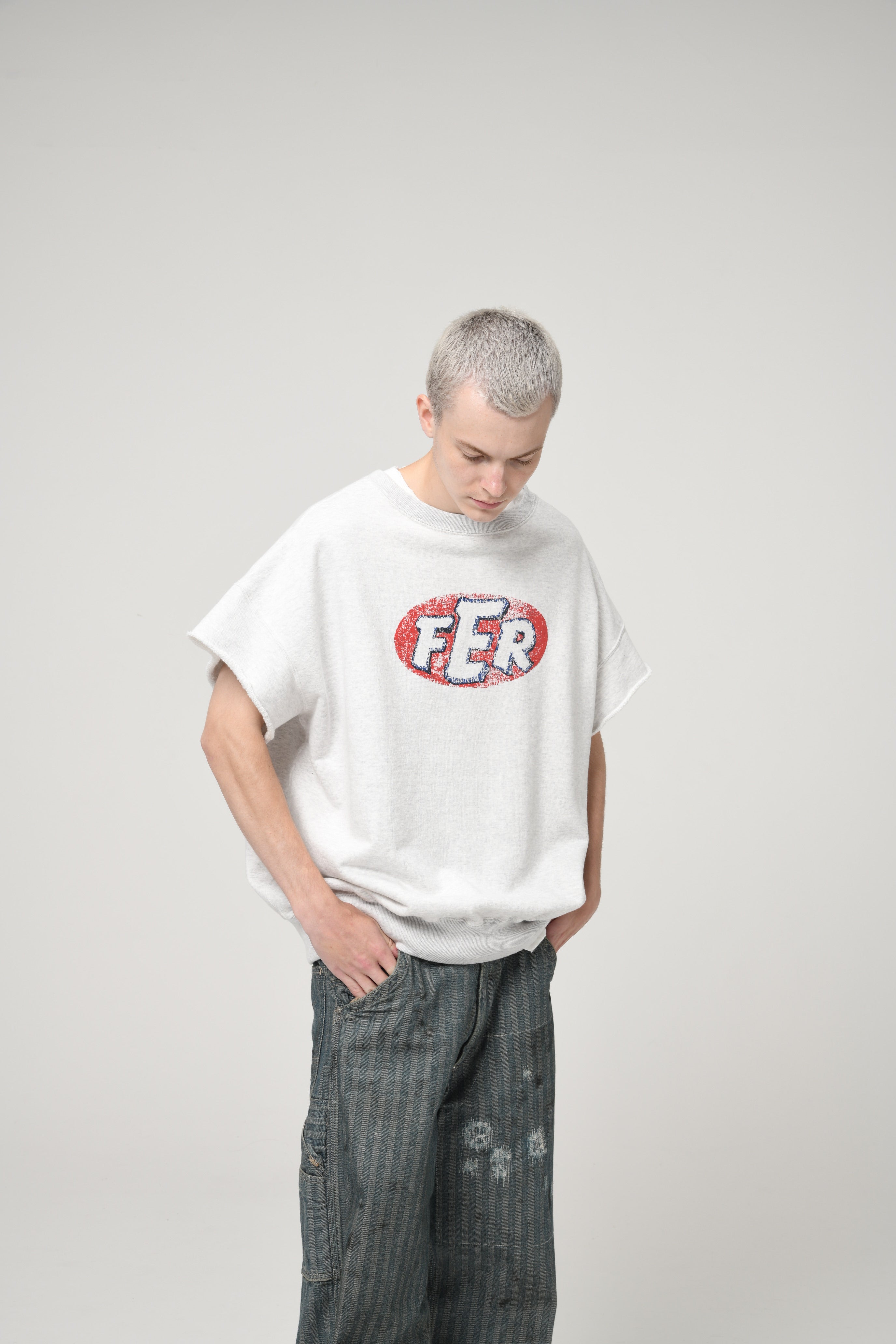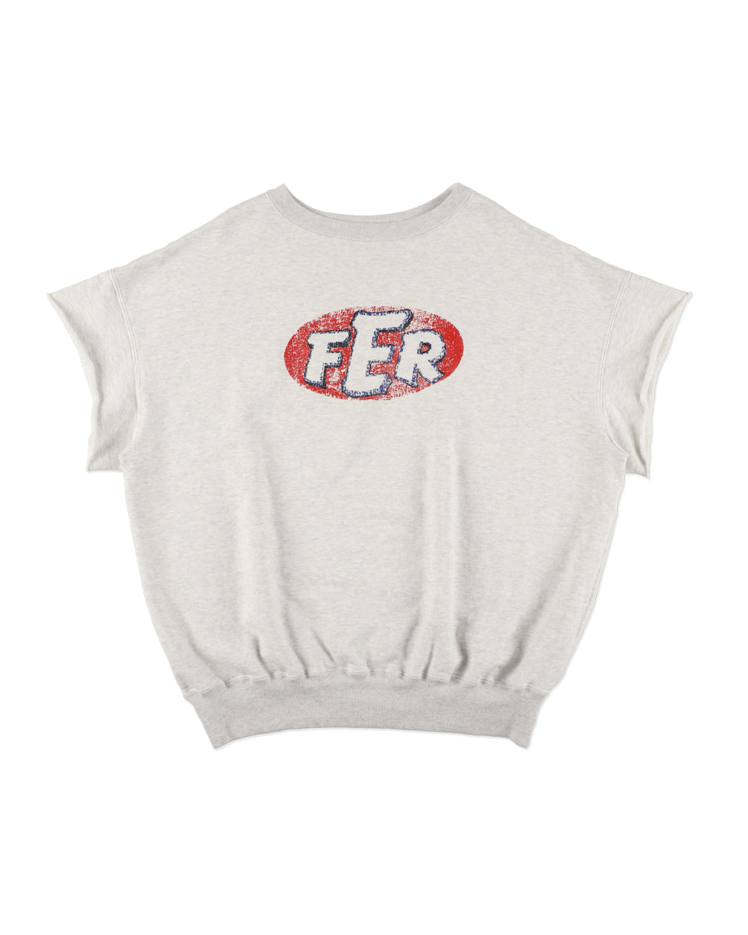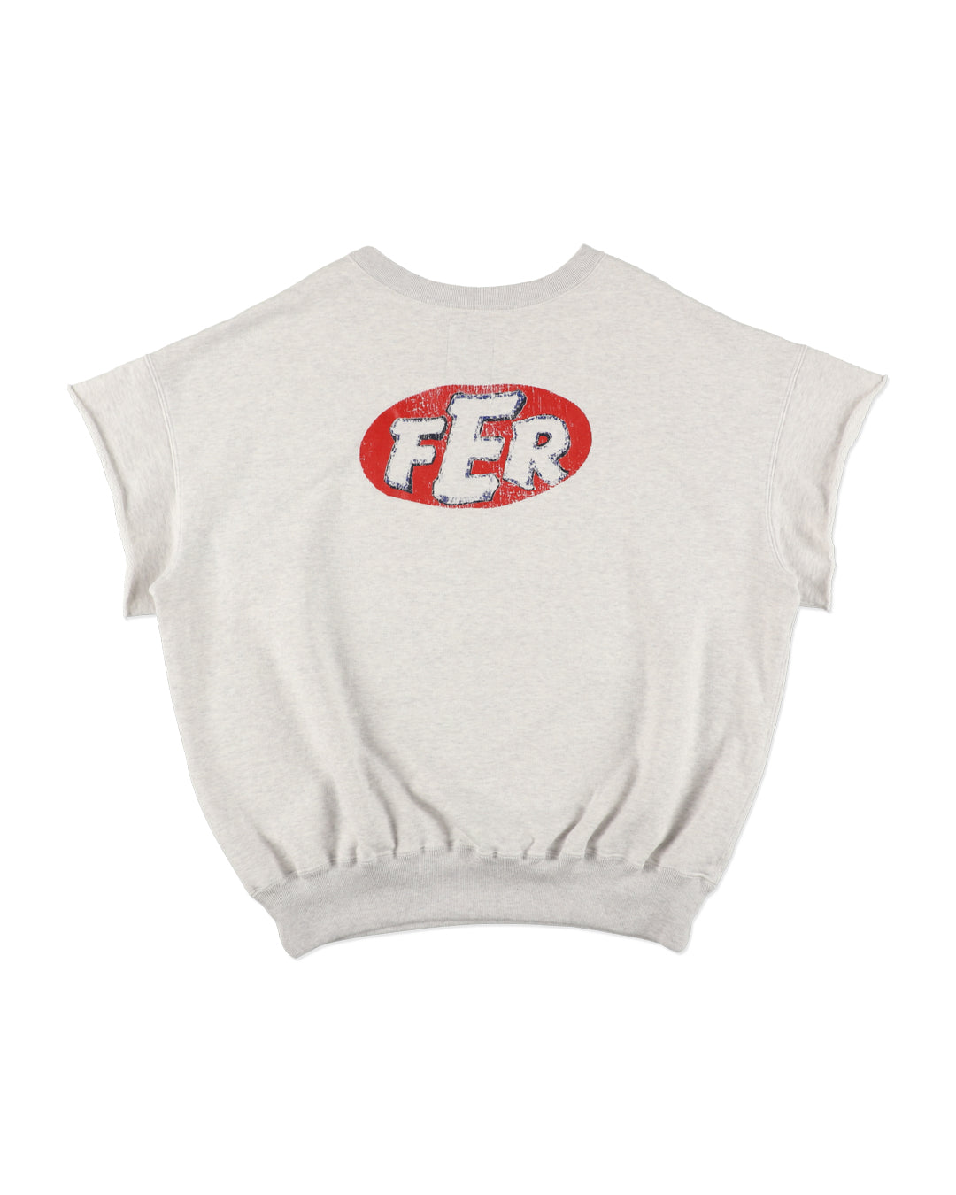 A short-sleeve sweatshirt featuring a motor-industry graphic, adding an industrial, powerful mood. Designed with the stance of a garage uniform, emphasizing rugged, practical presence. The print expresses aging down to peeling and abrasion, recreating the realism of a uniform worn for years. Inspired by 1950s–60s cut-off sweatshirts, made with heavyweight, non-brushed French terry to preserve old-era texture and practicality.