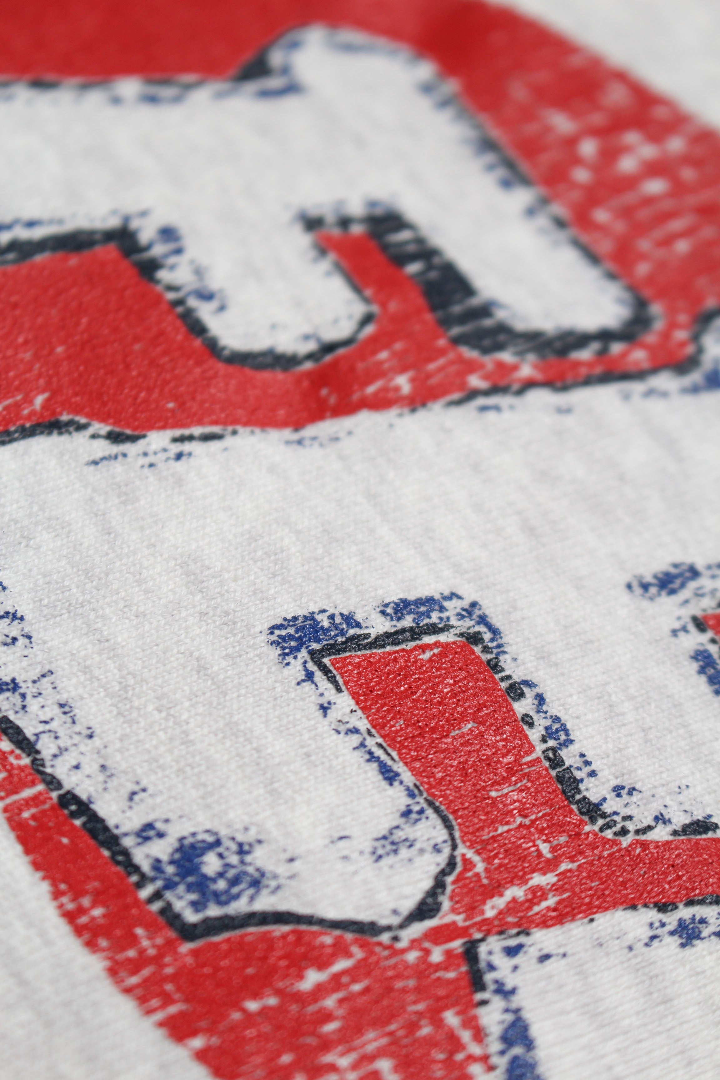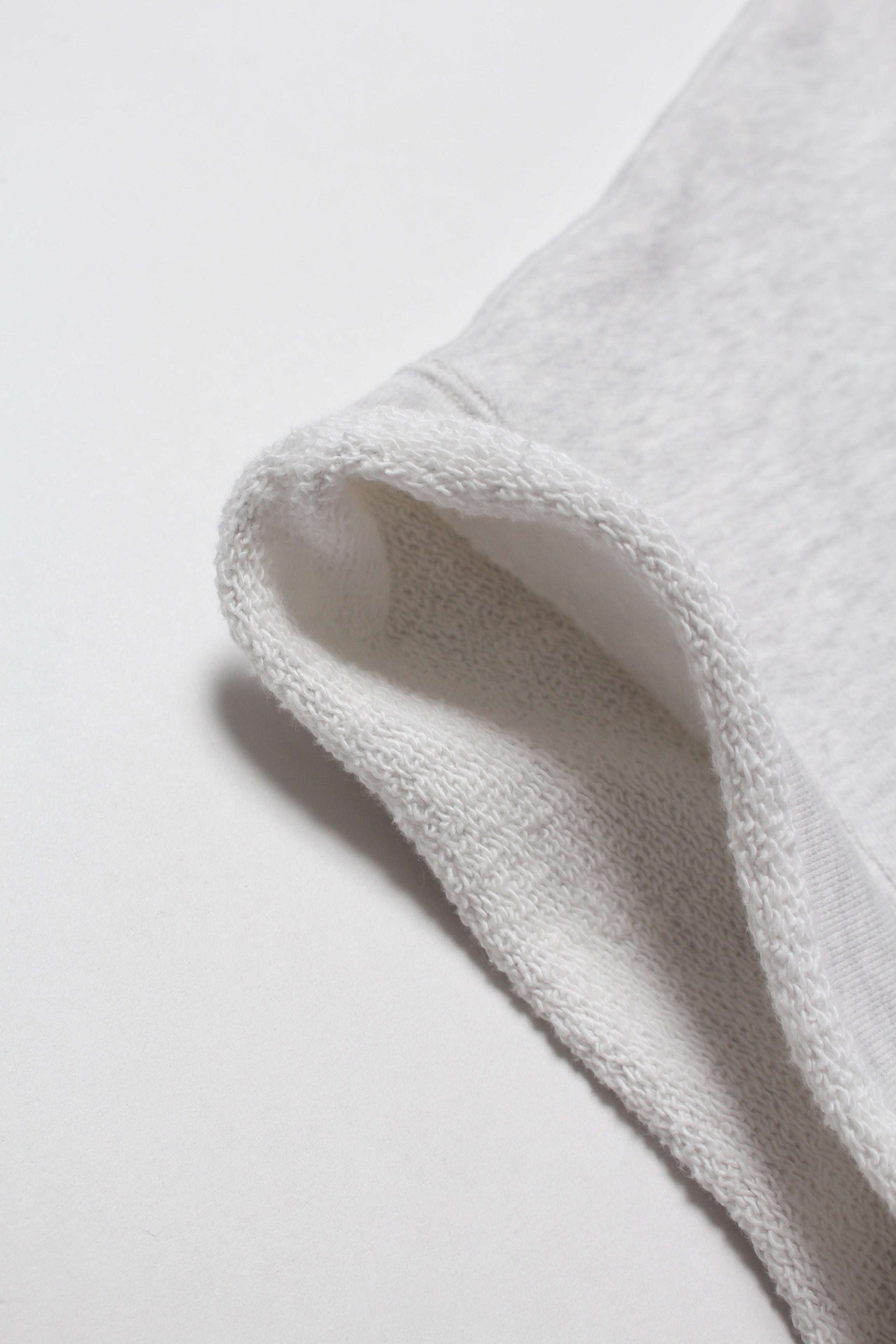モーター関連メーカーをイメージしたグラフィックを配し、工業的で力強いムードを加えた半袖スウェット。ガレージユニフォームのような佇まいを意識し、無骨で実用的な空気感を前面に出している。 プリントは経年による剥がれや掠れまで踏み込んで表現し、長年着込まれてきたユニフォームのようなリアリティを再現。 1950〜60年代のカットオフスウェットを背景にしたデザインで、起毛無しの厚地裏毛を使用し、古い時代の質感と実用性をそのまま残している。