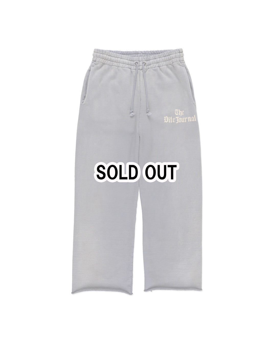 Sweatpants featuring a "THE DITC JOURNAL" print in a set-up style. They naturally carry the worn-in feel of a newspaper office right down to the hem. Made from a thick, unbrushed fleece suitable for all seasons, the finish utilizes the vintage texture produced by a special knitting machine. It retains a core of character within its roughness. Designed with a deep rise and a silhouette inspired by slacks, achieving a balance that avoids looking sloppy despite being sweatpants. The raw-cut hem deliberately retains an unfinished, rough feel, expressing the unique atmosphere and slight discomfort characteristic of vintage sweats.