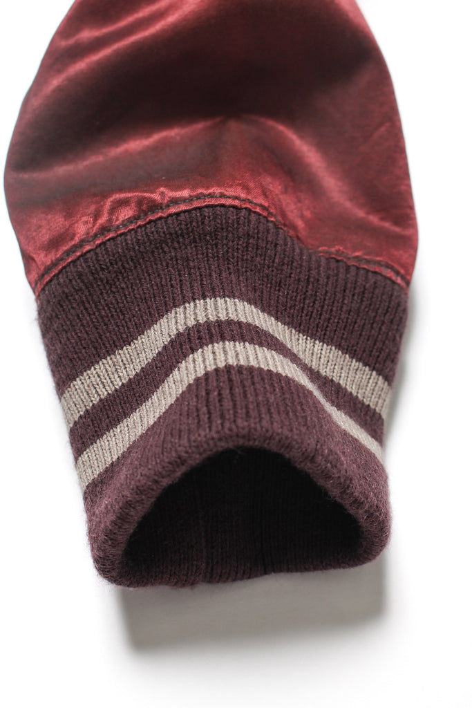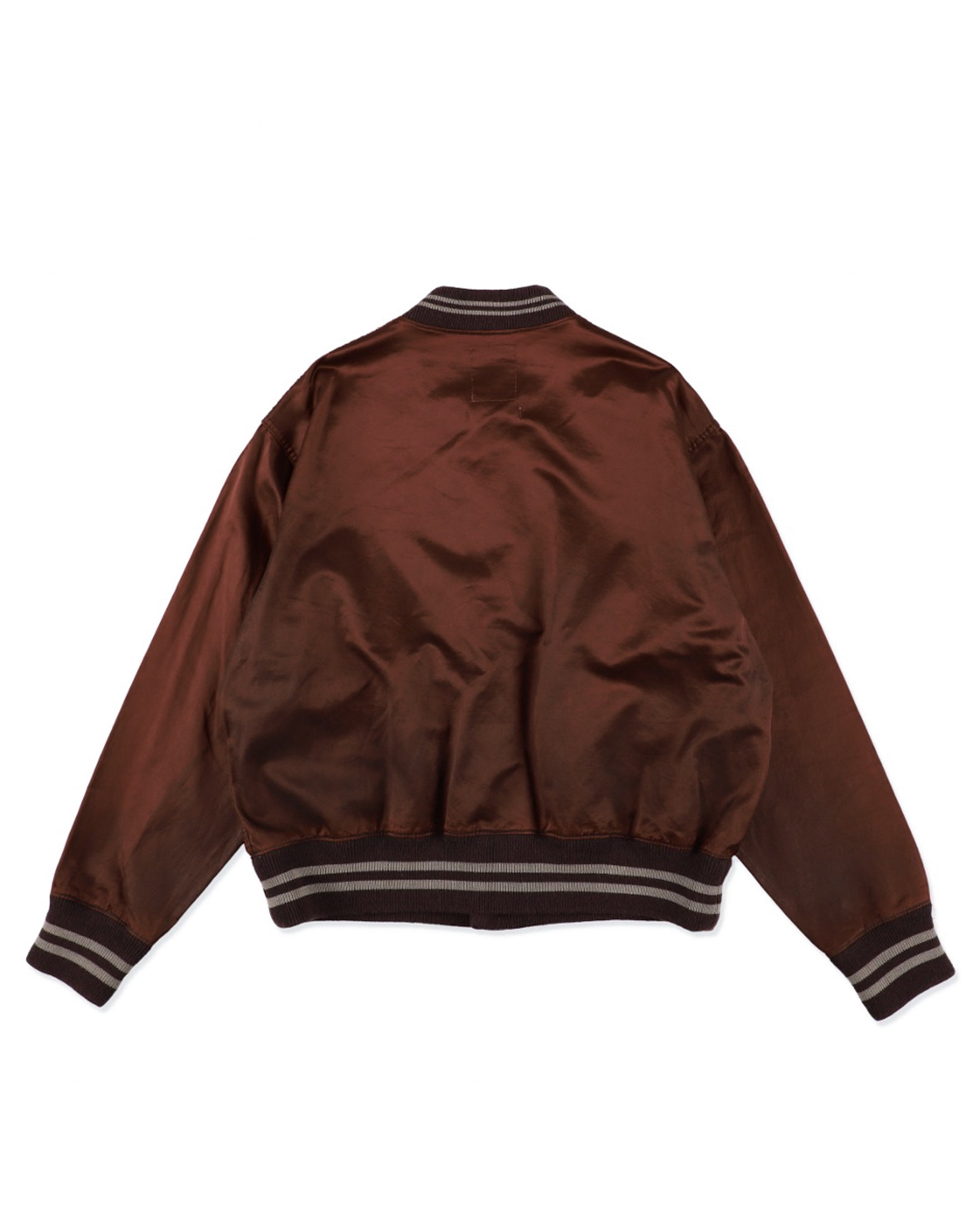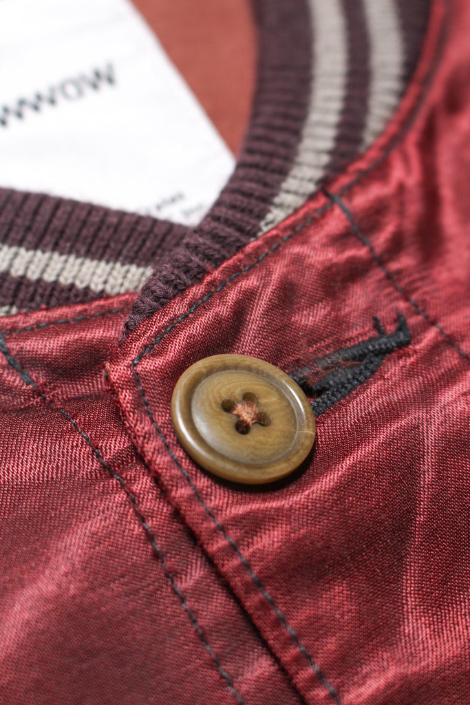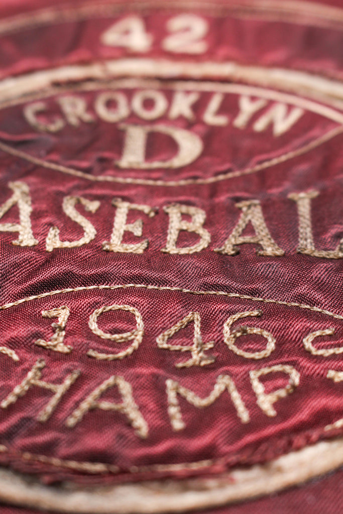A reconstruction of CROOKLYN D's fictional champion jacket. The "42" on the chest is a tribute to Jackie Robinson, and the "1946 CHAMPS" patch represents a milestone in the team's history. The satin shell fades, puckers, and stains are all the result of aging, bringing a piece of clothing from your memory into the present.