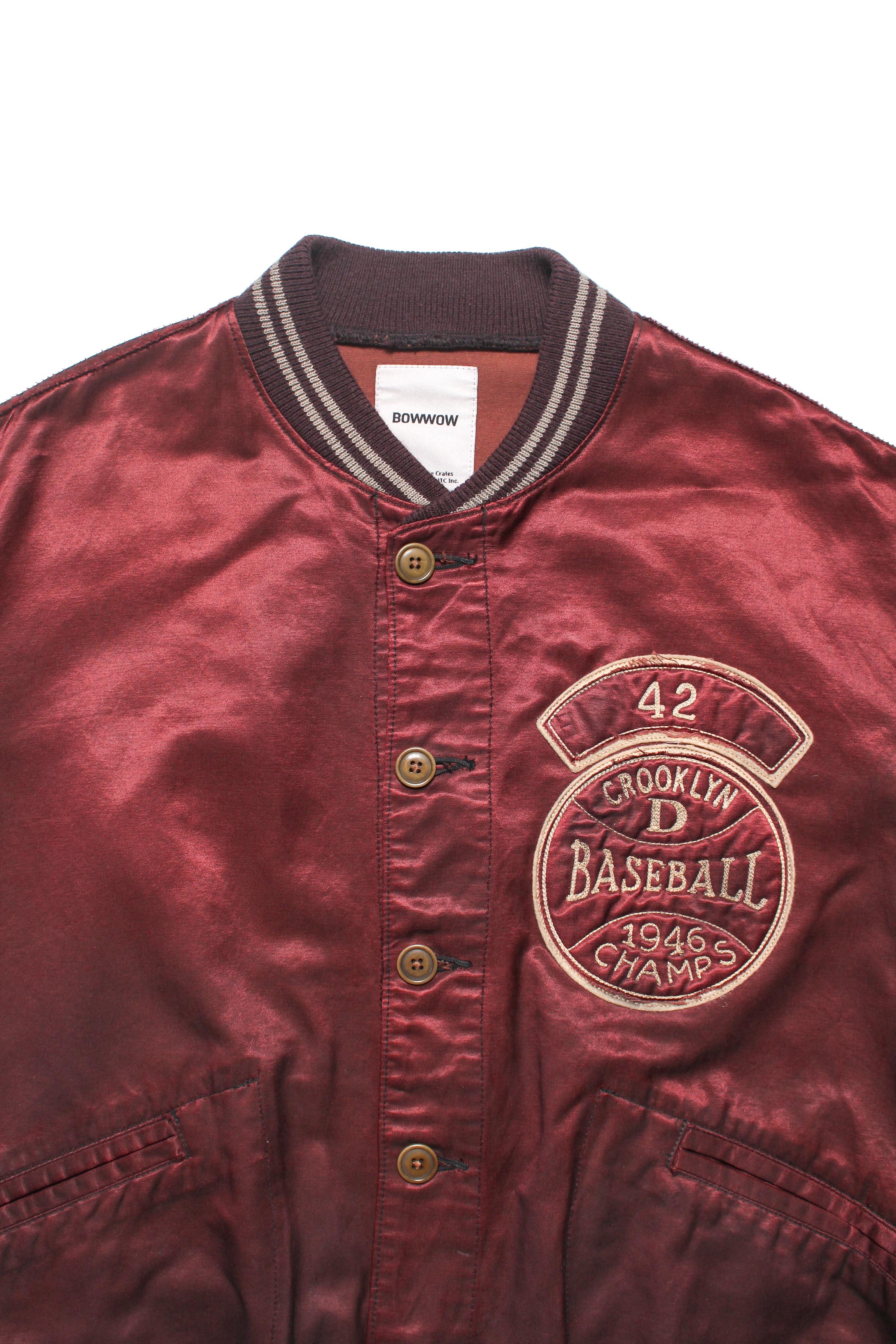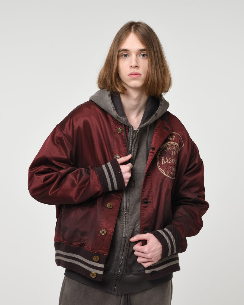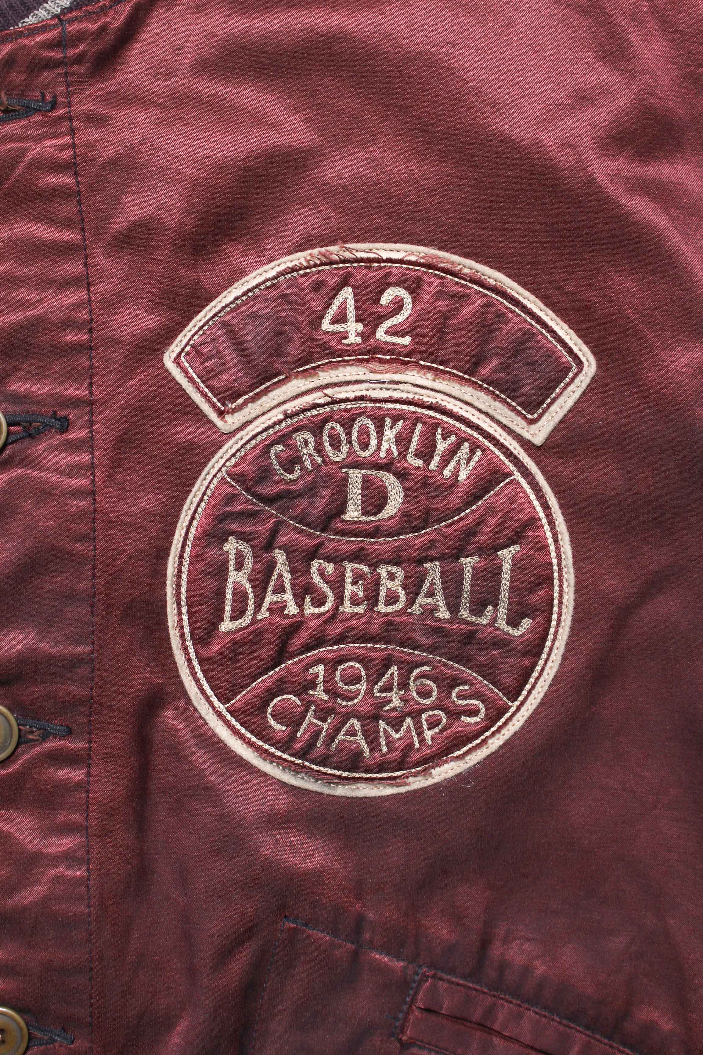 Reconstructed CROOKLYN D's fictional championship jacket. the "42" embroidered on the chest pays tribute to Jackie The "42" embroidered on the chest pays tribute to Jackie Robinson, while the "1946 CHAMPS" patch commemorates a pivotal moment in team history. The aging process meticulously recreates the faded satin shell, puckering, and worn-in look, bringing that memory-filled piece into the present.