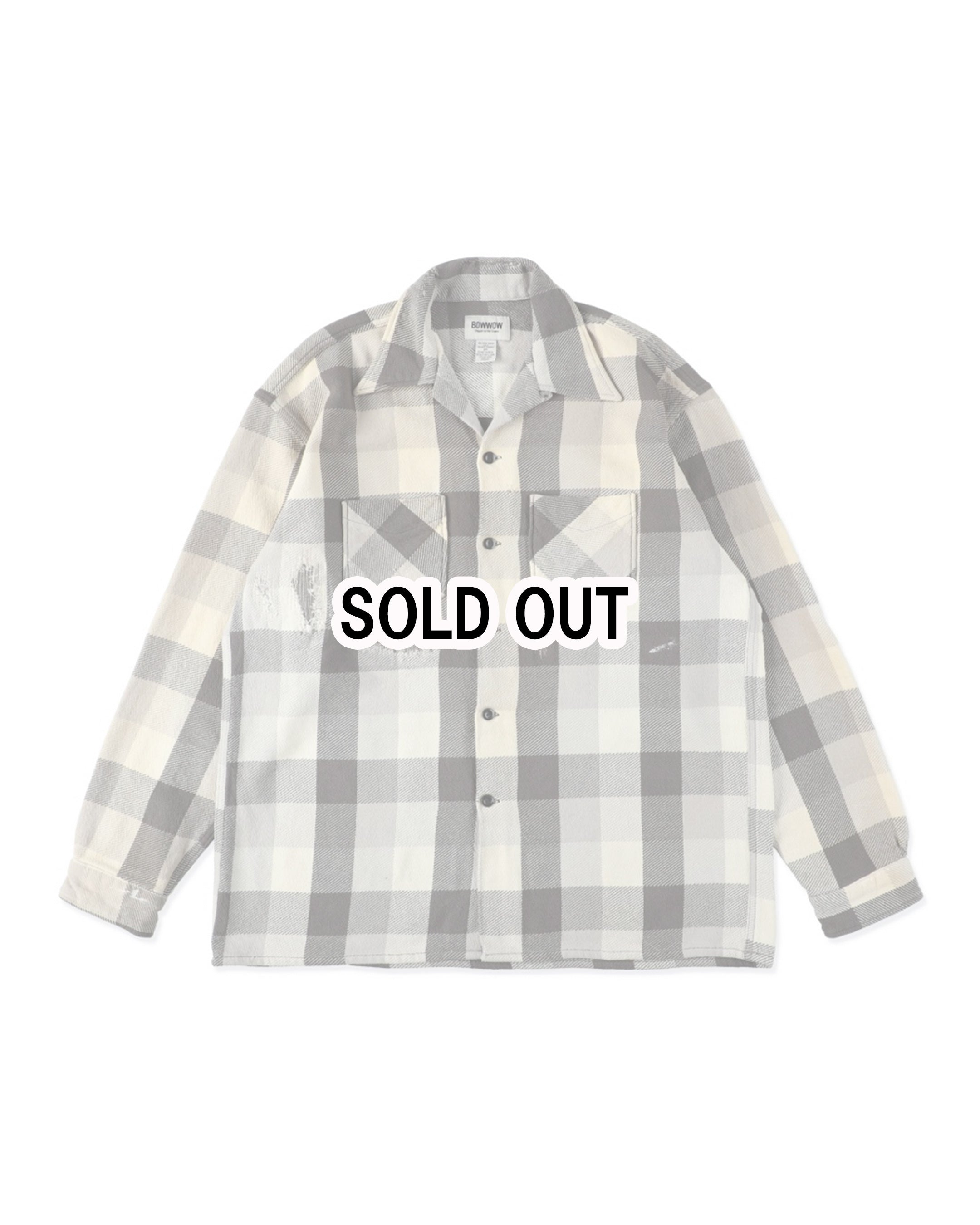 This is a thick checkered nerl open-collared shirt produced only by a limited number of famous work brands in the 1940s and 1950s. This shirt was useful as warm clothes in severe environments such as logging sites in cold regions, railroad work, and outdoor use, and its durability and warmth retention as well as the brand's unique details spoke of its pride. This work reproduces the heavy check flannel unique to that era in a gray and white color scheme. The stitching work on the shoulders and sleeves, pocket shape, and other details follow the design of the period, but have been updated for a modern fit. The worn-in, repaired, and processed look and feel gives it a distinctly vintage look.
