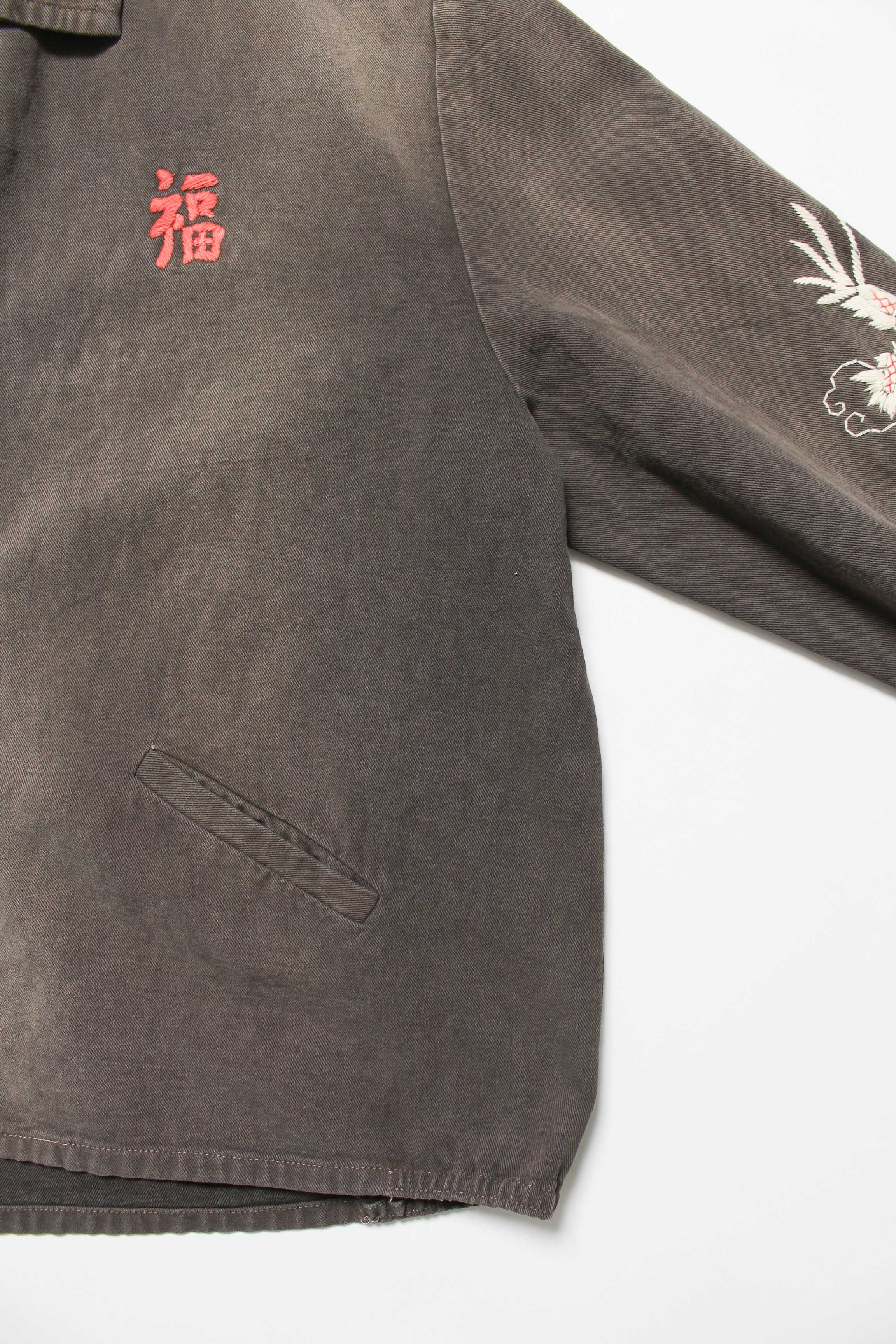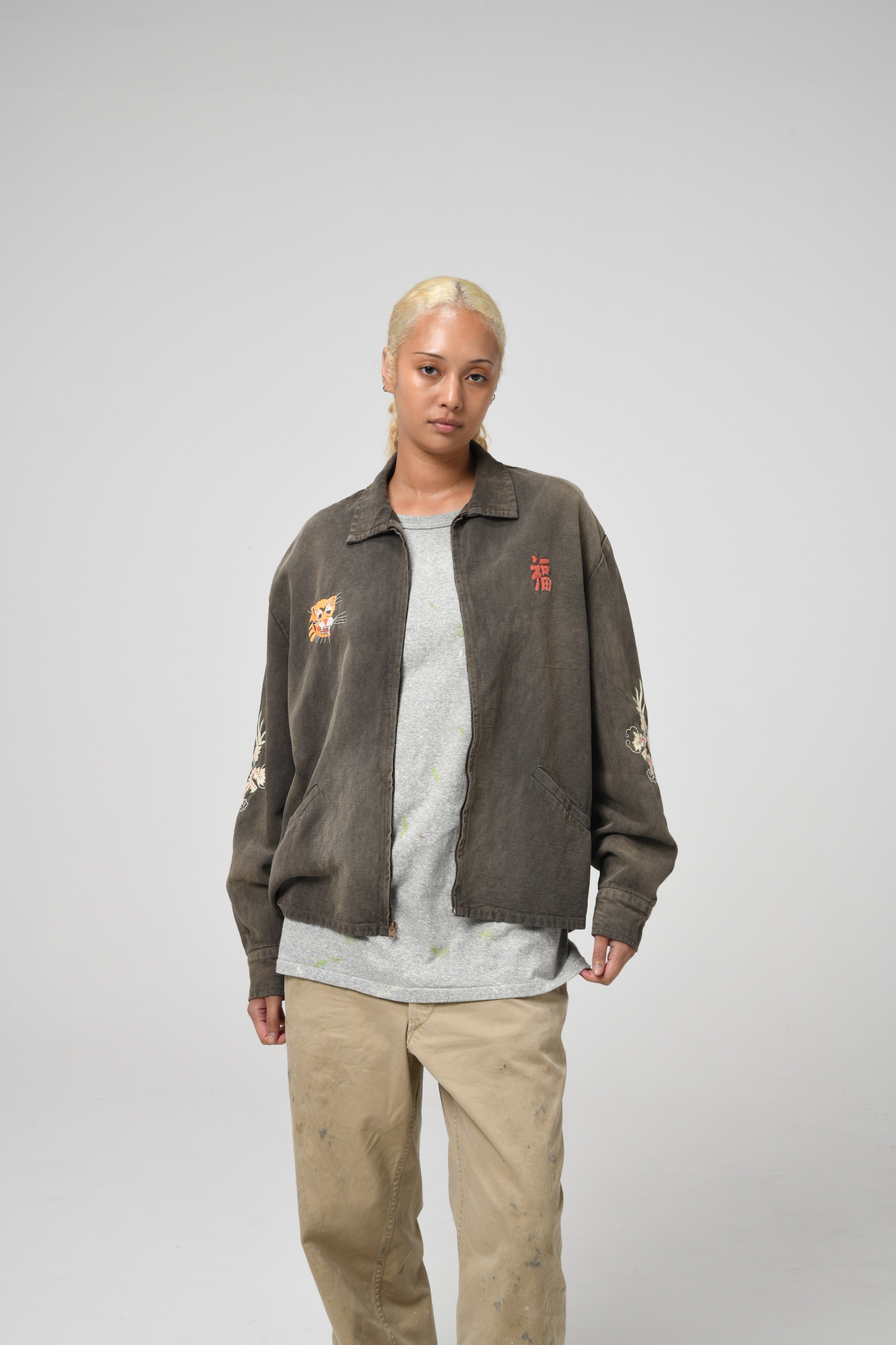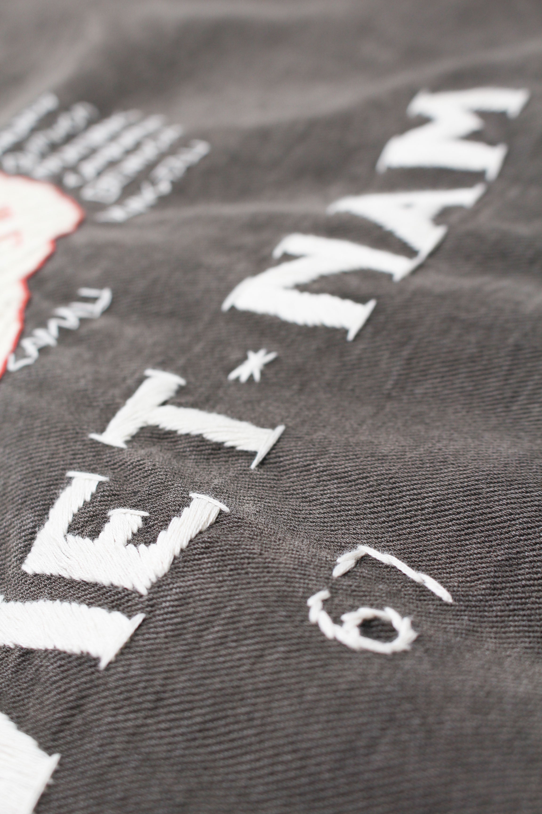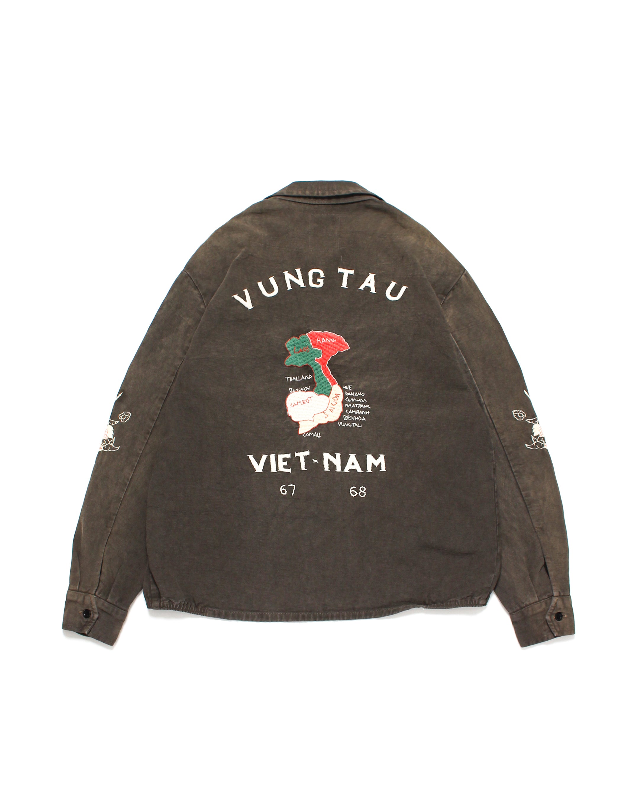 This piece is a reimagined version inspired by the so-called "Viet-Jacket," ordered as souvenirs by U.S. soldiers deployed to the Vietnam War from the late 1960s to early 1970s. The Viet-Jacket was not officially issued by the U.S. military; it was made locally by tailors as personal items. The embroidery on these jackets carries memories of units, places, and the emotions of that time. Rather than being worn in combat, they were typically worn during off-duty hours on base, when going out, or upon returning home. After their practical use ended, they became cherished as symbols of defiance. BOW WOW, drawing on this history, elevates the product by adding the expression of aged patina characteristic of a well-worn souvenir jacket imbued with culture and emotion.