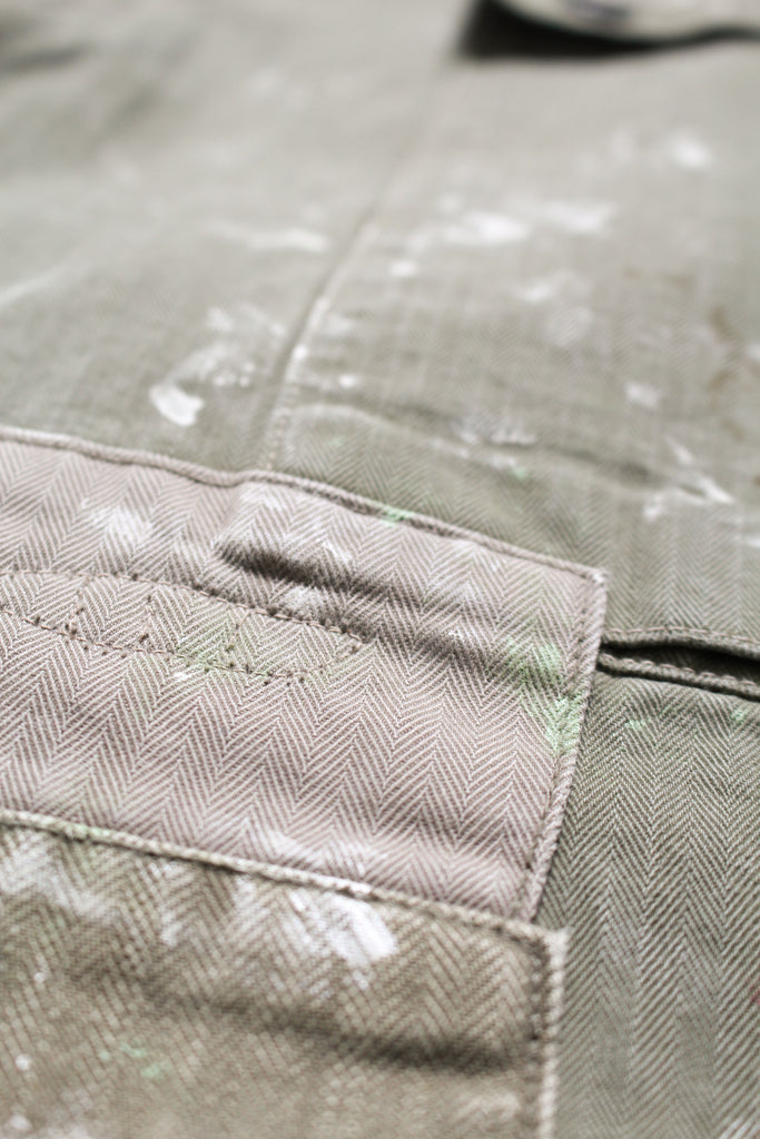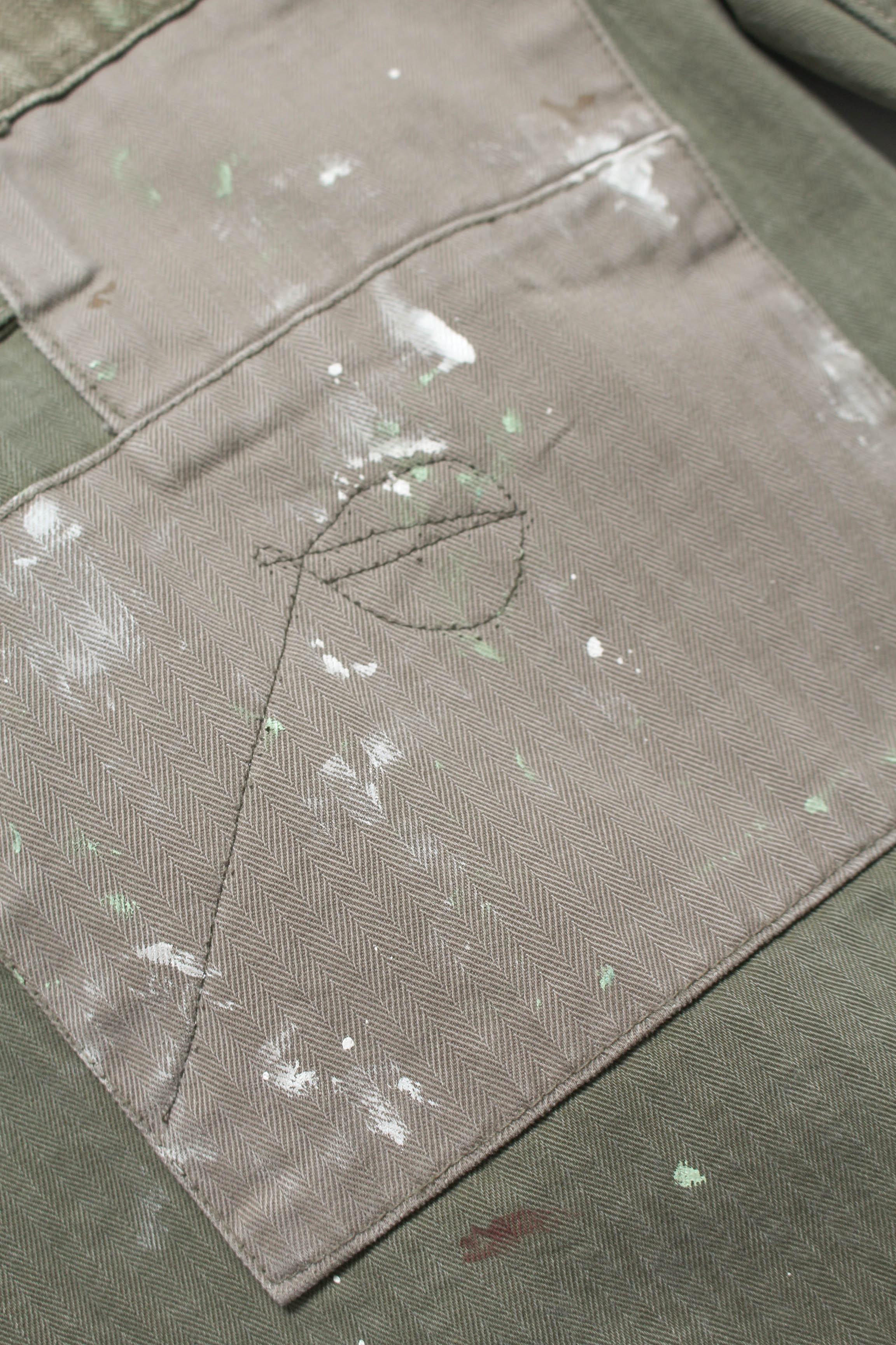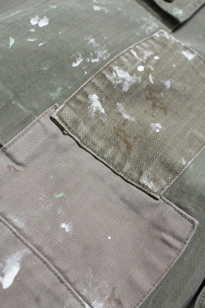 This piece captures the "battlefield atmosphere" through processing This piece captures the "battlefield atmosphere" through processing that reproduces the hand-painted camouflage used by US Army Green Berets in the field, including paint application, ink unevenness, and color fading, and further enhances it with worn-in fading, and further enhances it with worn-in fits. and further enhances it with worn-in fading, abrasion, and stitching puckering.