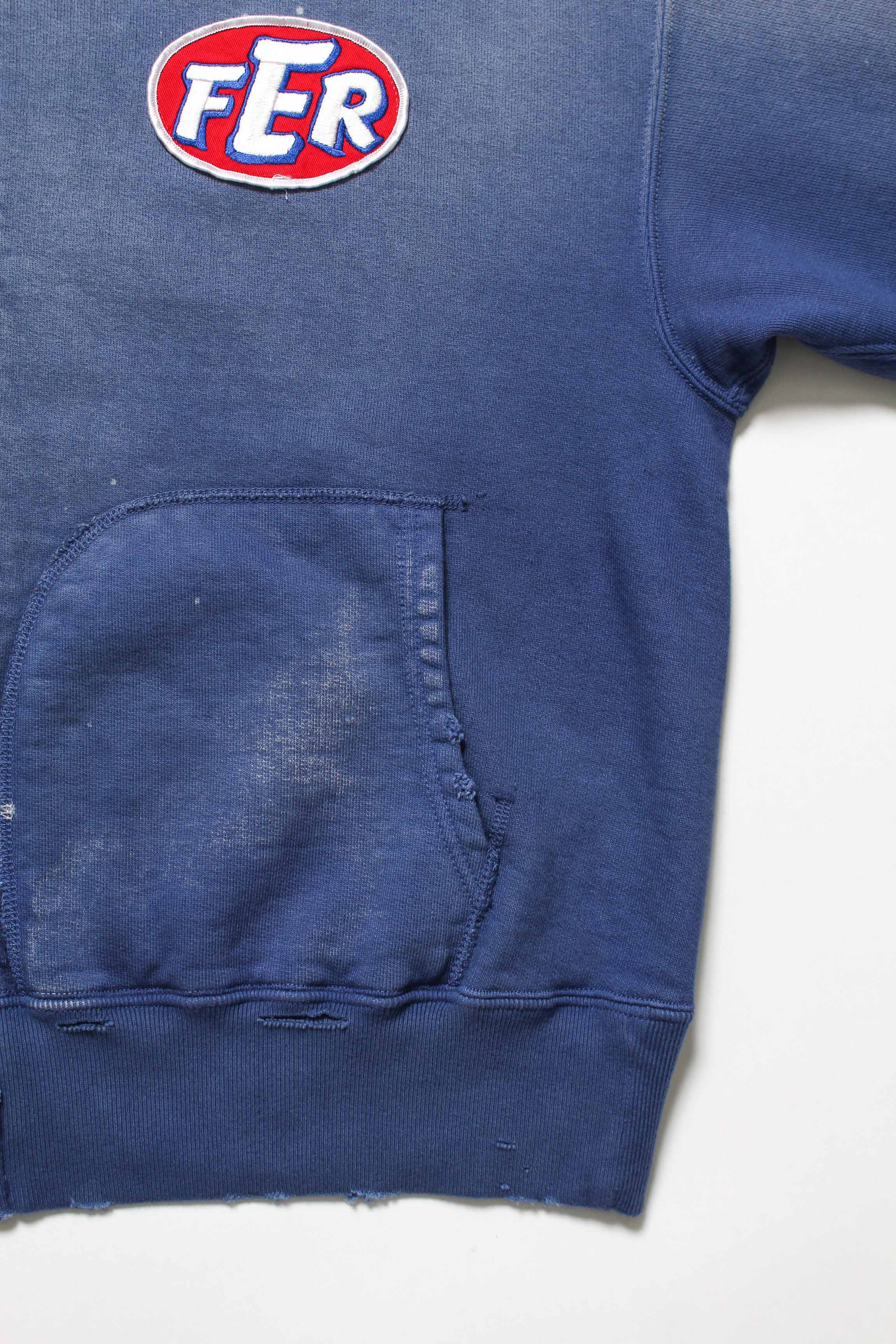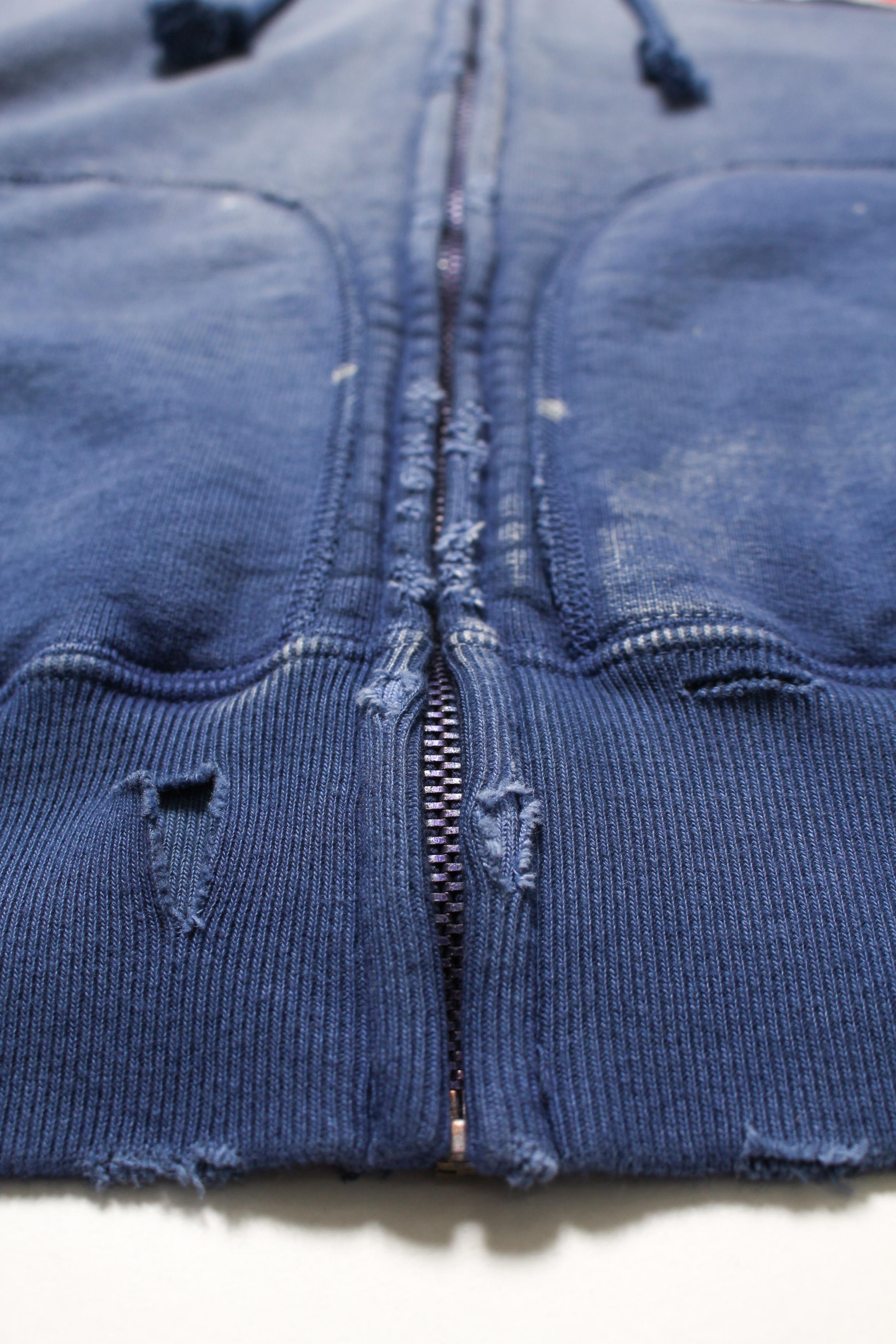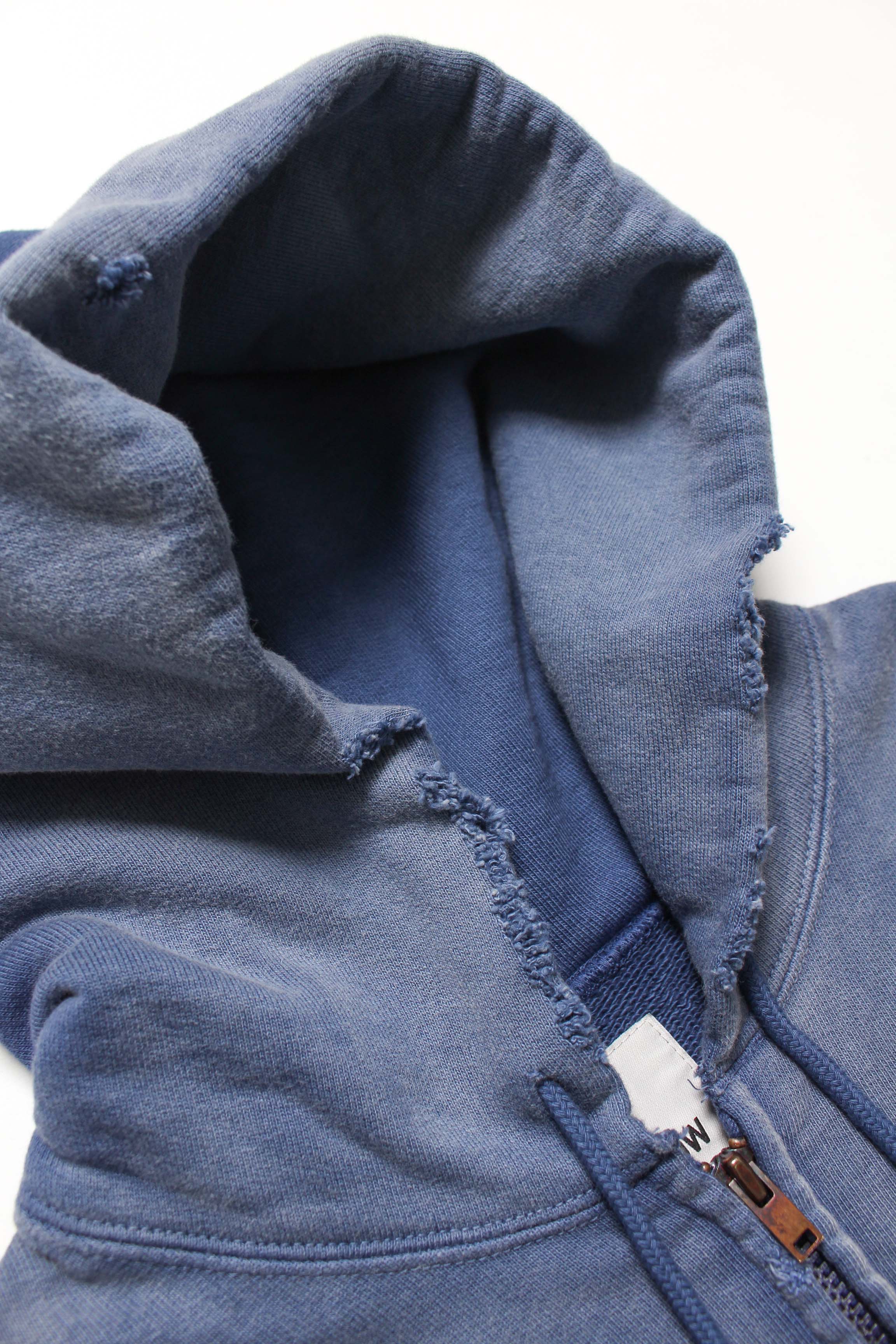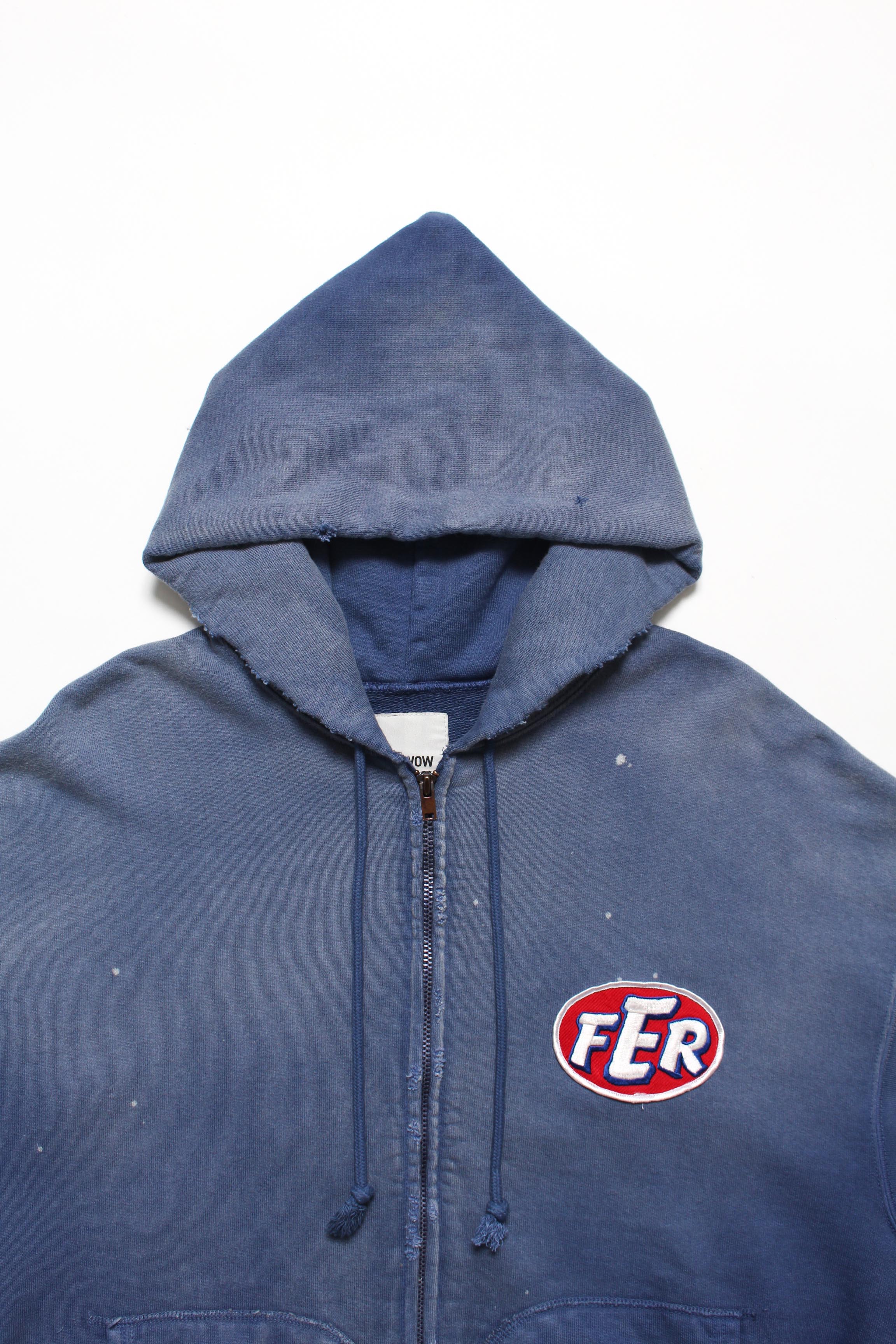 A zip hoodie with a motor-industry uniform worldview, featuring a logo patch that adds an industrial, powerful mood. Designed with the stance of a garage uniform, pushing a rugged and practical presence to the front. Based on a 1950s zip hoodie with separate-pocket construction, reflecting the era’s structure and balance while keeping a vintage silhouette and stitch character. Made with heavyweight, non-brushed French terry, preserving the vintage texture from a special knitting machine. Realistic aging is treated as part of the design, giving a relaxed look with a firm core expression.