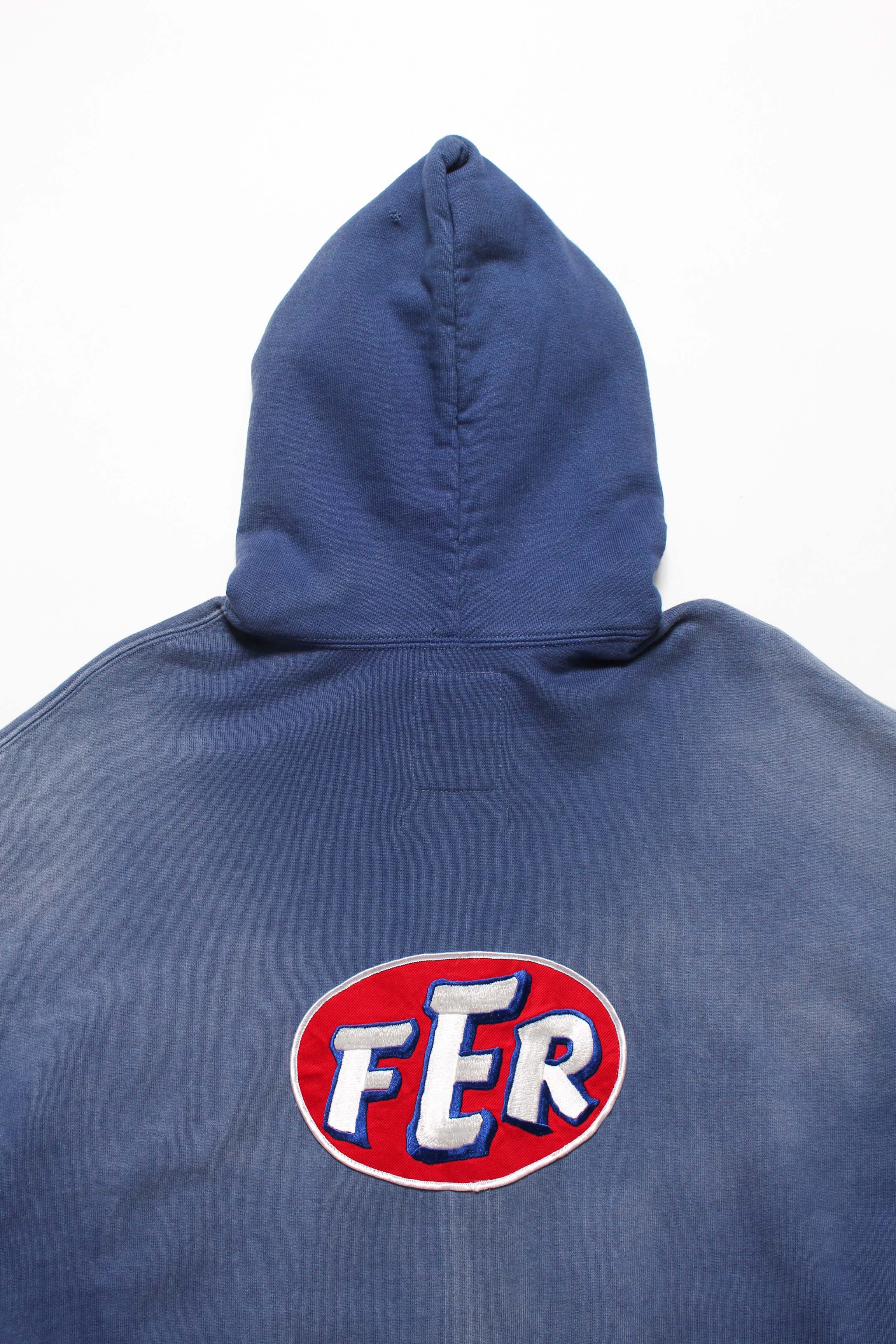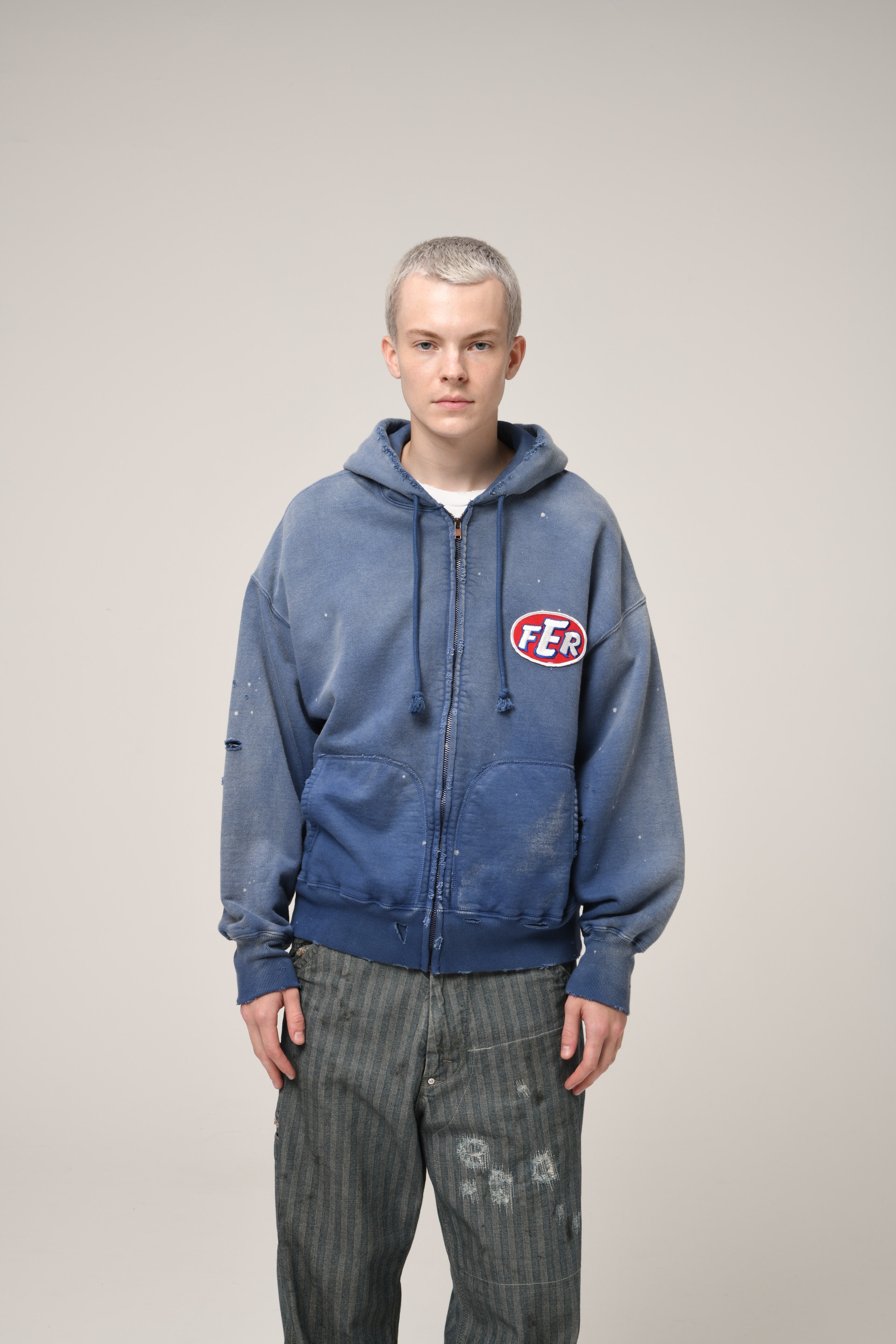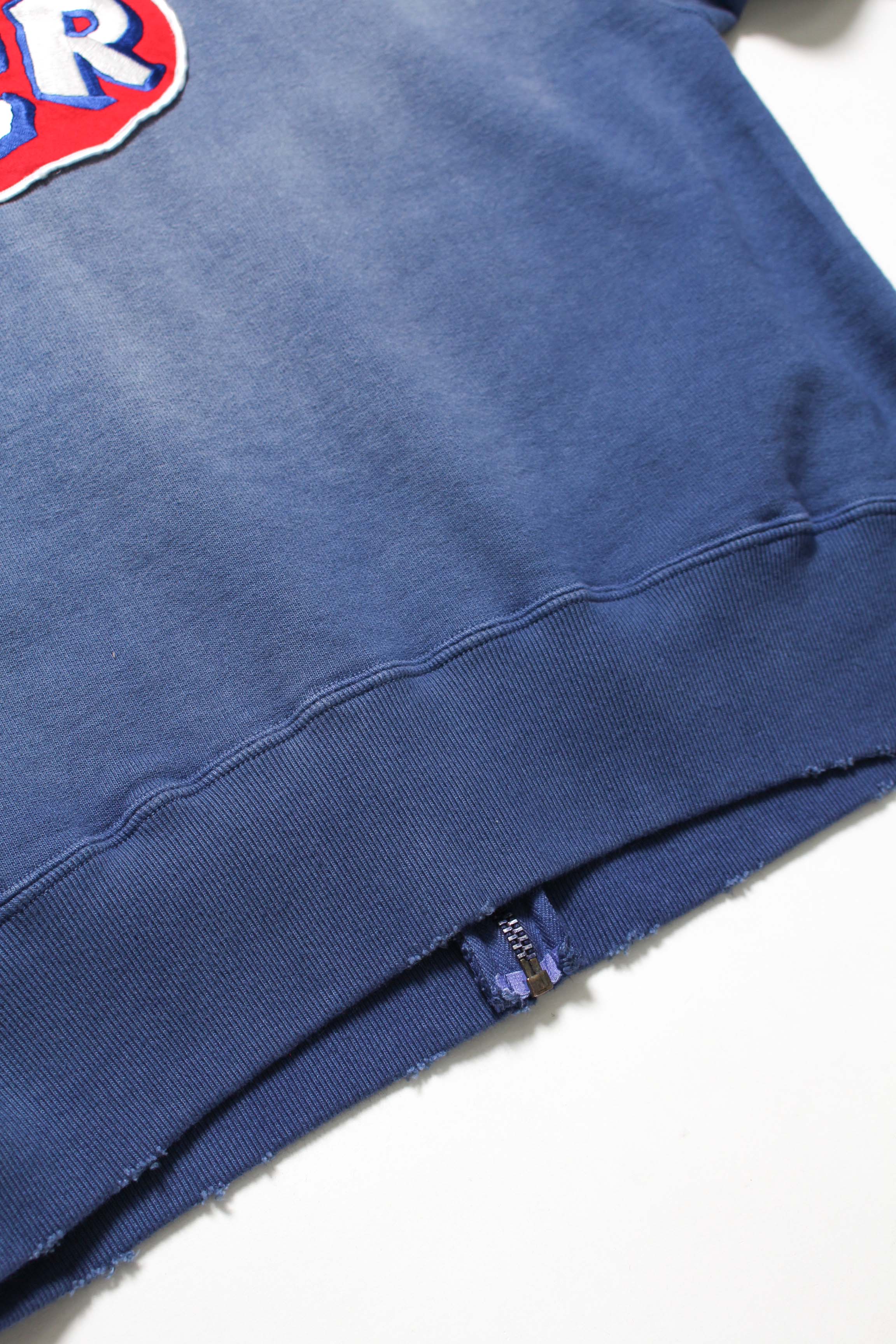 A zip hoodie with a motor-industry uniform worldview, featuring a logo patch that adds an industrial, powerful mood. Designed with the stance of a garage uniform, pushing a rugged and practical presence to the front. Based on a 1950s zip hoodie with separate-pocket construction, reflecting the era’s structure and balance while keeping a vintage silhouette and stitch character. Made with heavyweight, non-brushed French terry, preserving the vintage texture from a special knitting machine. Realistic aging is treated as part of the design, giving a relaxed look with a firm core expression.