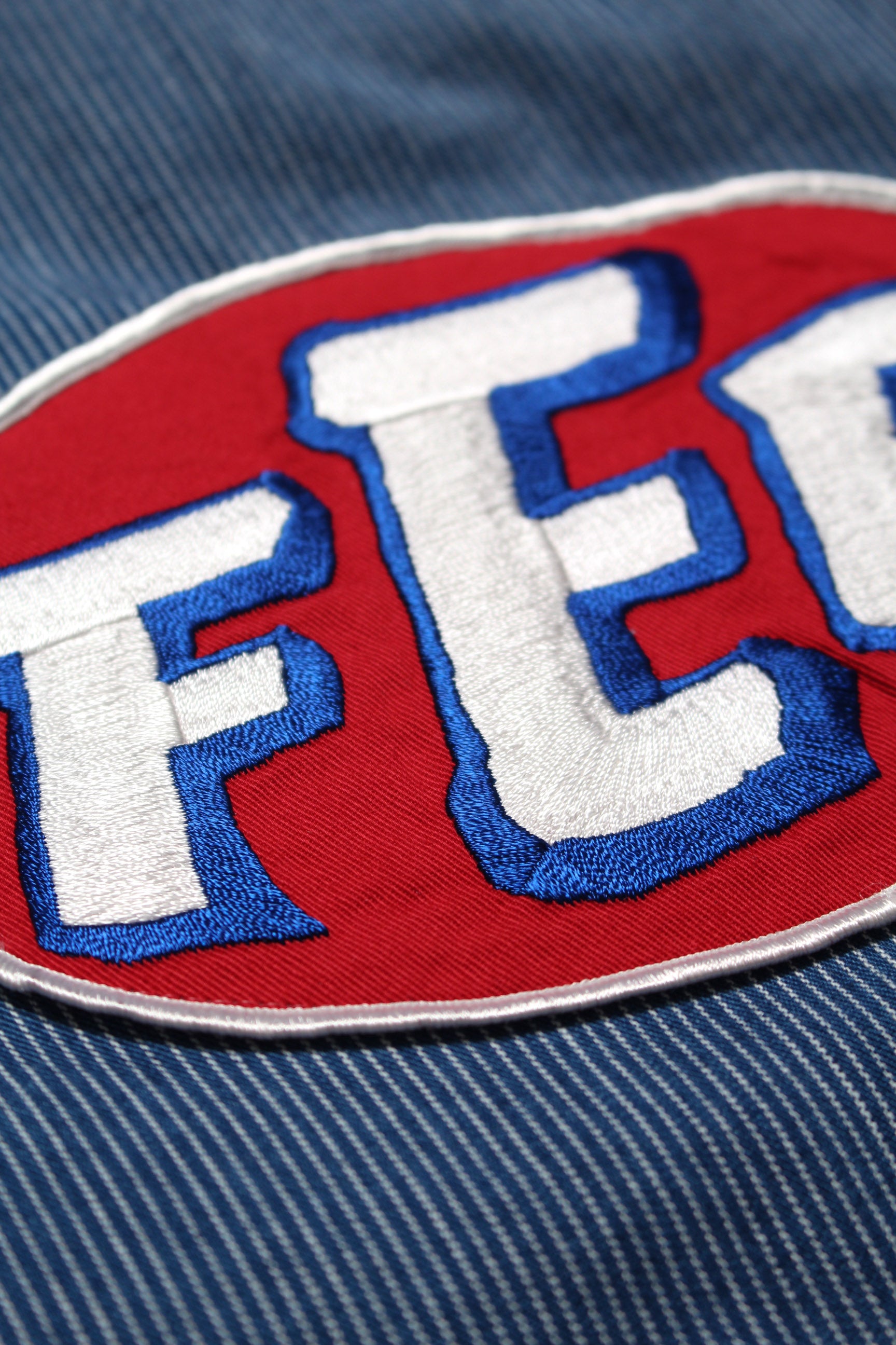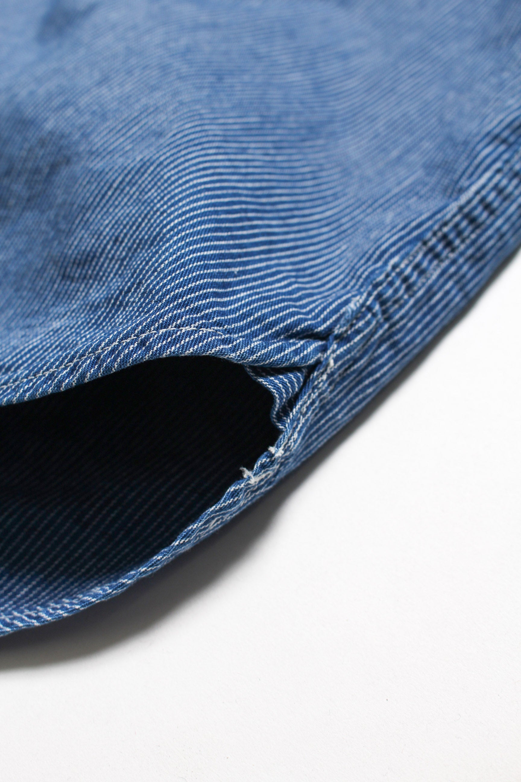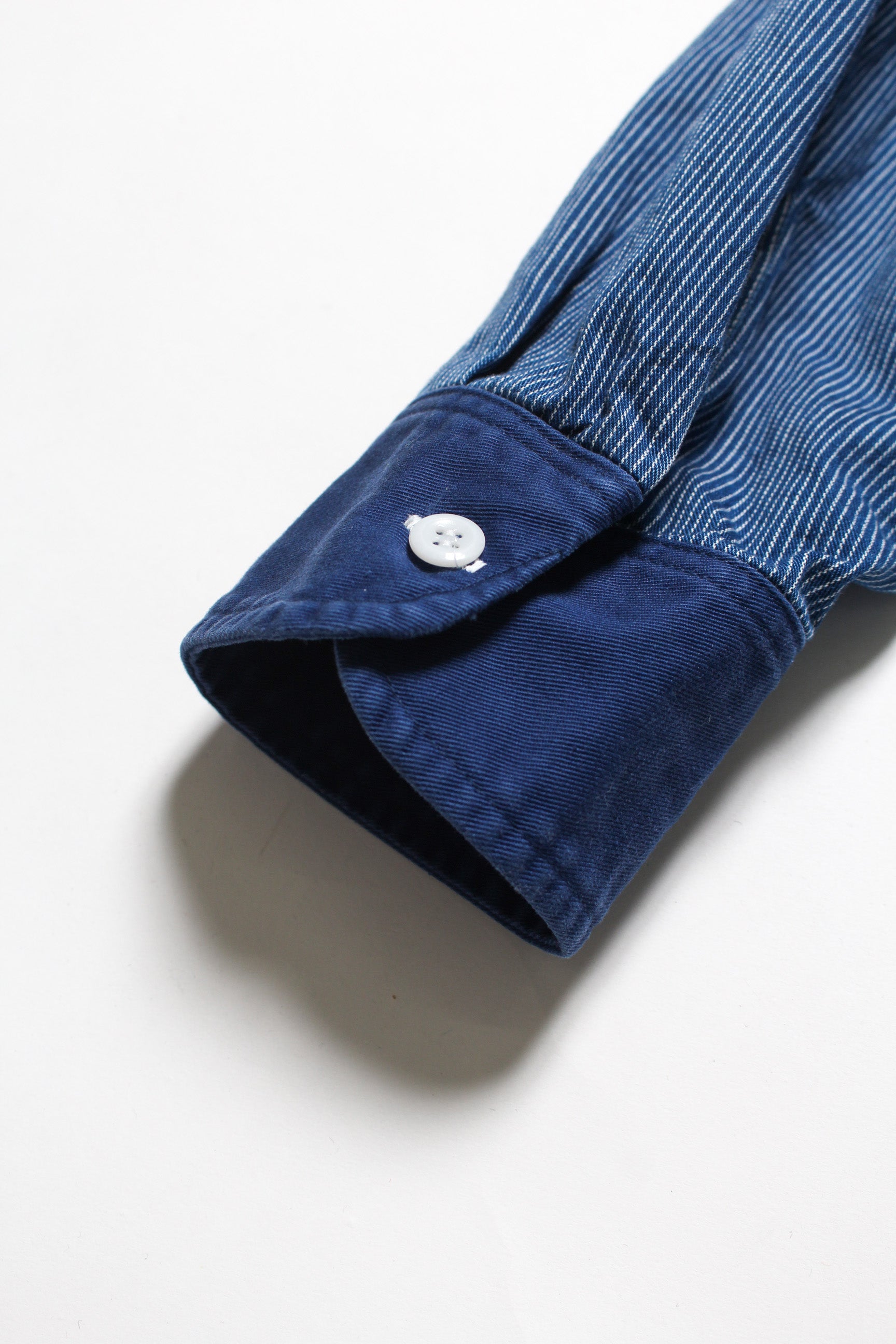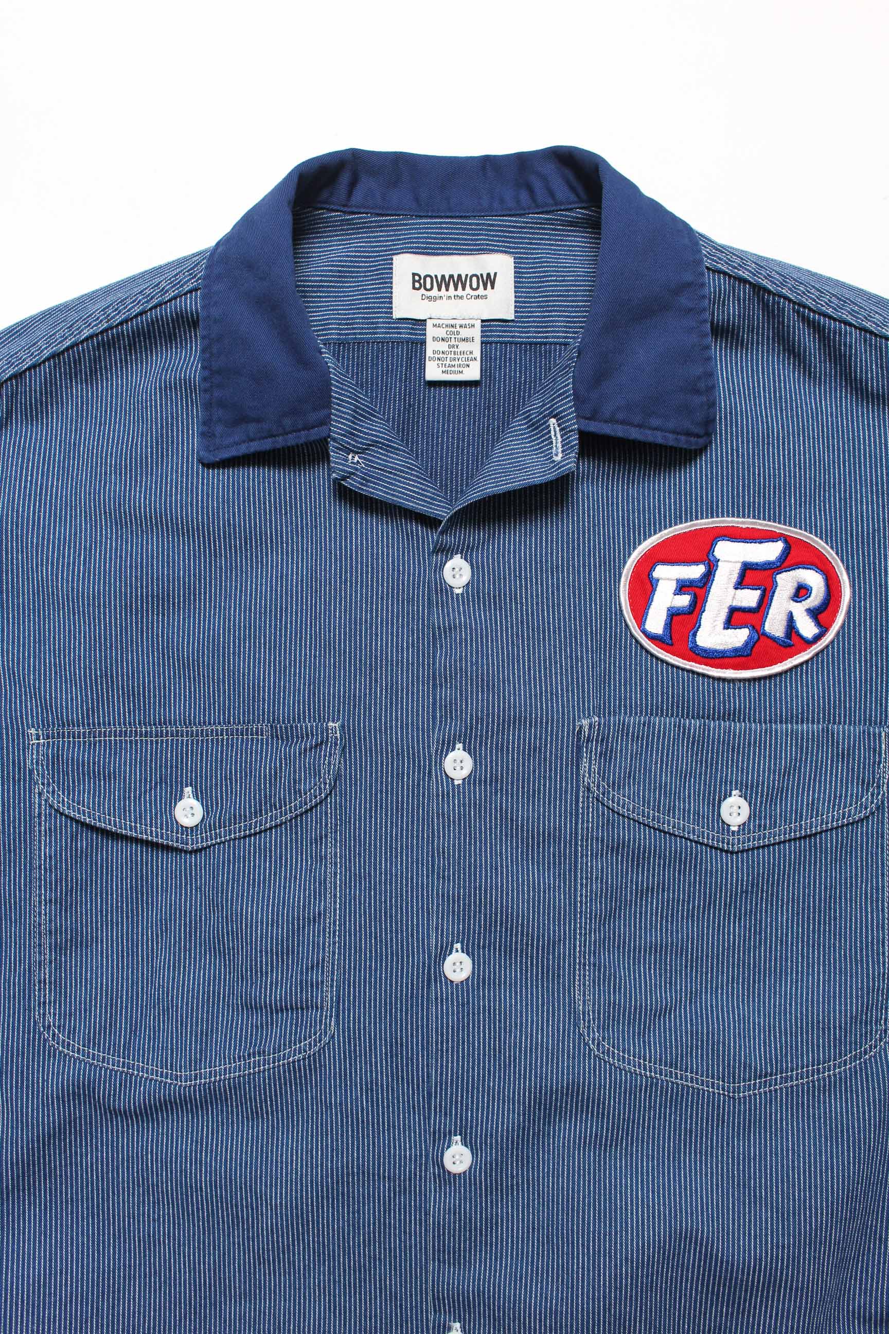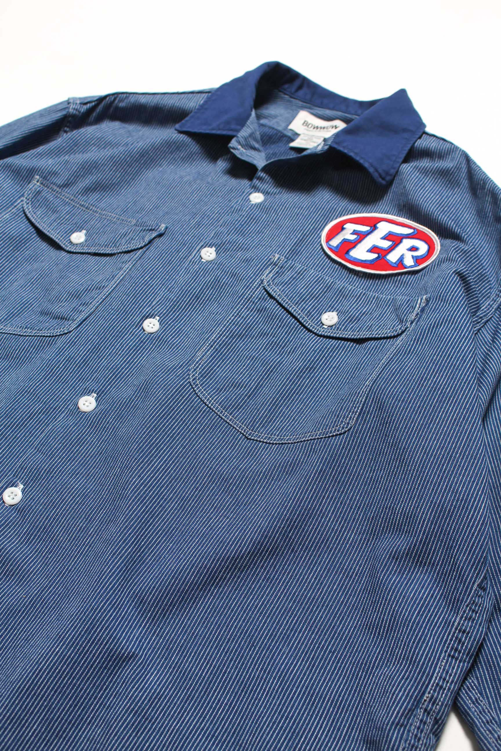 50年代に見られる隠れた名作ディティールを持つツートンシャツを背景に、当時のワークウェアらしい無骨なバランスと素材の表情をそのまま活かしたインディゴ生地の一着。切り替えの配置や構造に、古い時代ならではの実用性とデザイン性が同居している。 モーター関連メーカーをイメージして構成したロゴワッペンを配し、工業的で力強い空気感をプラス。作業着として使われてきたユニフォームのような佇まいを意識している。 実在していそうな企業ユニフォームのリアリティと、土臭さの残る表情が共存する仕上がりになっている。