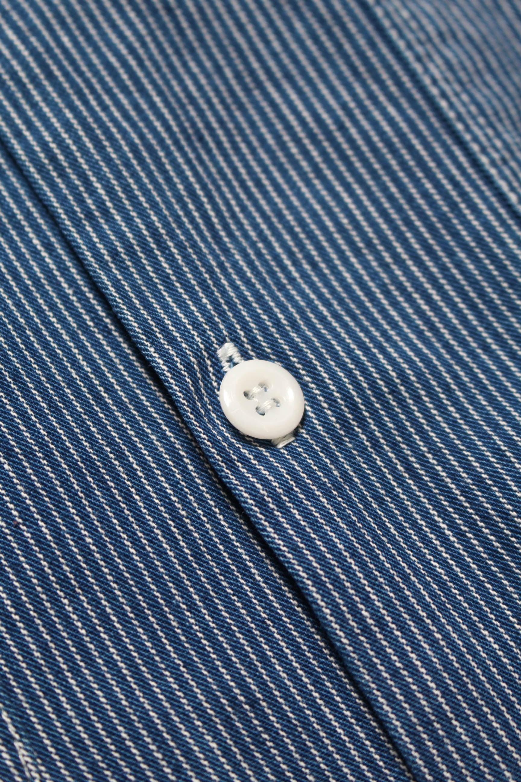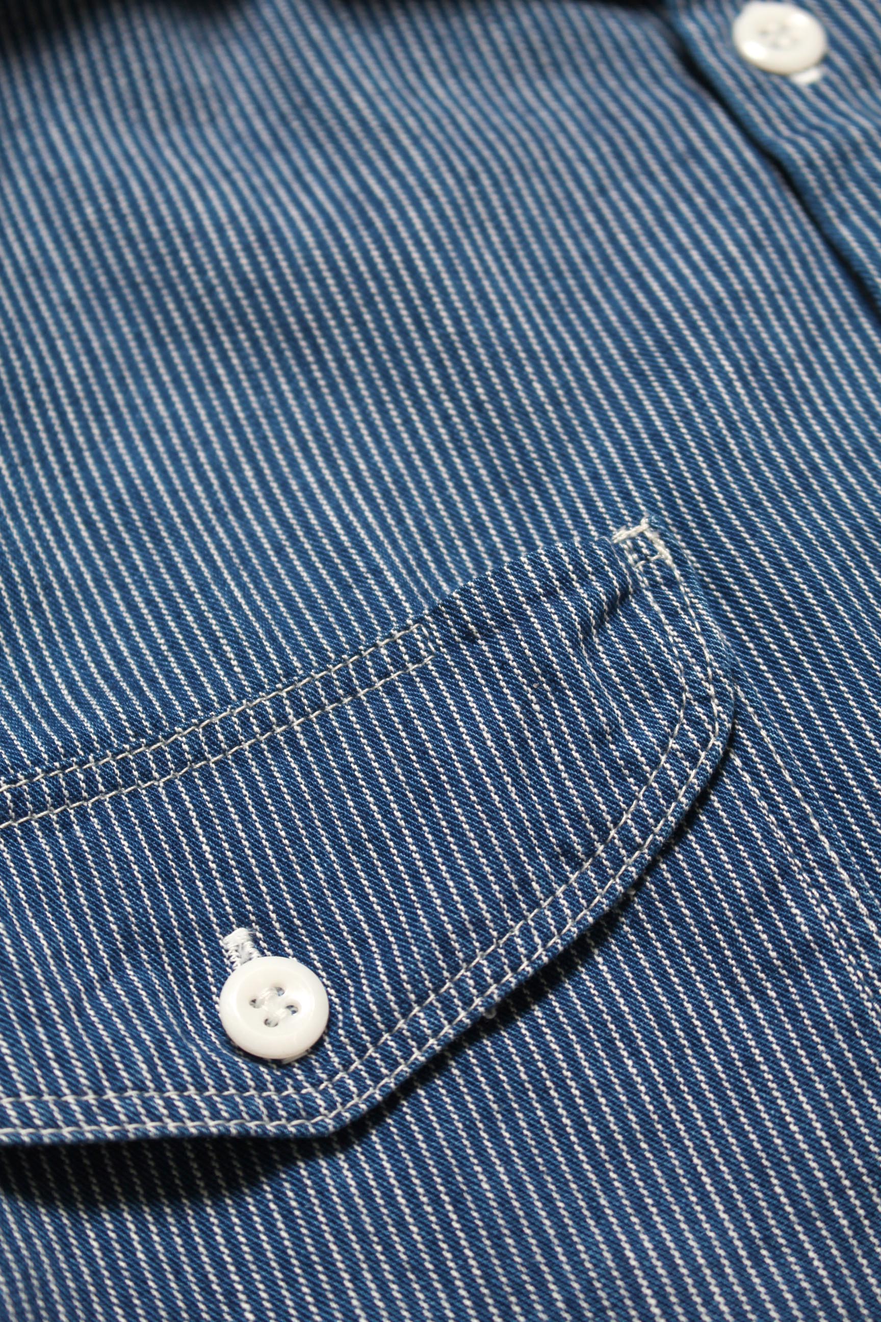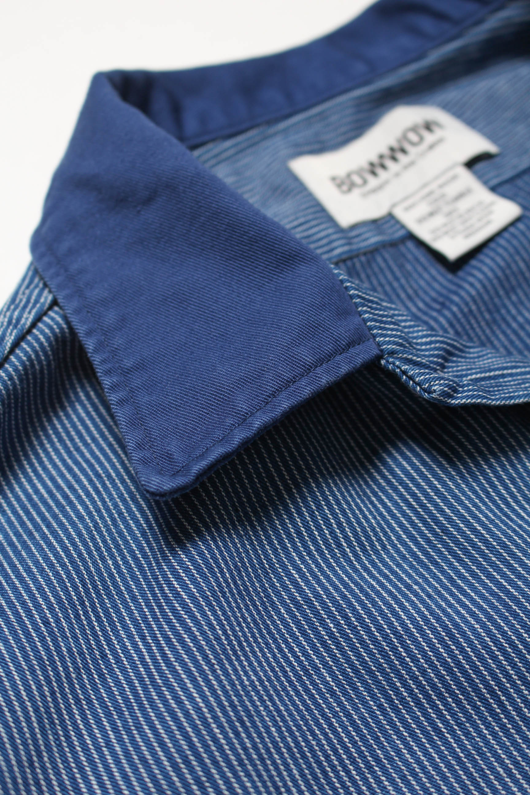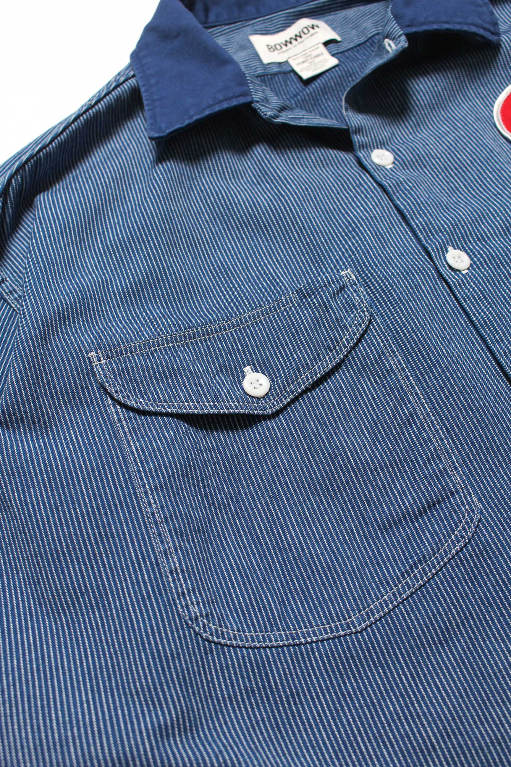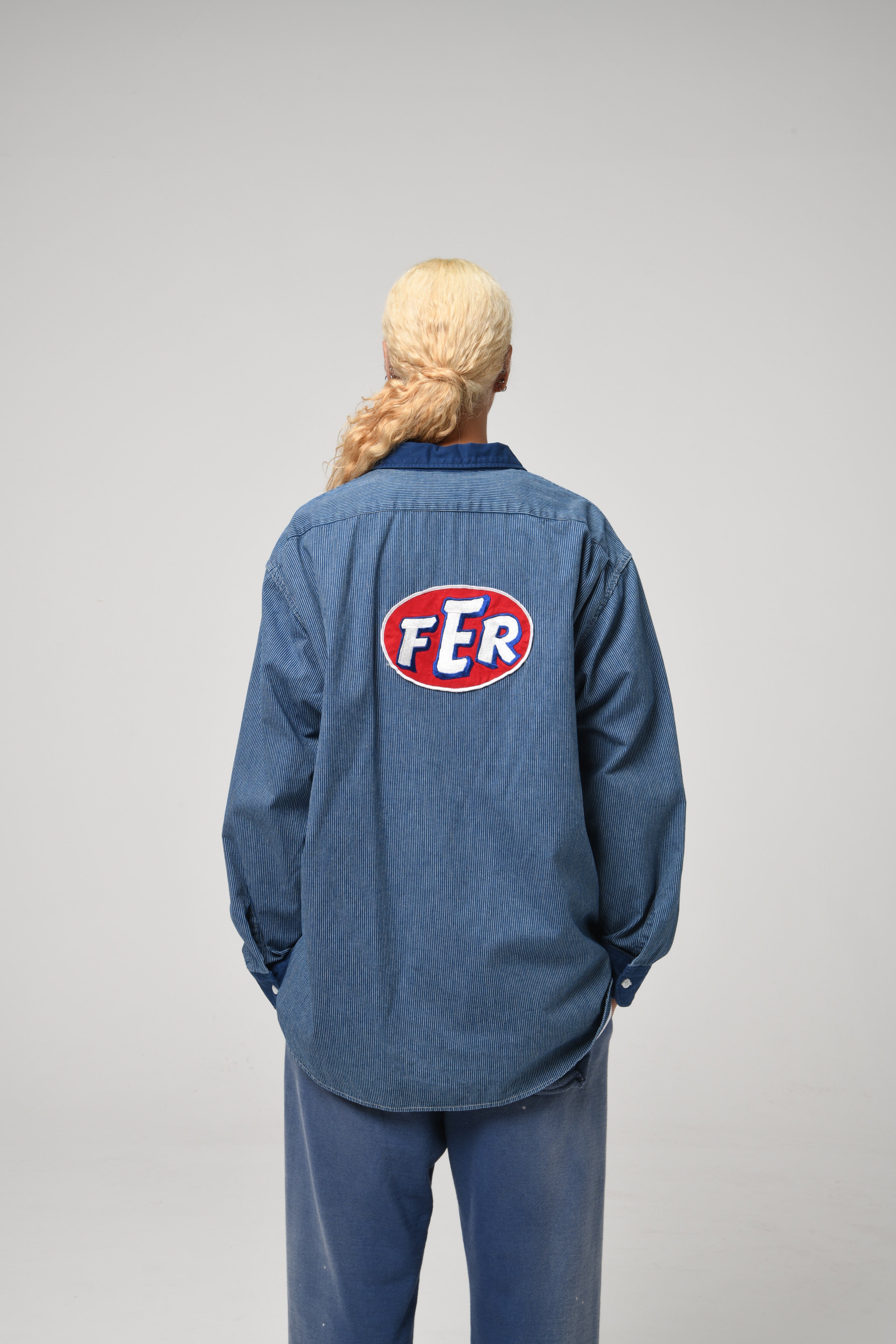 50年代に見られる隠れた名作ディティールを持つツートンシャツを背景に、当時のワークウェアらしい無骨なバランスと素材の表情をそのまま活かしたインディゴ生地の一着。切り替えの配置や構造に、古い時代ならではの実用性とデザイン性が同居している。 モーター関連メーカーをイメージして構成したロゴワッペンを配し、工業的で力強い空気感をプラス。作業着として使われてきたユニフォームのような佇まいを意識している。 実在していそうな企業ユニフォームのリアリティと、土臭さの残る表情が共存する仕上がりになっている。