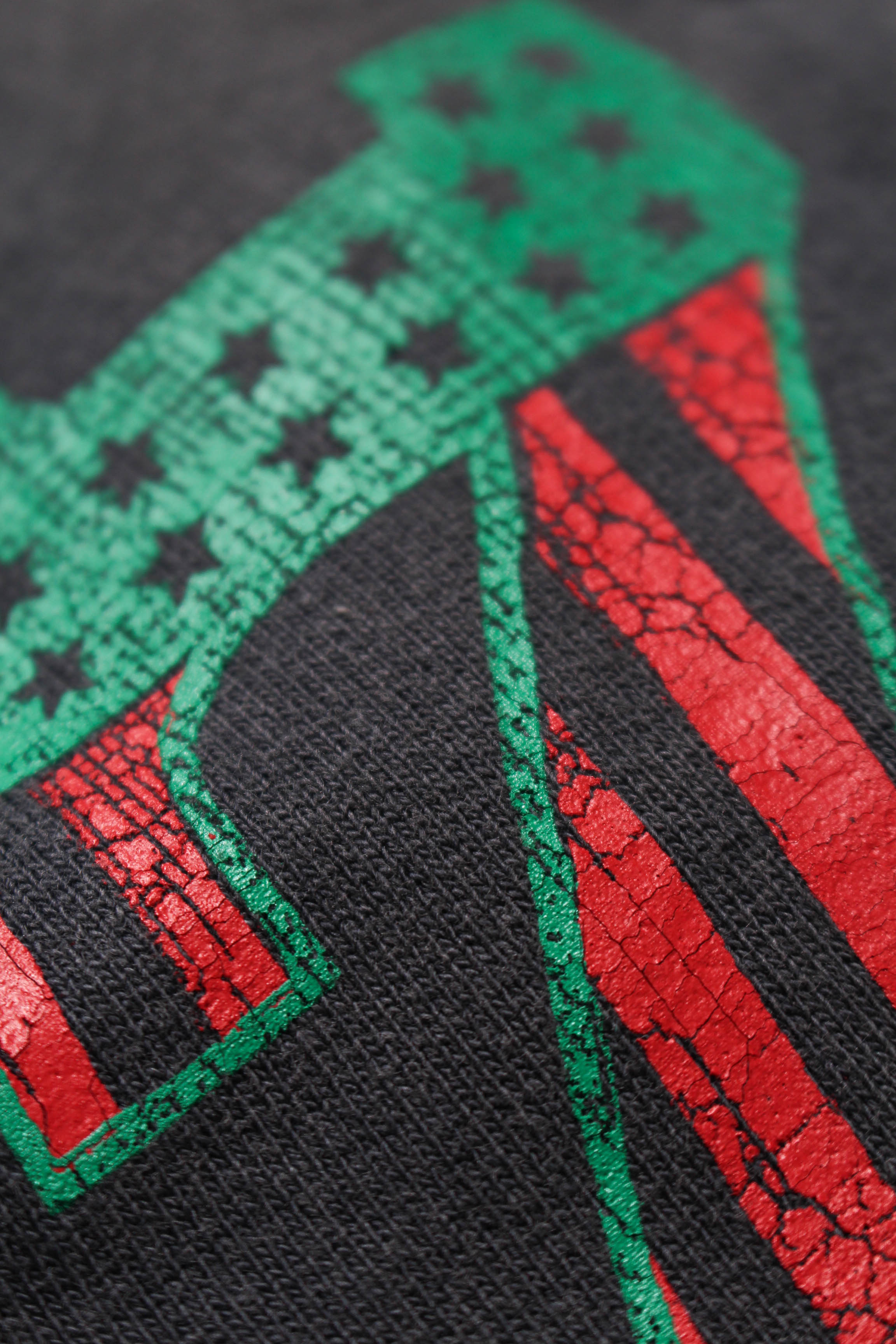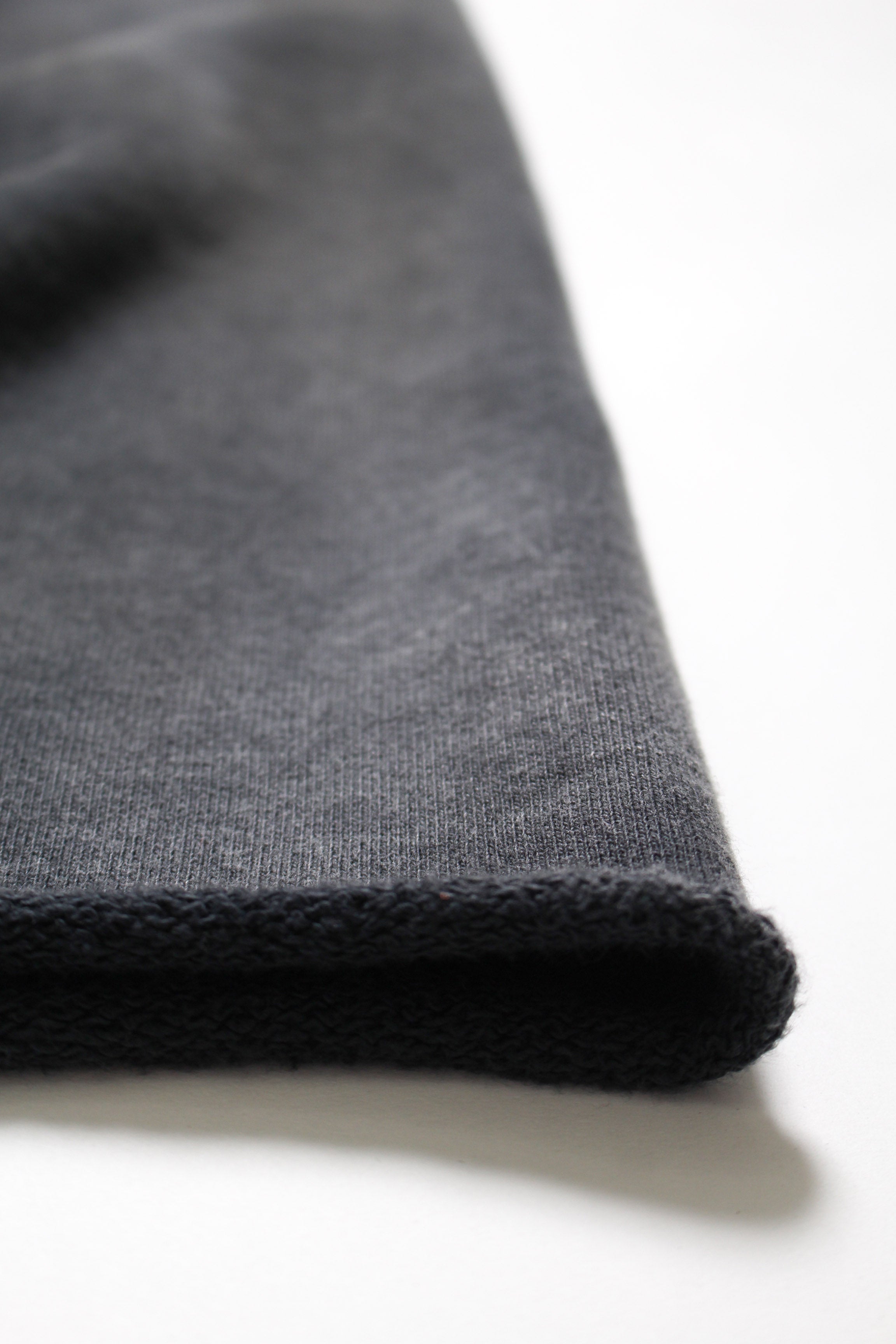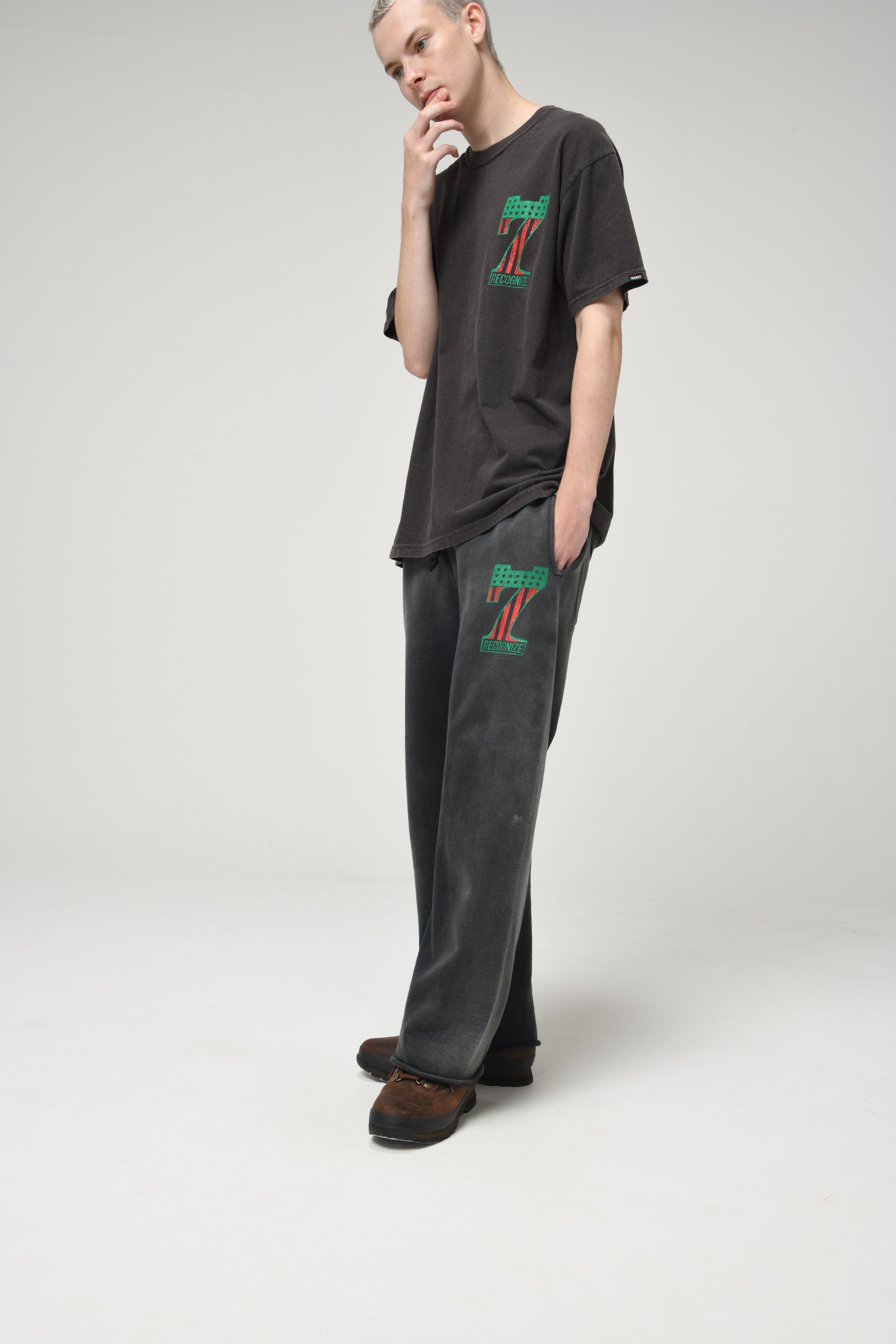 A collaboration item with RECOGNIZE, produced by DJ MURO. The No.1 logo is built with “7” (meaning a 7-inch record) and MURO’s signature African American flag color scheme. The worldview is inspired by shopwear from the SAVAGE era, expressing a realistic sense of time. Heavyweight, non-brushed French terry sweatpants are layered with BOW WOW’s signature realistic vintage processing to recreate the expression of years of wear. A deep-rise, slacks-like silhouette and raw-cut hems preserve the atmosphere of old sweatpants.