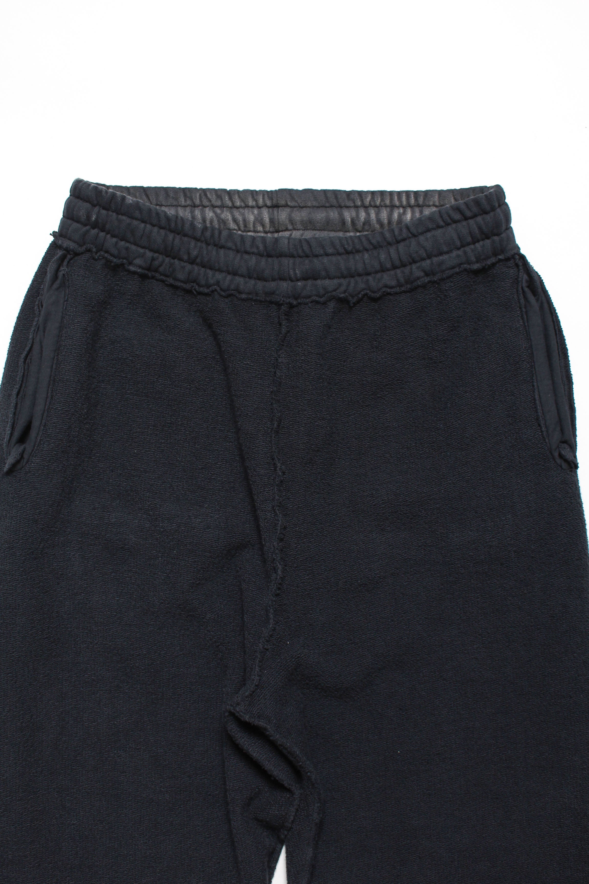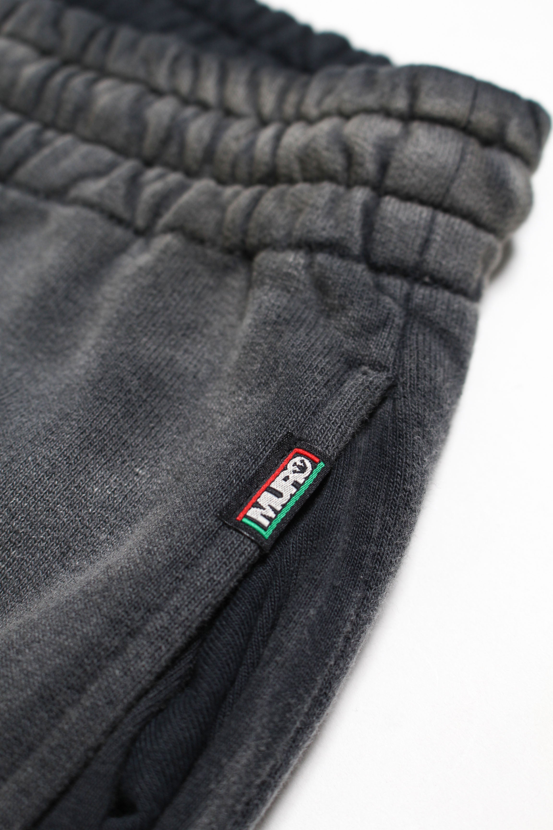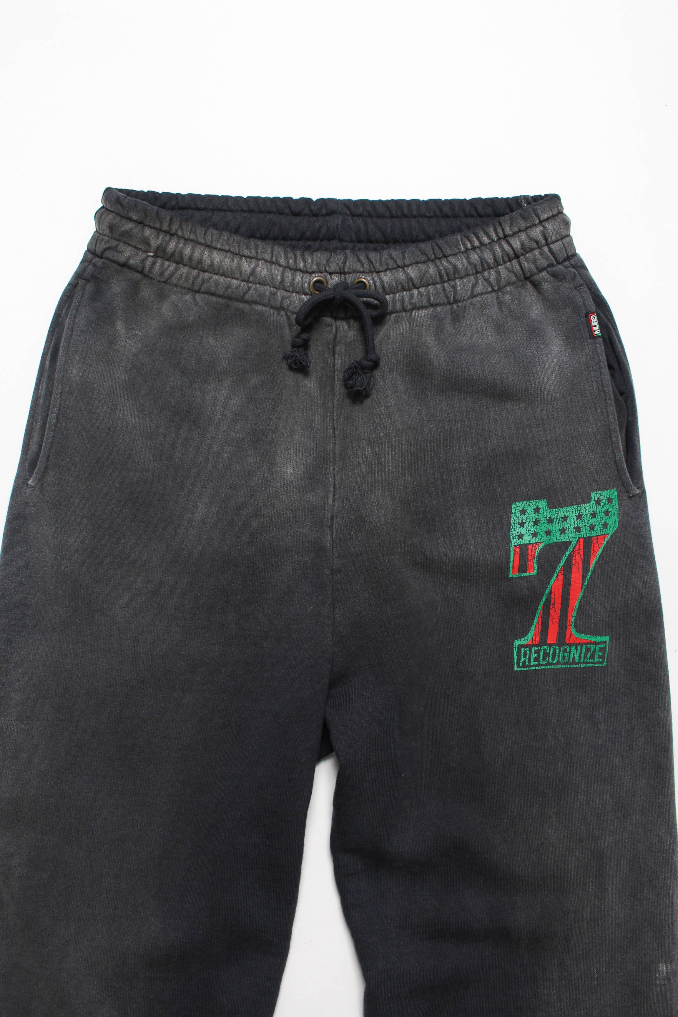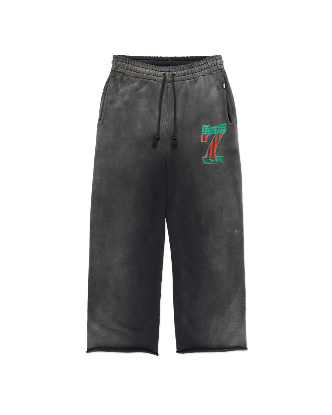 DJ MUROプロデュースのRECOGNIZEとのコラボレーションアイテム。No.1ロゴを7インチレコードを意味する「7」と、MUROのイメージカラーであるアフリカンアメリカンフラッグ配色で構成している。 SAVAGE時代のショップウェアをイメージした世界観を落とし込み、リアルな時代感を表現。 起毛無しの厚地裏毛を使用したスウェットパンツに、BOW WOWが得意とするリアルなヴィンテージ加工を重ね、長年穿き込まれてきたような表情に仕上げている。股上を深く取ったスラックスライクなシルエットと、切りっ放しの裾が古いスウェットの空気感を残している。