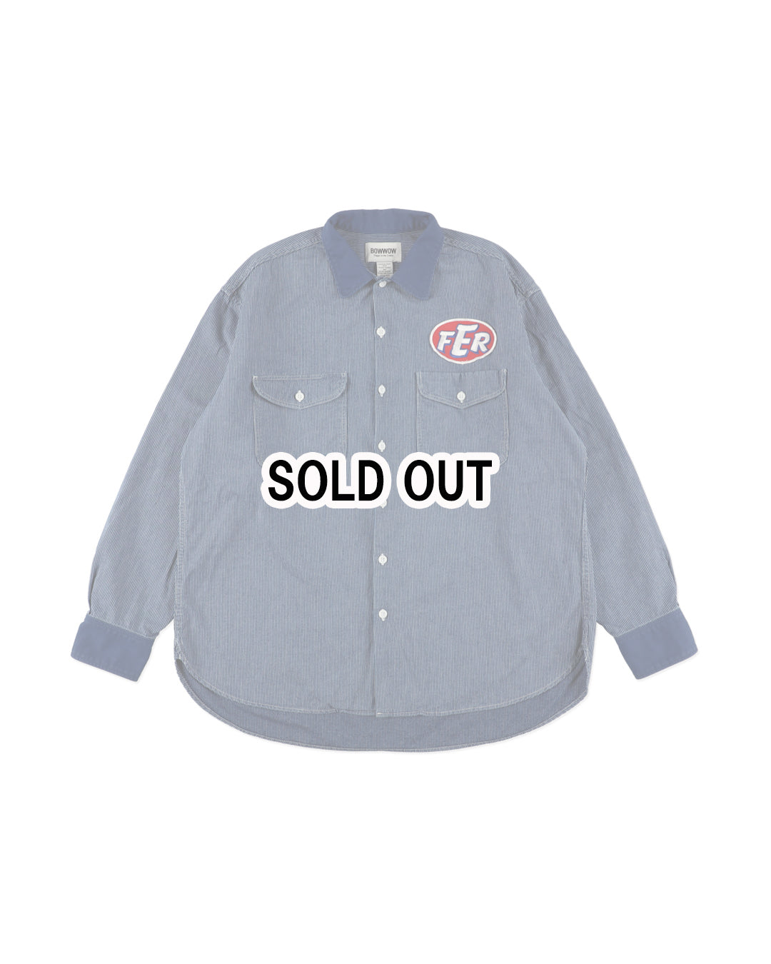 50年代に見られる隠れた名作ディティールを持つツートンシャツを背景に、当時のワークウェアらしい無骨なバランスと素材の表情をそのまま活かしたインディゴ生地の一着。切り替えの配置や構造に、古い時代ならではの実用性とデザイン性が同居している。 モーター関連メーカーをイメージして構成したロゴワッペンを配し、工業的で力強い空気感をプラス。作業着として使われてきたユニフォームのような佇まいを意識している。 実在していそうな企業ユニフォームのリアリティと、土臭さの残る表情が共存する仕上がりになっている。