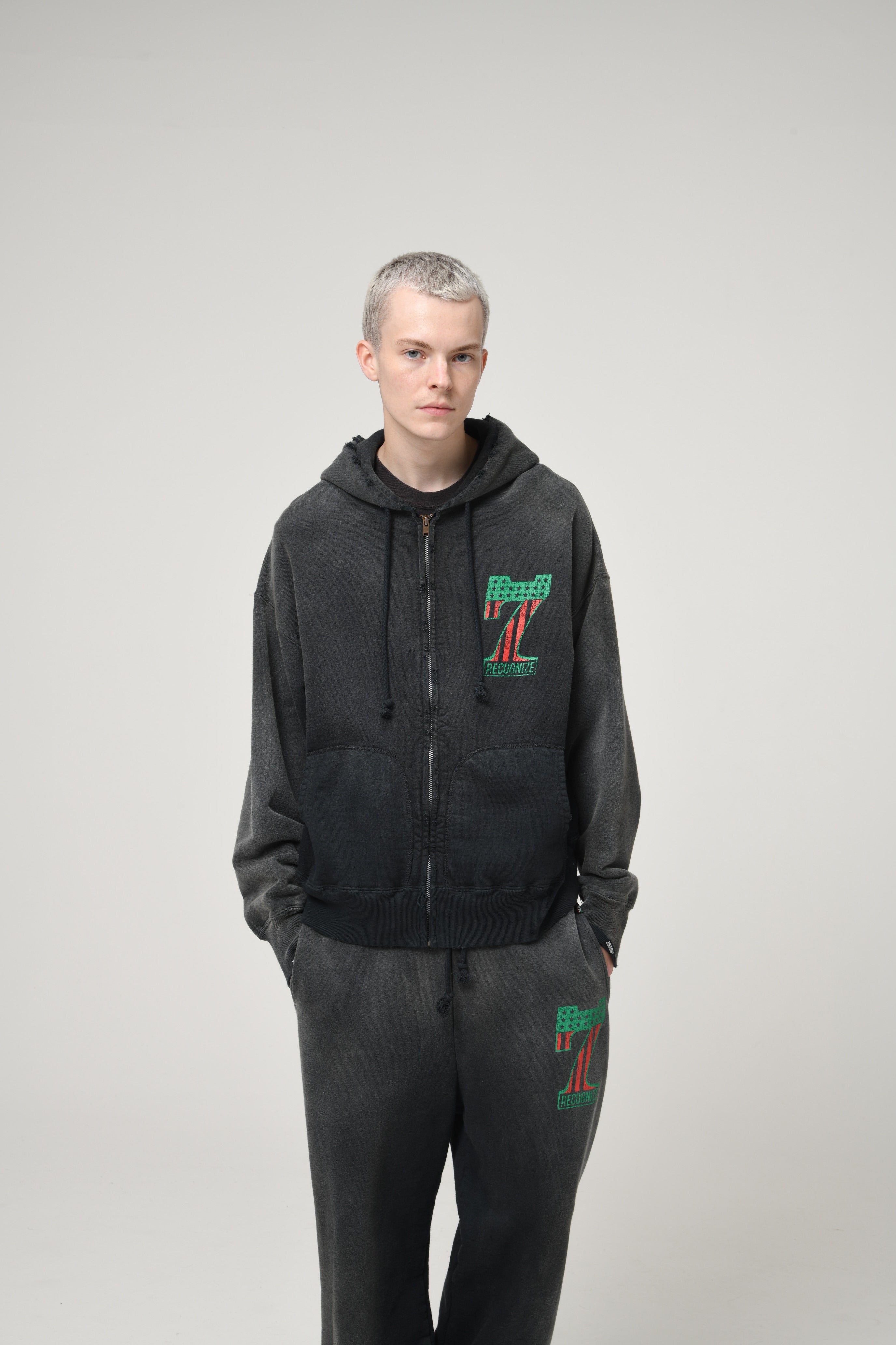 DJ MUROプロデュースのRECOGNIZEとのコラボレーションアイテム。No.1ロゴを、7インチレコードを意味する「7」と、MUROのイメージカラーであるアフリカンアメリカンフラッグ配色で構成している。 背面には、MUROがSAVAGEを運営していた当時のショップウェアをイメージしたグラフィックと実際の店舗電話番号を配置し、リアルな時代感を写し取っている。 ボディは1950年代のセパレートポケット仕様ジップパーカーを背景に設計。起毛無しの厚地裏毛を使用し、BOW WOWが得意とするリアルなヴィンテージ加工を重ねることで、長年着込まれてきたような表情と無骨な佇まいをそのまま再現している。