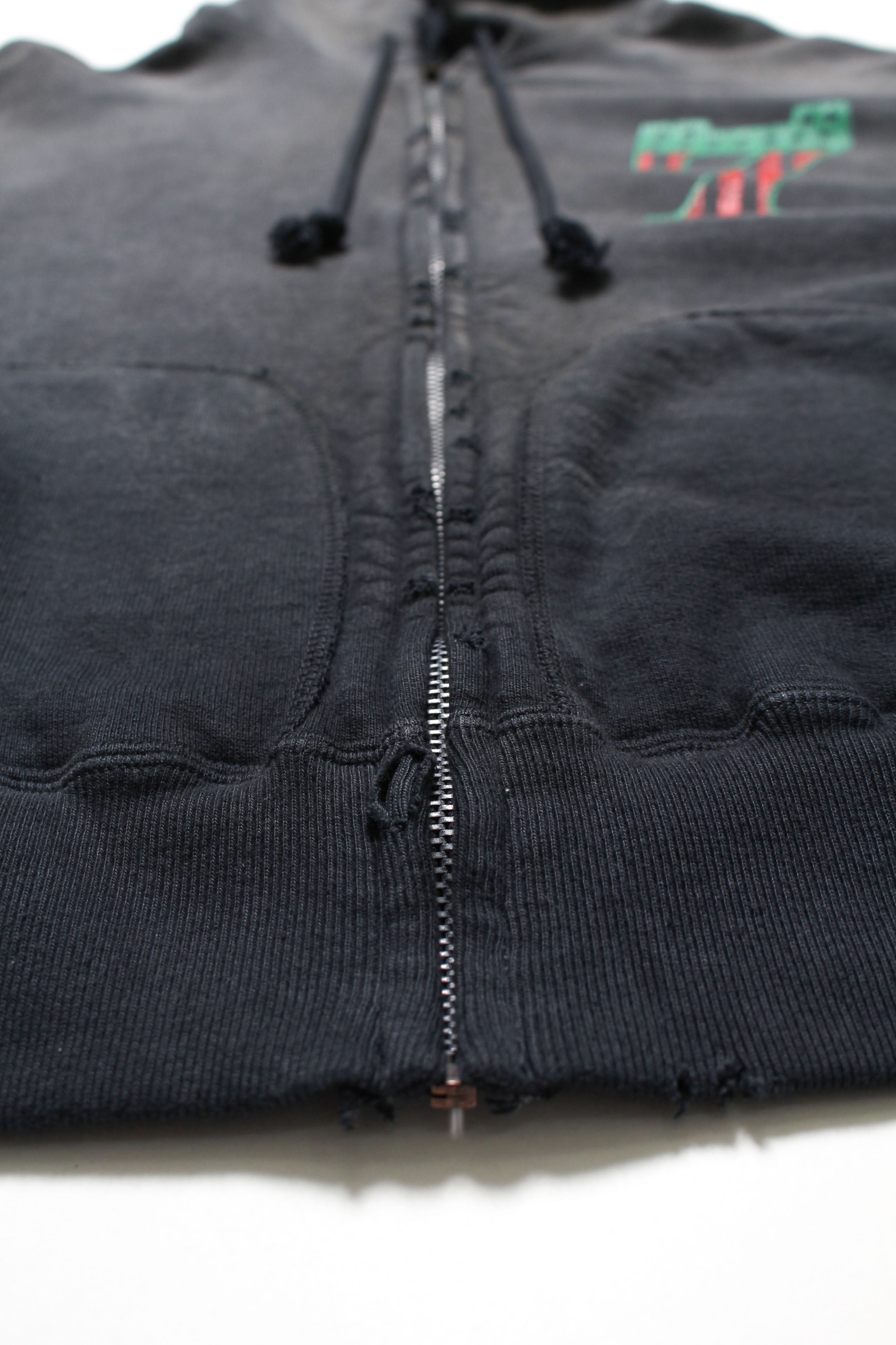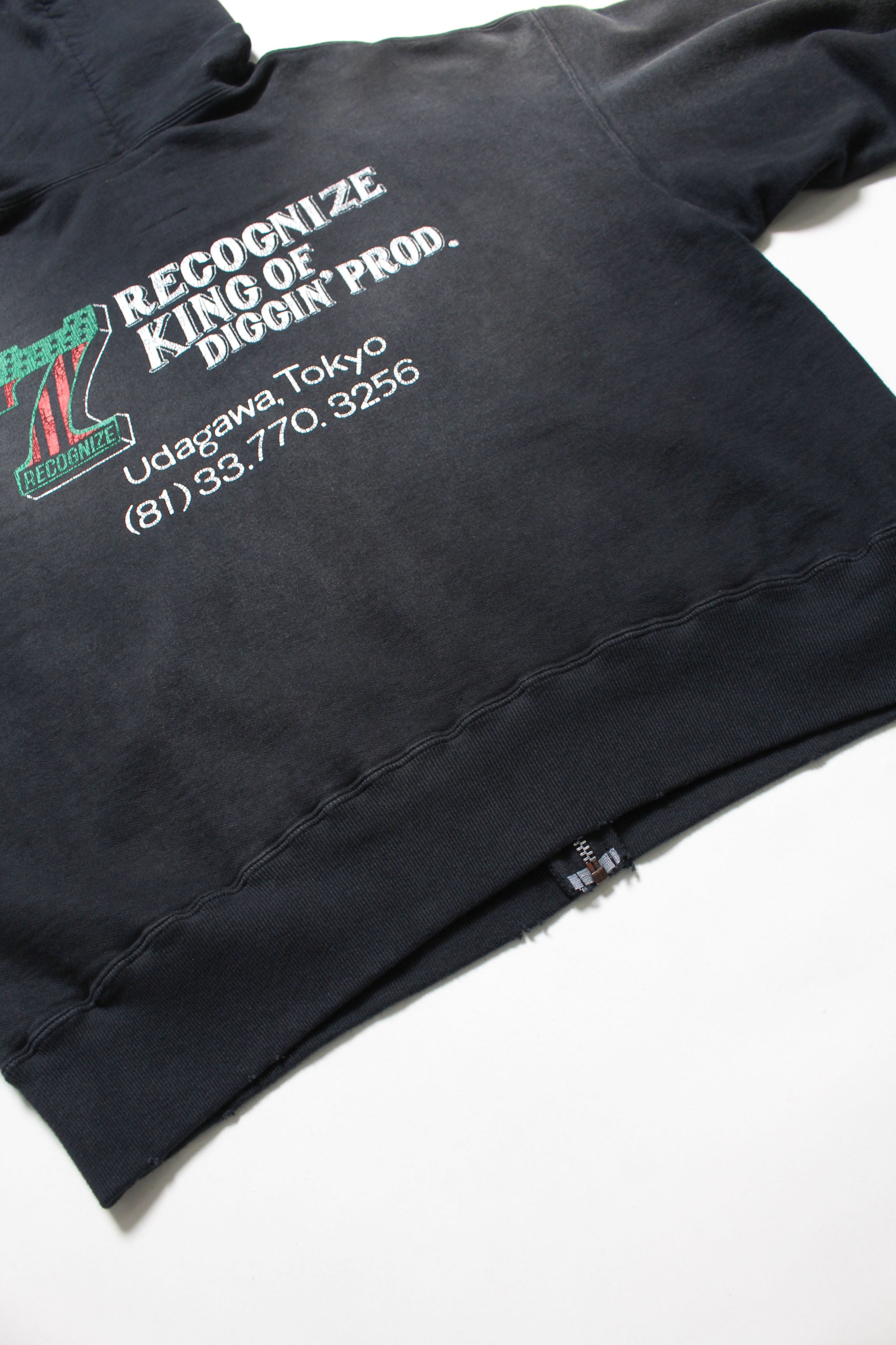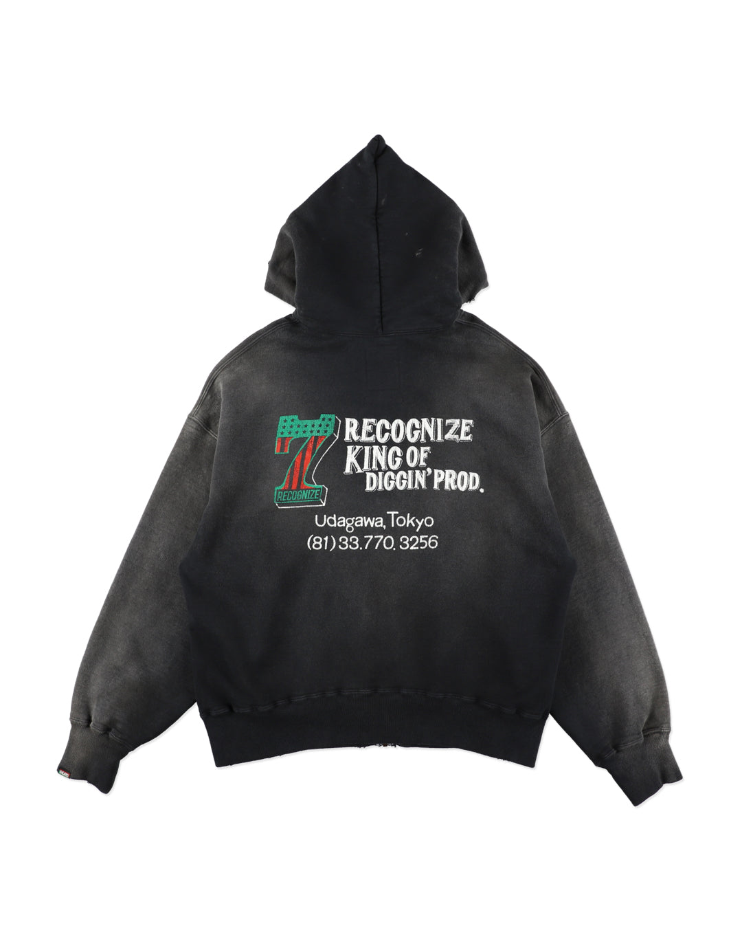 A collaboration item with RECOGNIZE, produced by DJ MURO. The No.1 logo is built with “7” (meaning a 7-inch record) and MURO’s signature African American flag color scheme. On the back, a graphic inspired by the shopwear from MURO’s SAVAGE era is placed alongside the actual store phone number, capturing a real sense of time. The body is designed from a 1950s separate-pocket zip hoodie. Made with heavyweight, non-brushed French terry, layered with BOW WOW’s signature realistic vintage processing to recreate the rugged presence and expression of a garment worn for years.