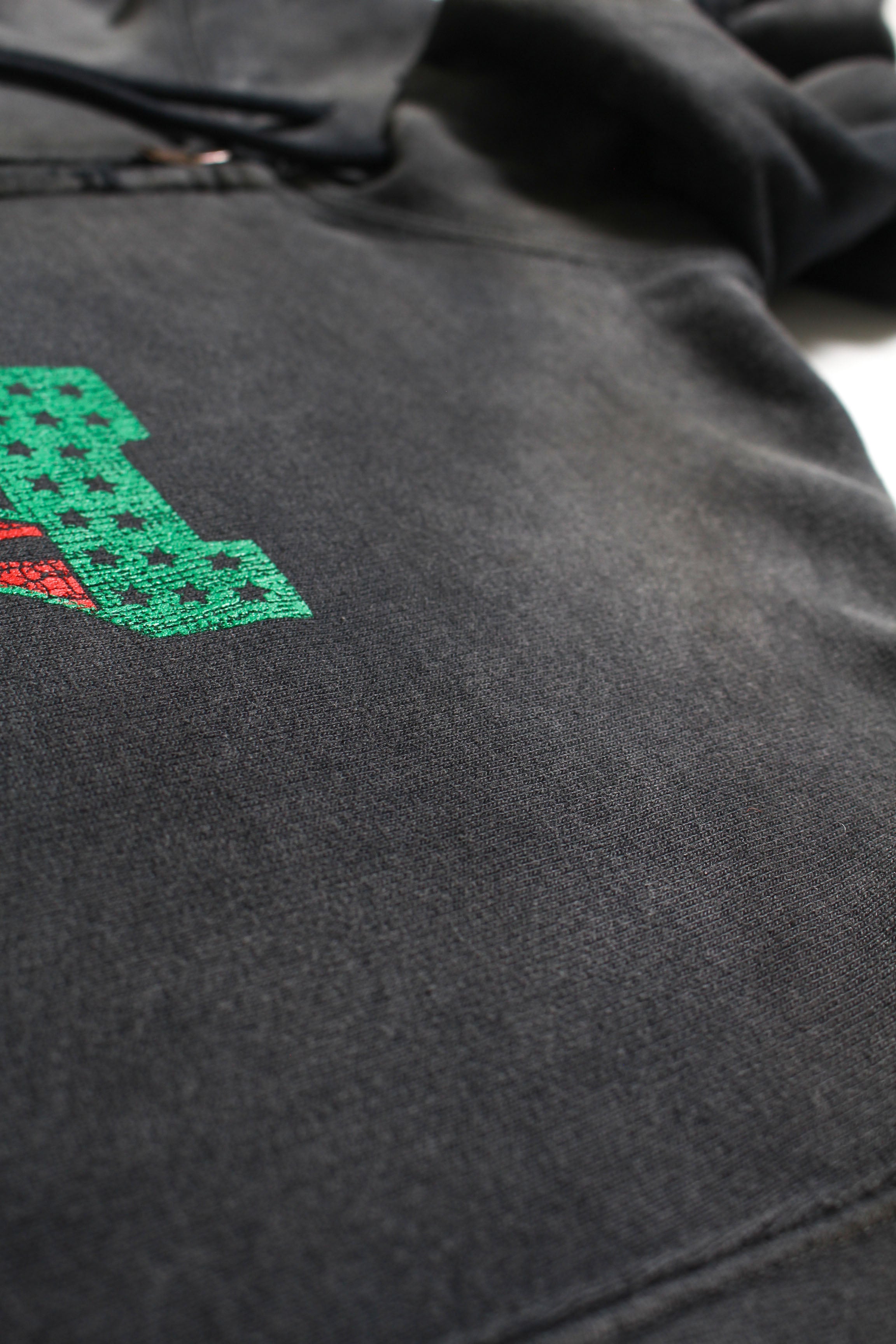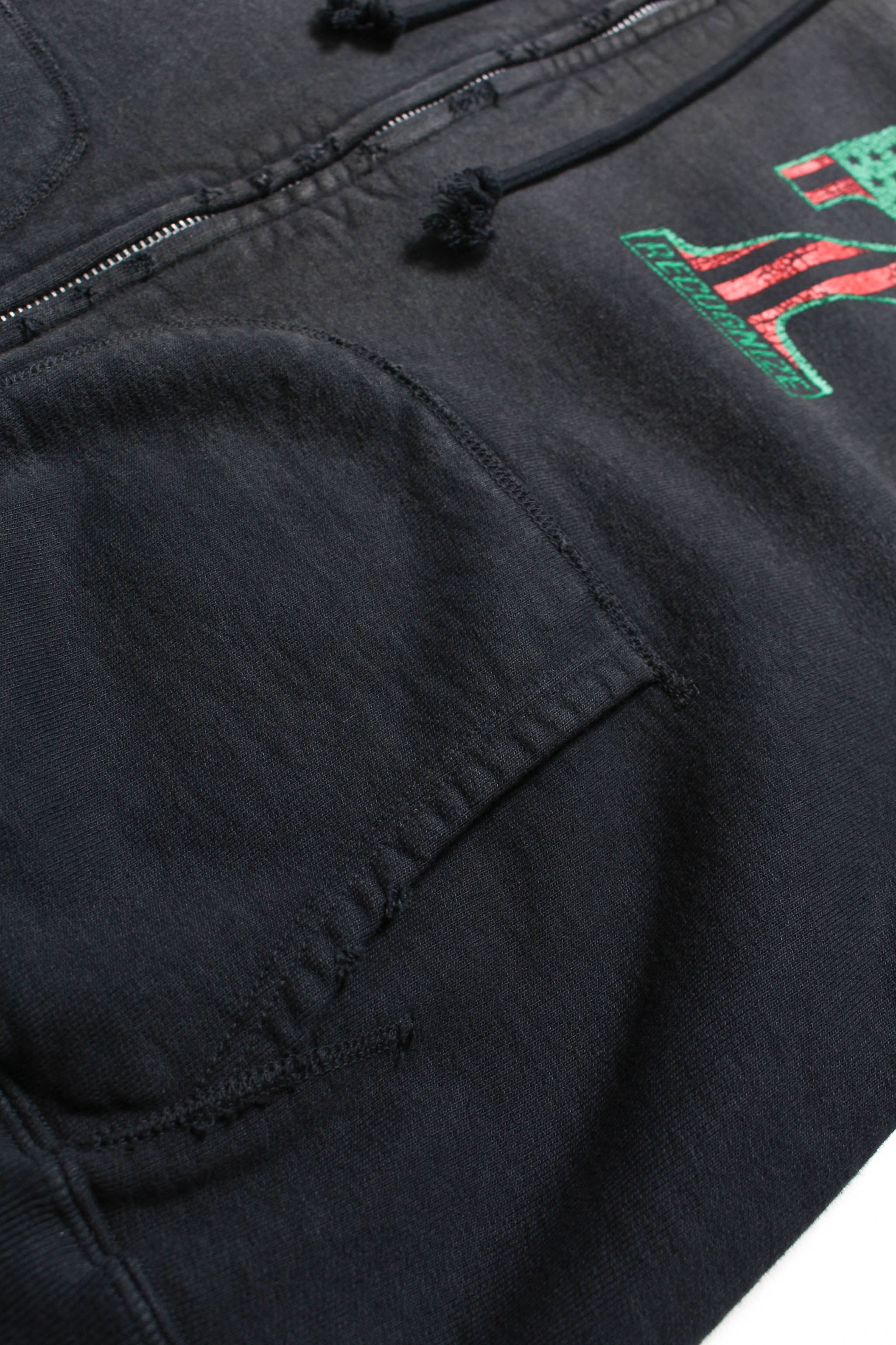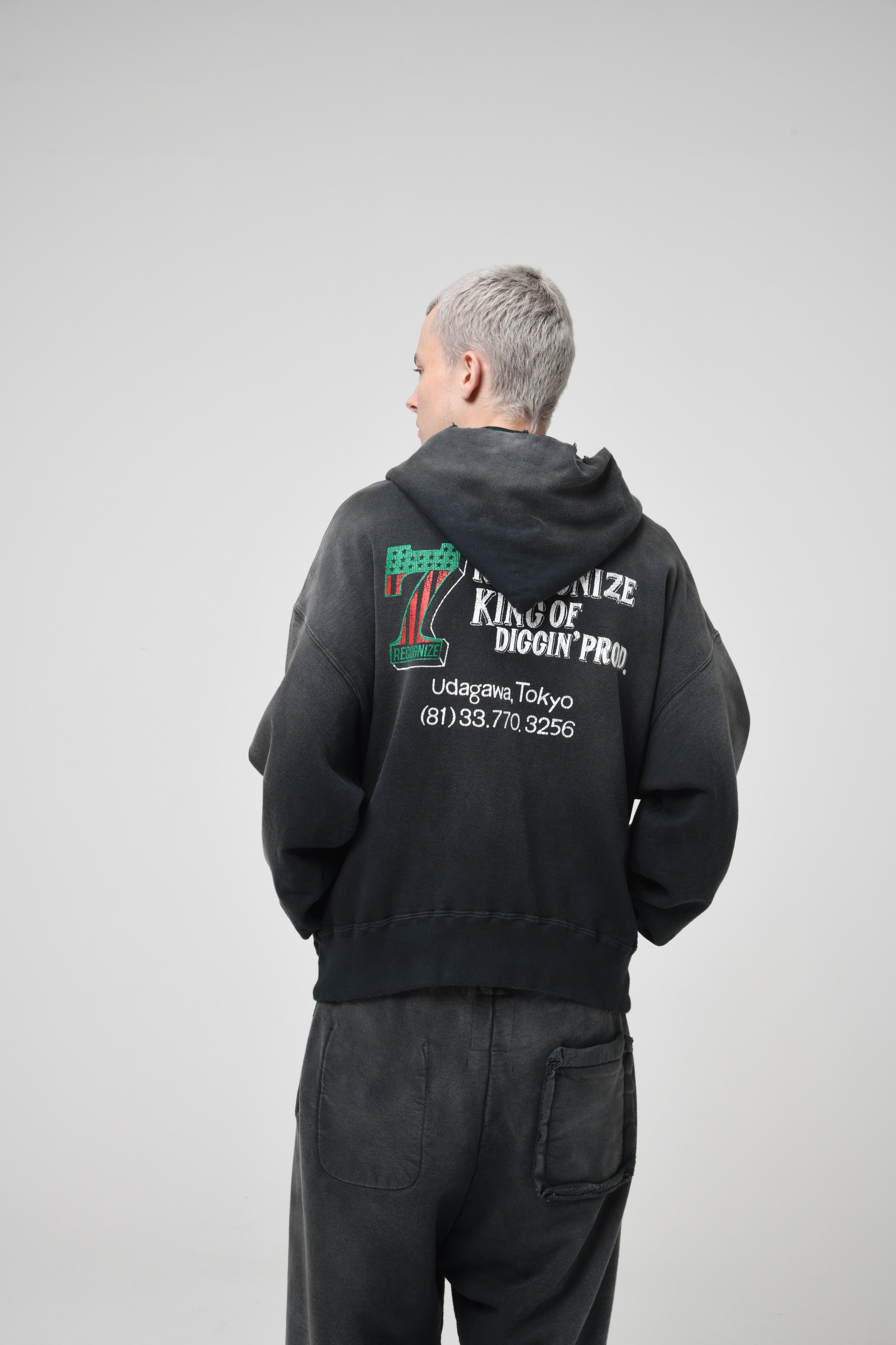 A collaboration item with RECOGNIZE, produced by DJ MURO. The No.1 logo is built with “7” (meaning a 7-inch record) and MURO’s signature African American flag color scheme. On the back, a graphic inspired by the shopwear from MURO’s SAVAGE era is placed alongside the actual store phone number, capturing a real sense of time. The body is designed from a 1950s separate-pocket zip hoodie. Made with heavyweight, non-brushed French terry, layered with BOW WOW’s signature realistic vintage processing to recreate the rugged presence and expression of a garment worn for years.