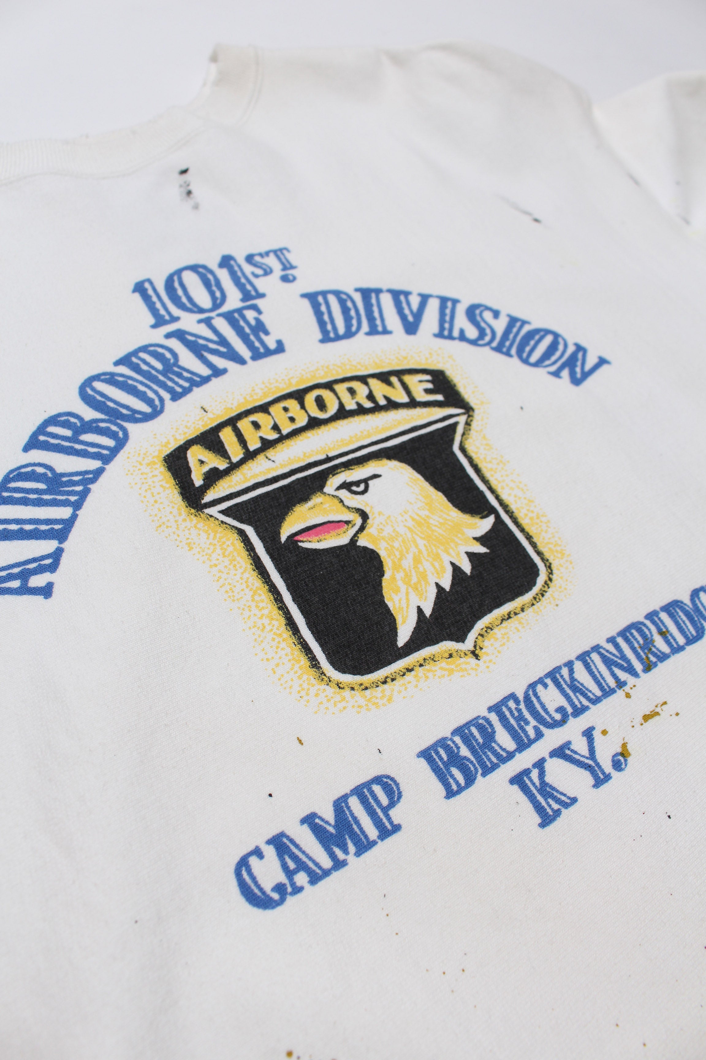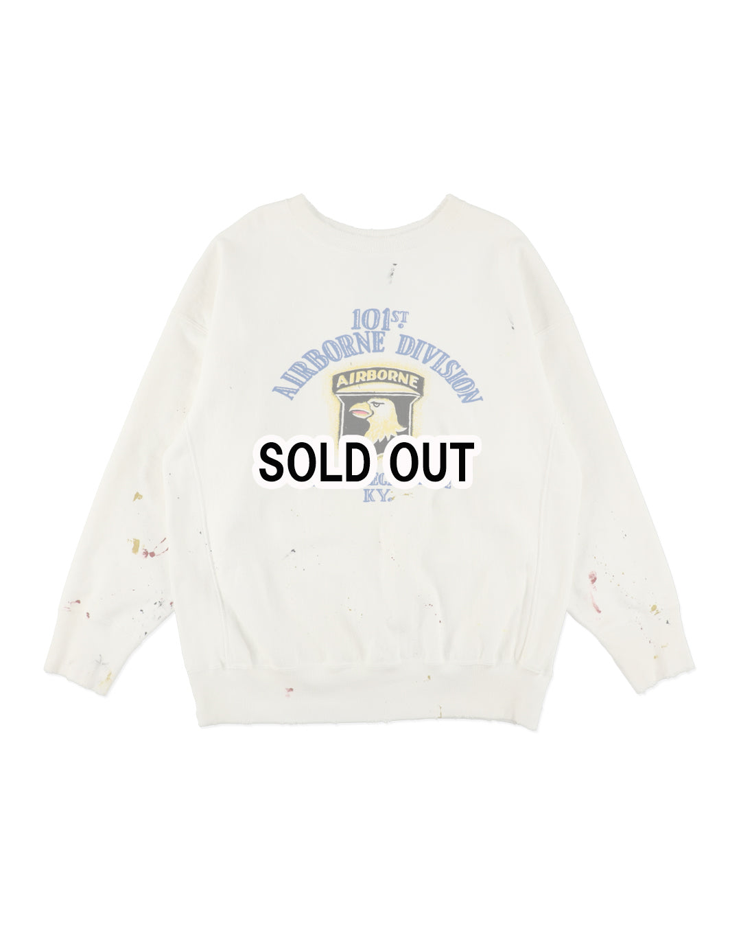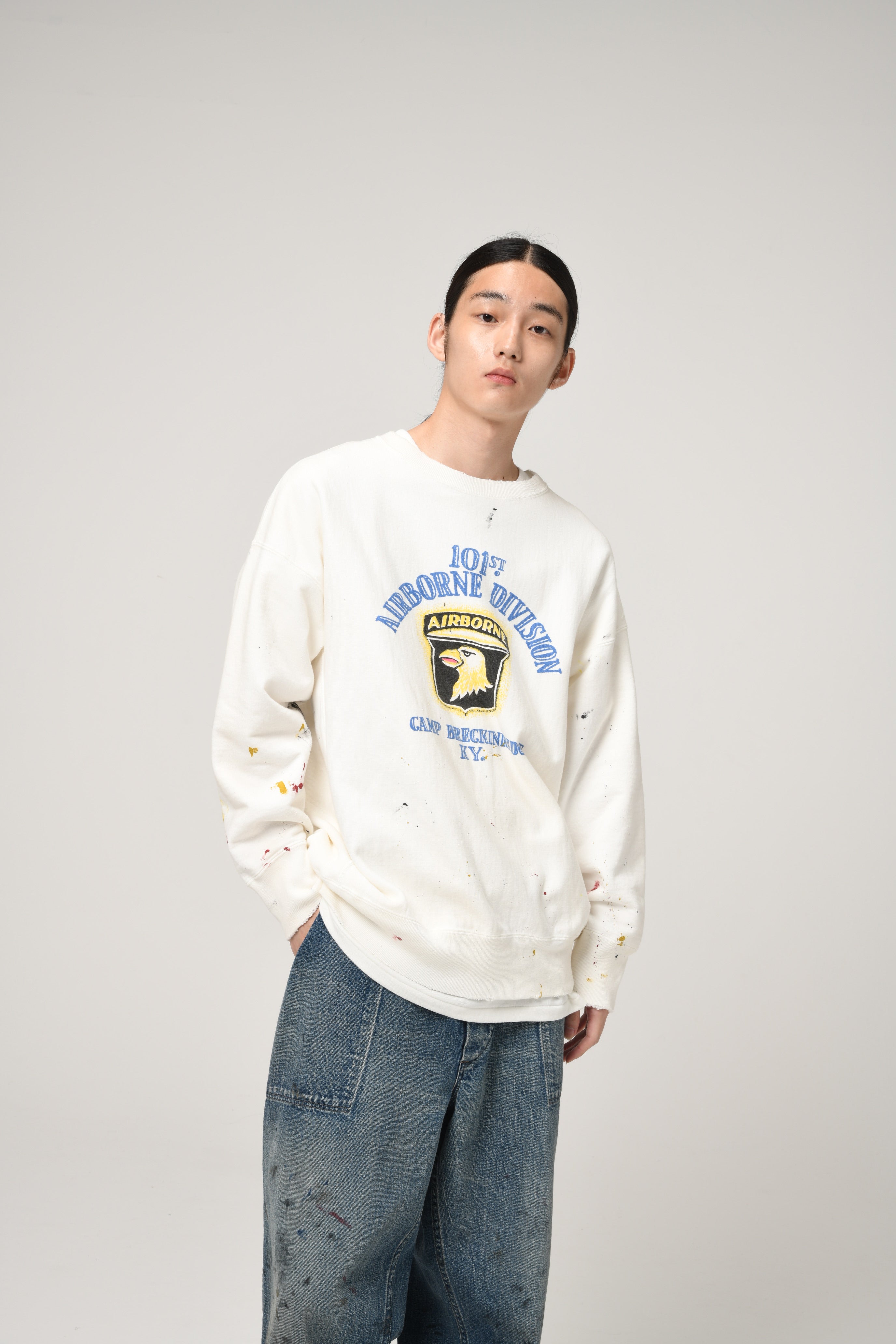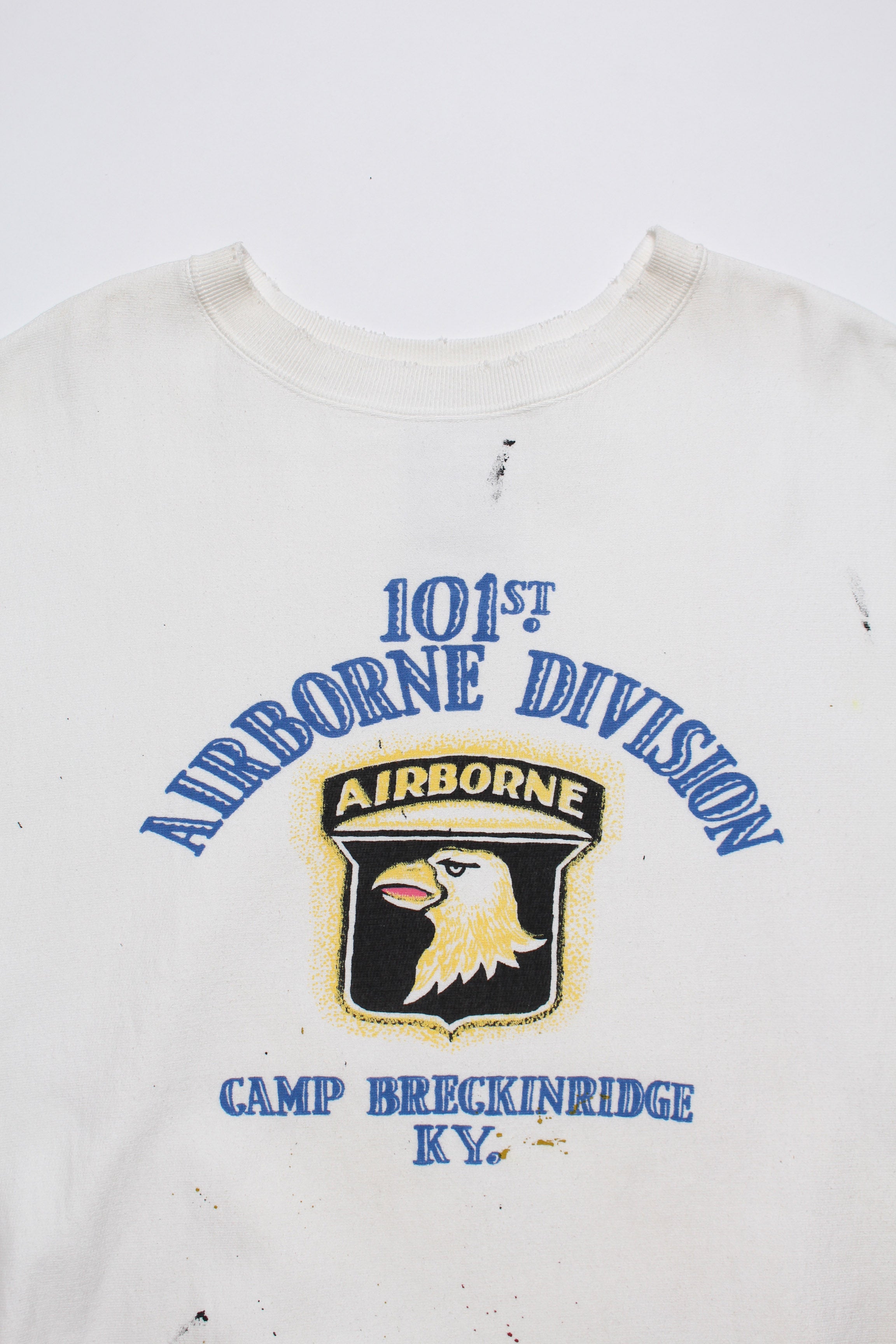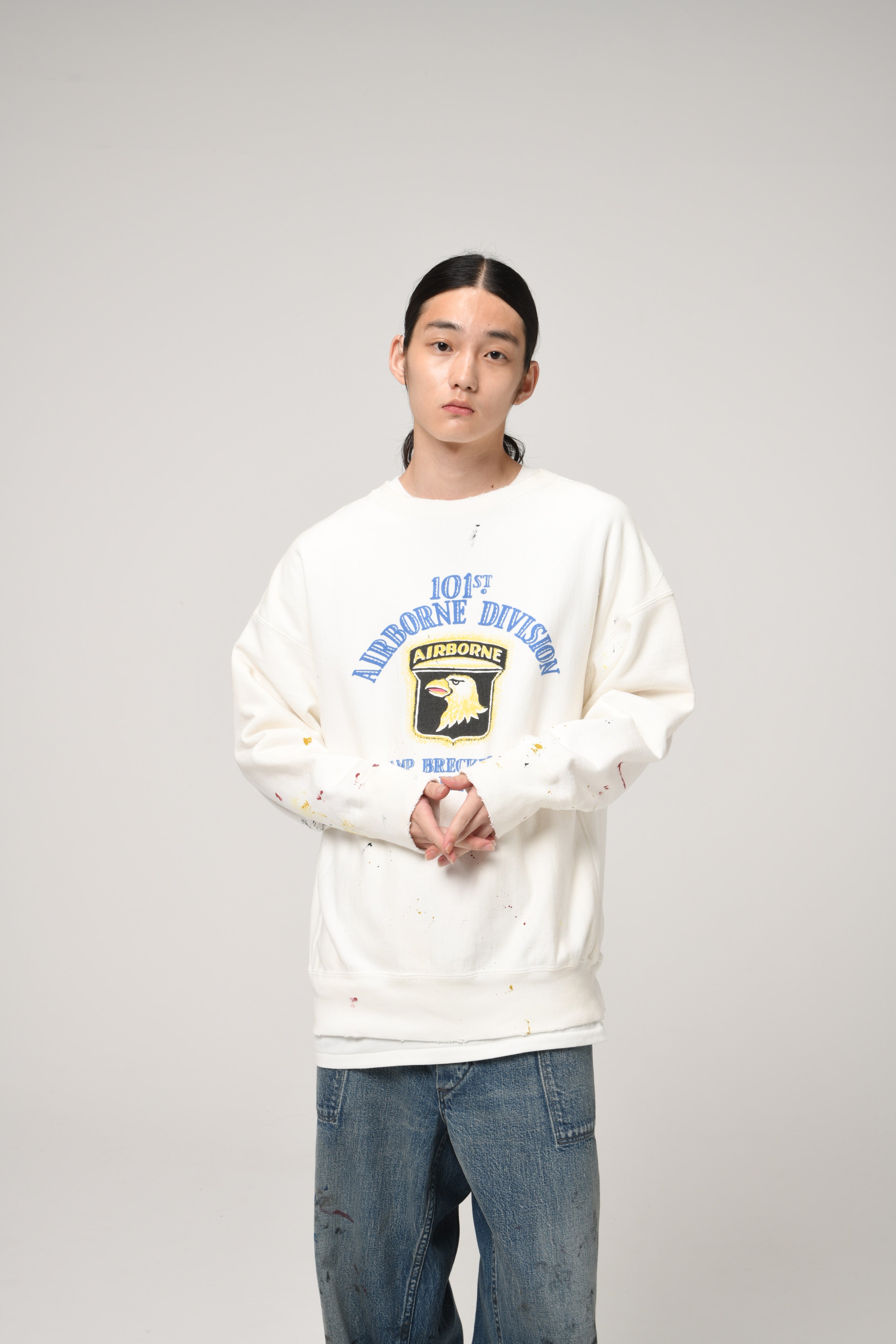 A sweatshirt centered on a 101st Airborne Division print, imagined as a piece truly worn and used within the unit. Aged finishing adds realism—time layered through wear—capturing both pride and utility. Set on a body informed by pre-1960s vintage crew sweat design, allowing military symbolism to blend naturally with old-sweat texture.
