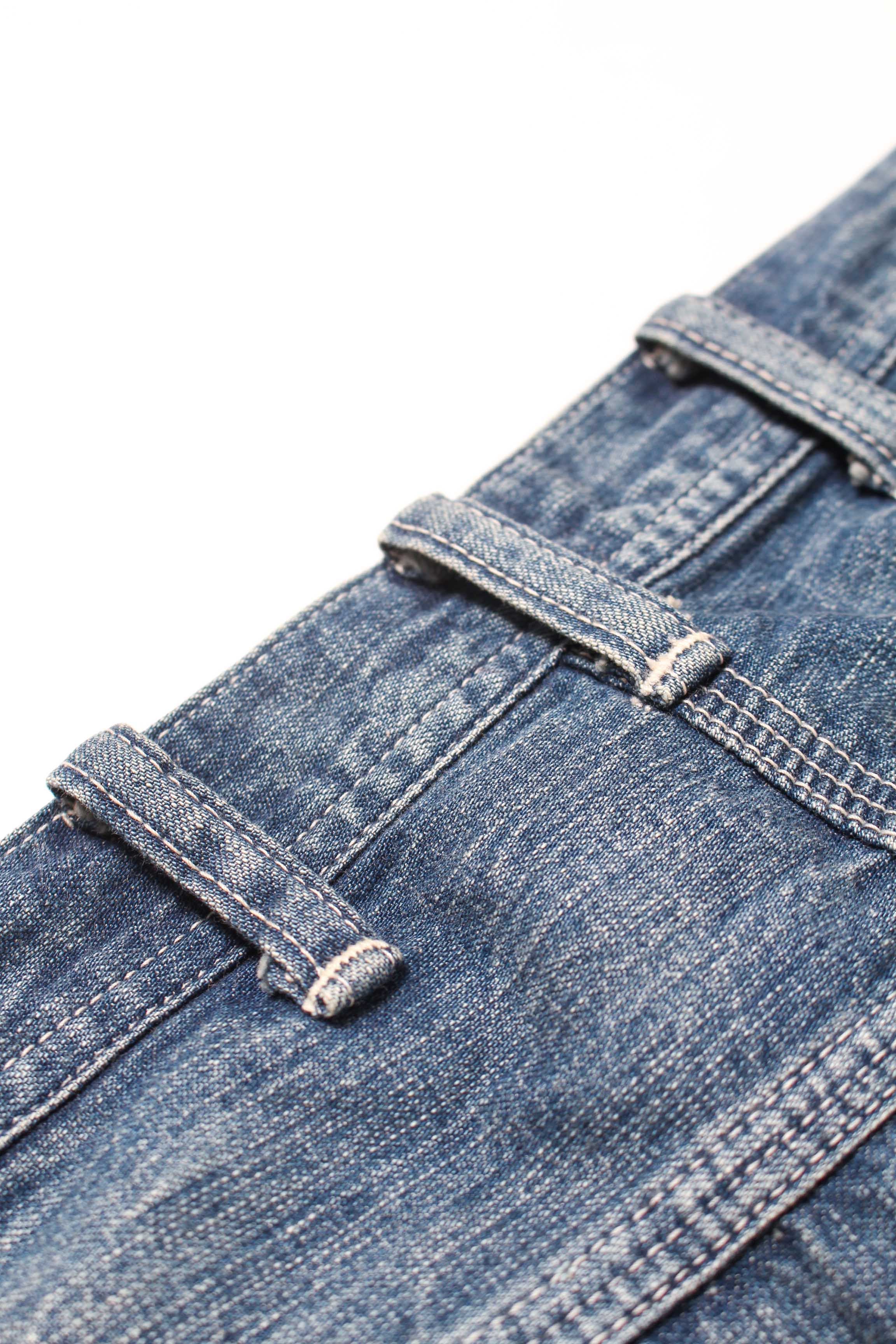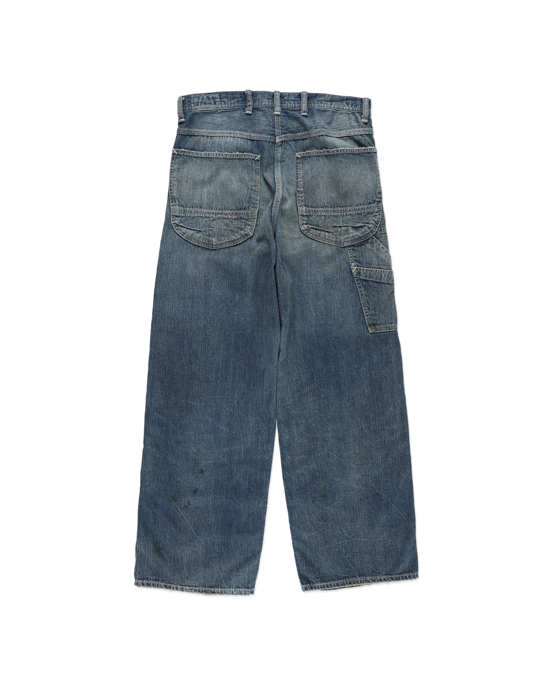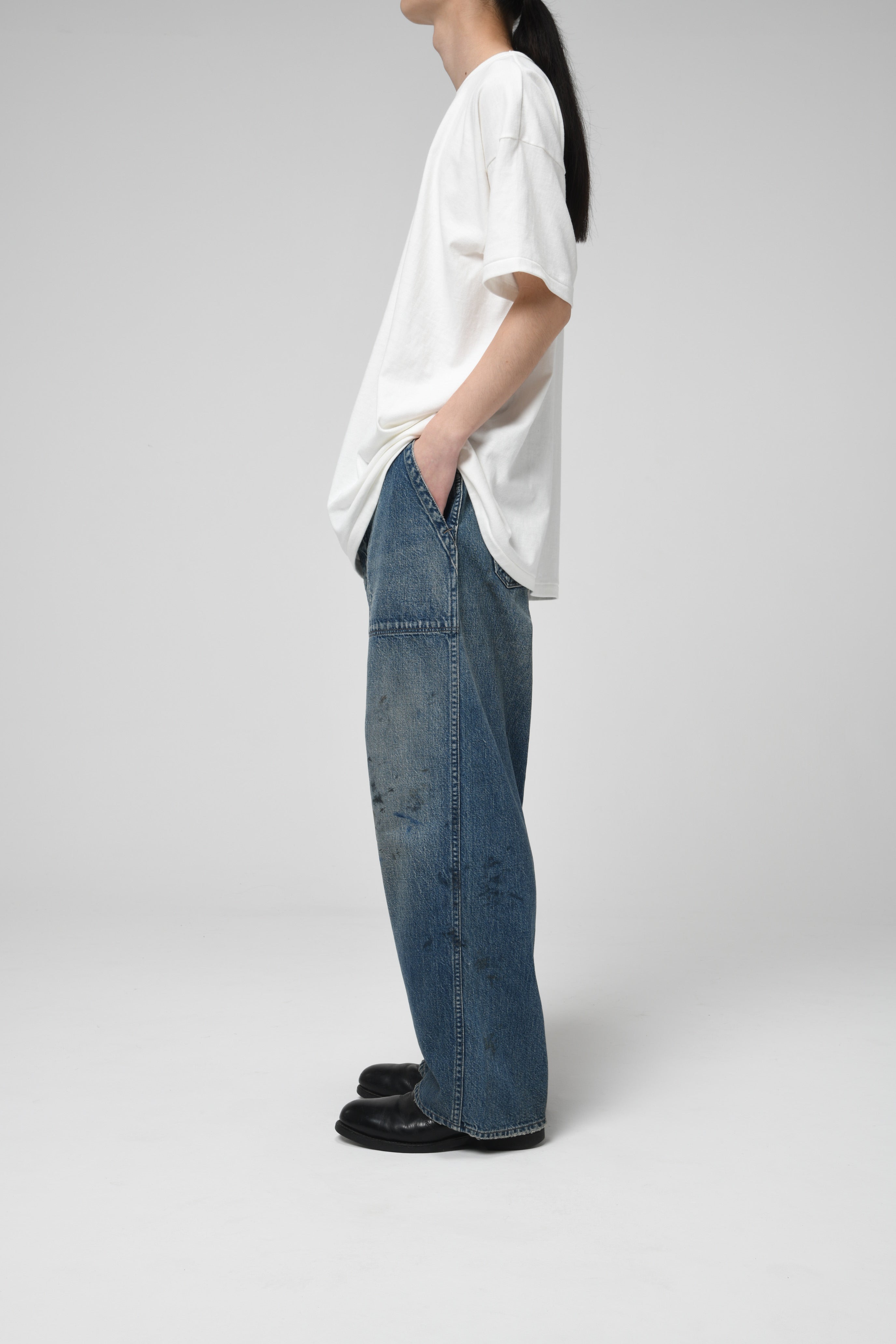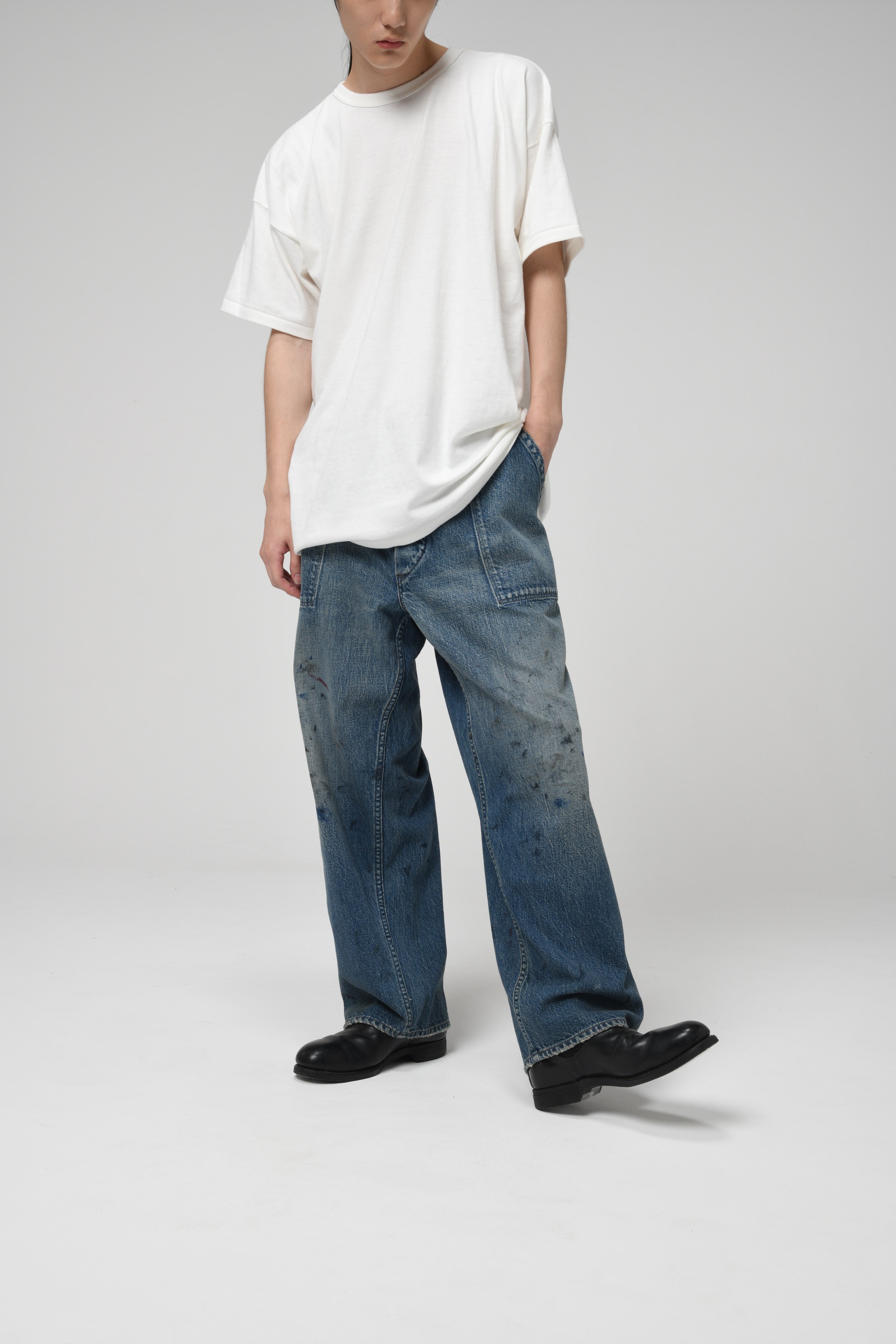 40年代のワーキングペインターパンツをディティールに、設計した一本。ペインター特有の無骨な構造やポケットワークを踏まえ、実用性の匂いをそのまま残している。 擦れ、退色、汚れが重なった加工表現に加え、破れやリペア痕まで踏み込んだ表情づくりで、長年使い込まれてきたリアルな佇まいを再現。ブランドならではの、唯一無二の加工リペアデザインが際立つ仕上がりになっている。
