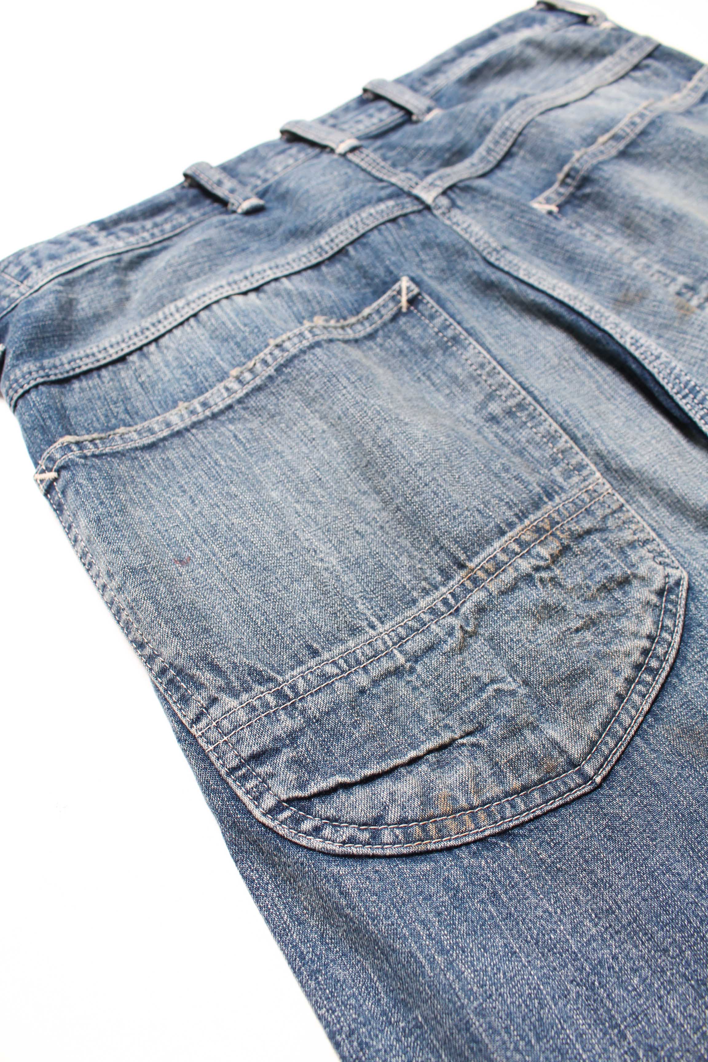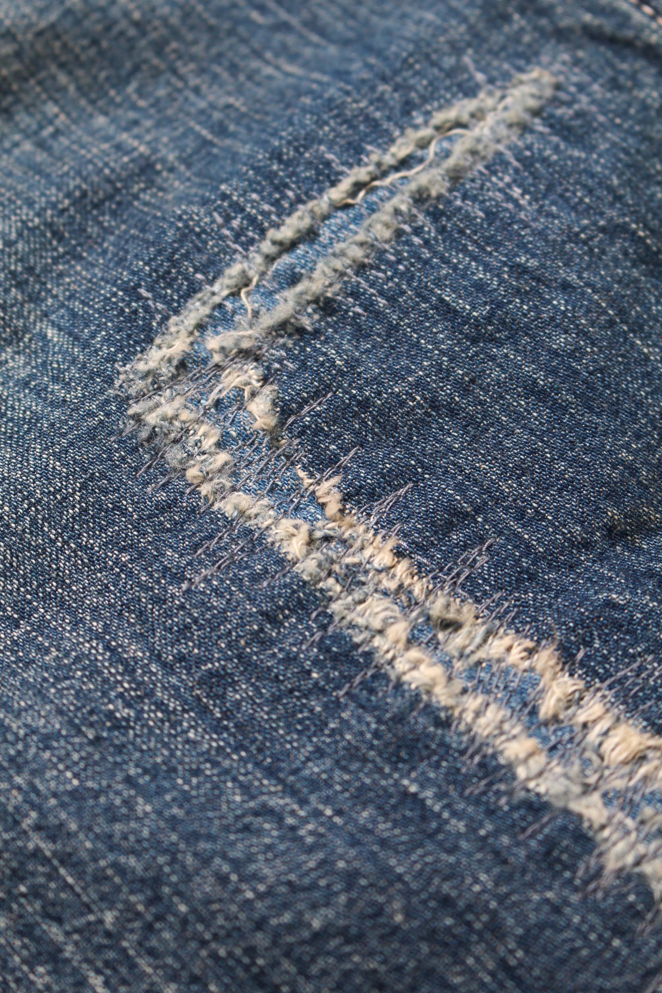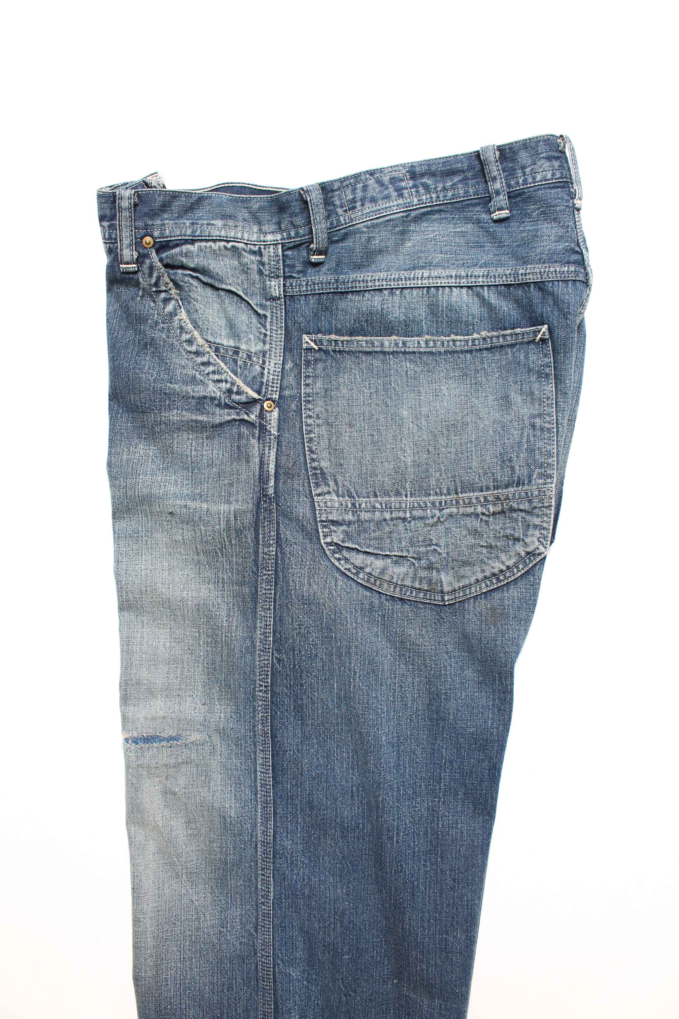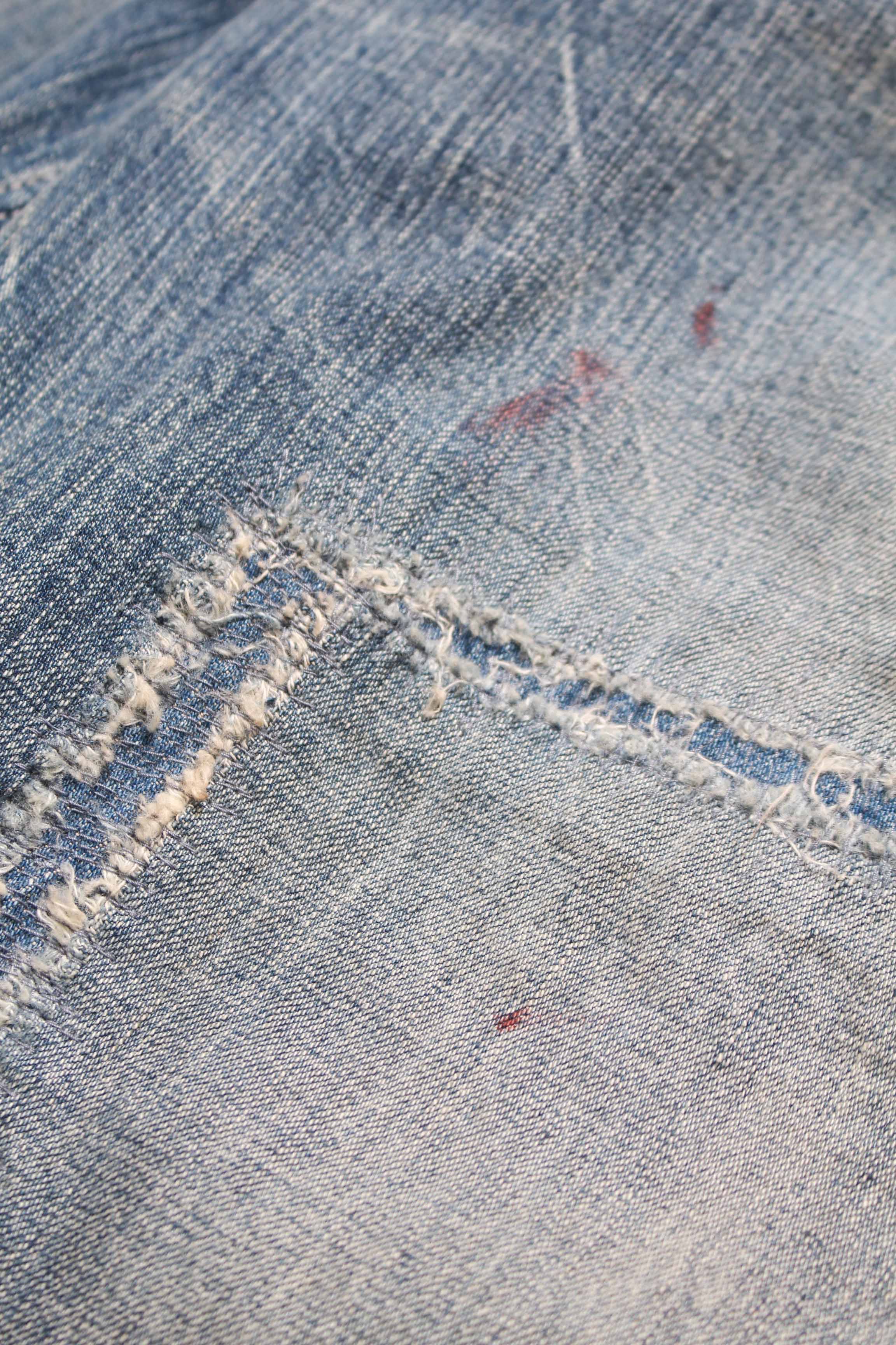 Designed with 1940s painter pant details, preserving rugged structure and pocket work. Aging layers abrasion, fading, grime, plus tears and repair traces for authentic long-use realism. A one-of-a-kind processed-and-repaired expression stands out as the key feature.