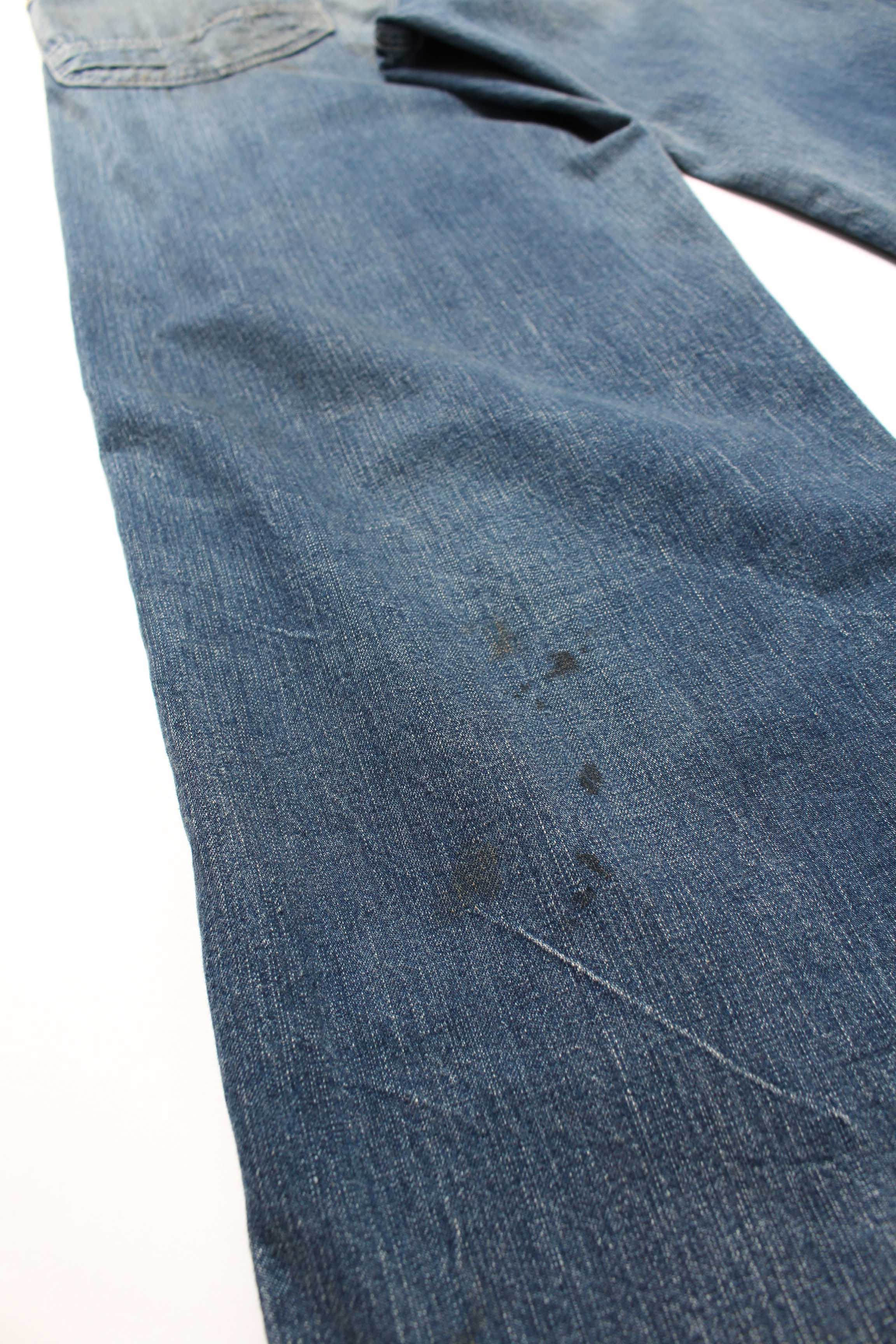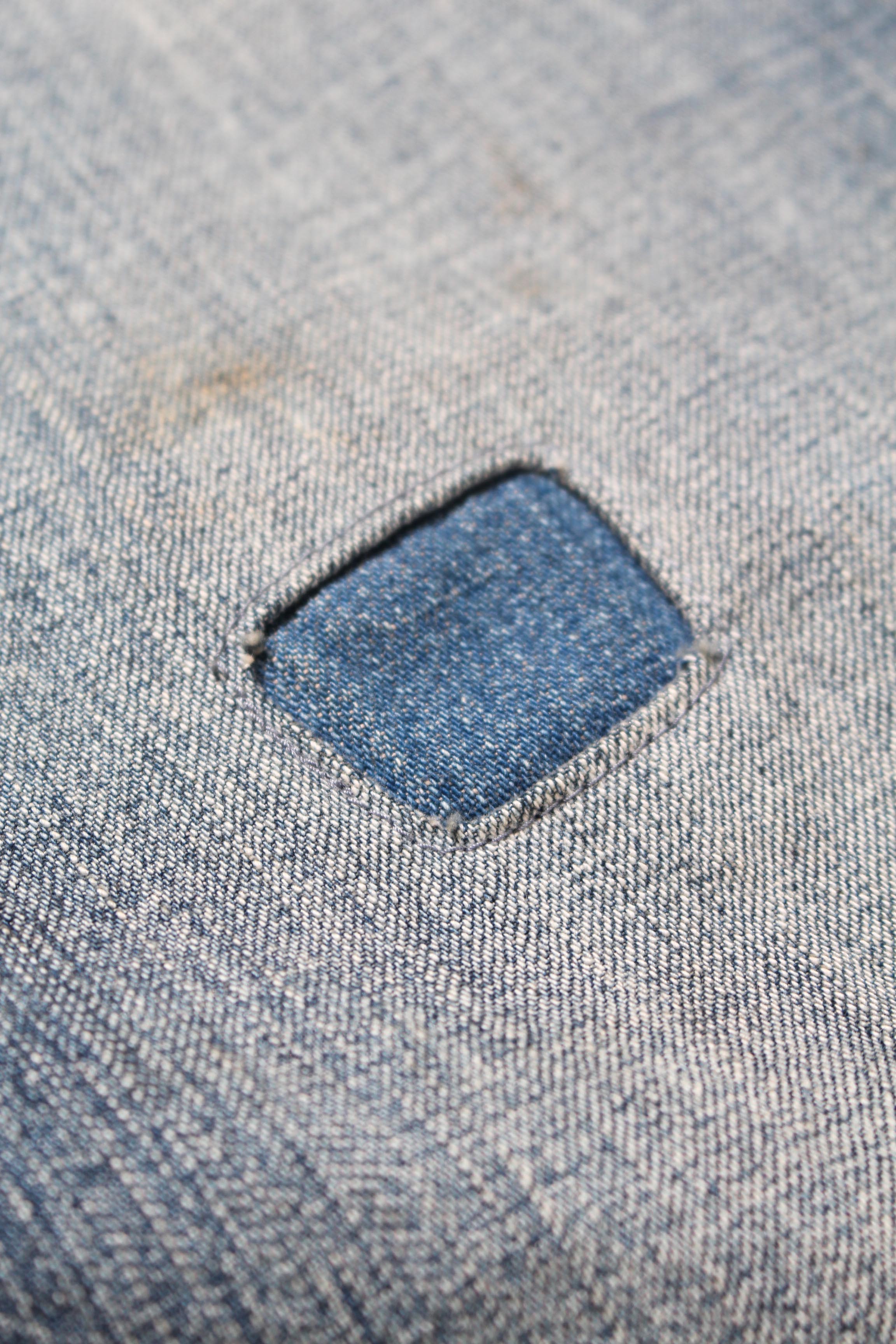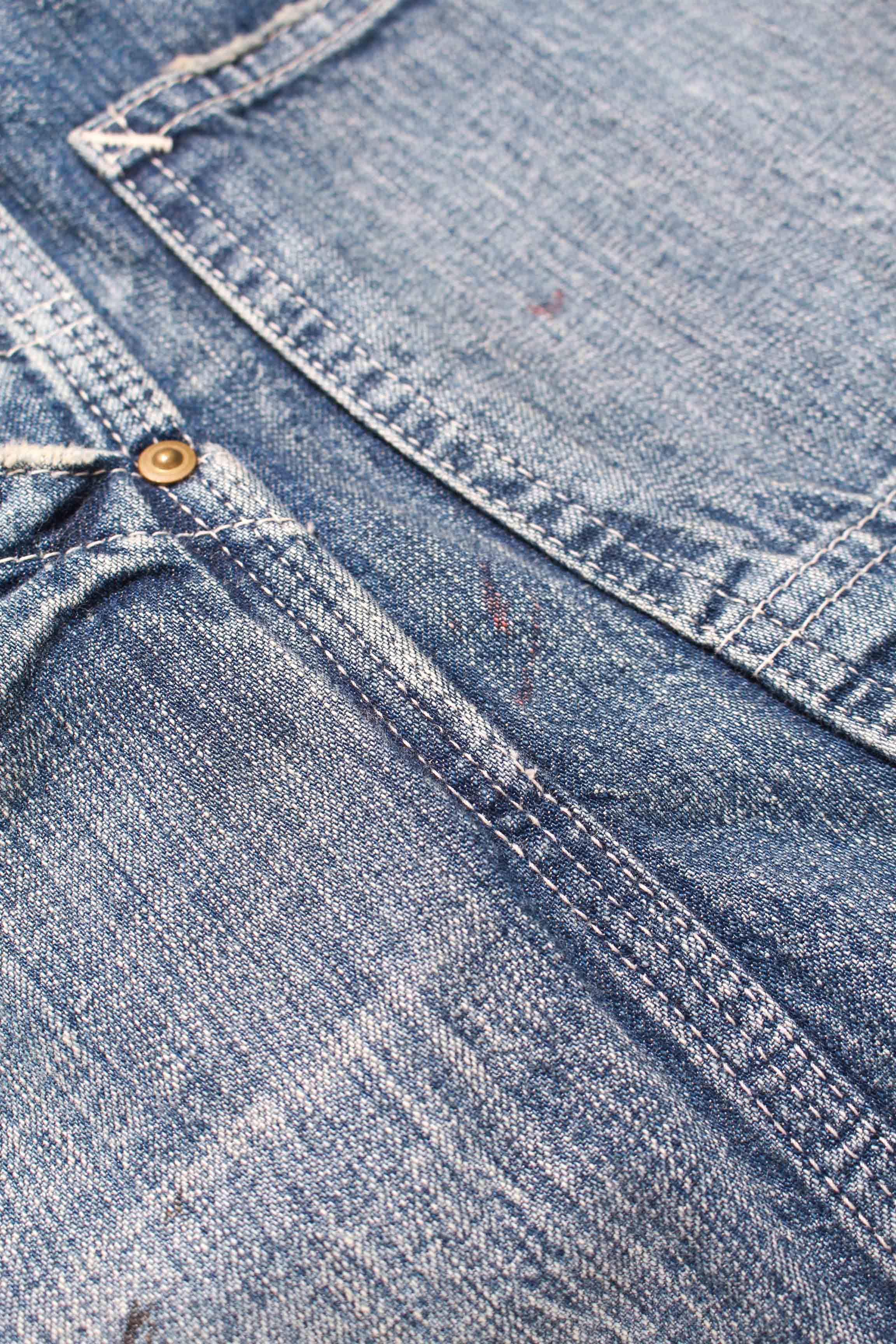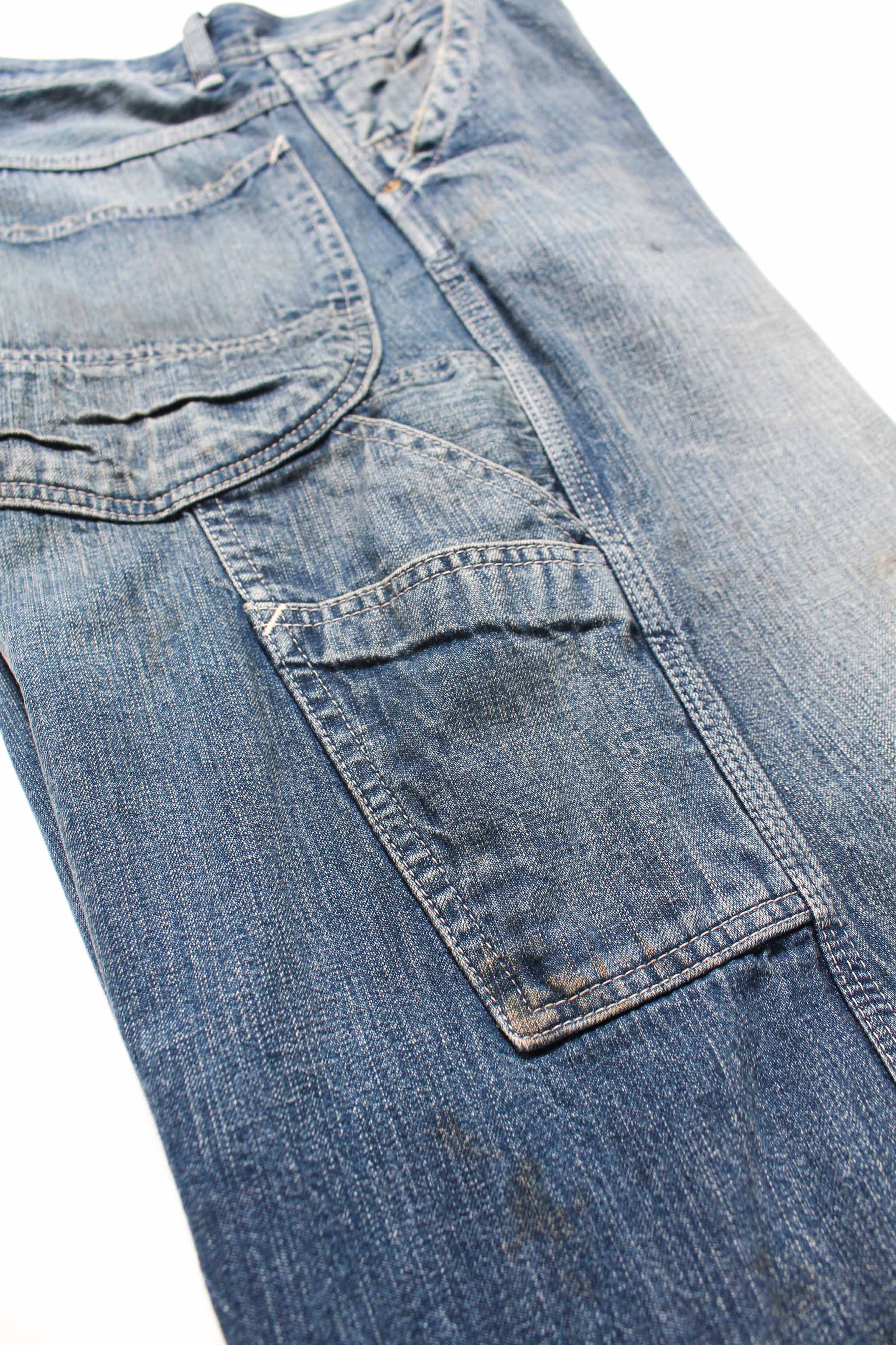 Designed with 1940s painter pant details, preserving rugged structure and pocket work. Aging layers abrasion, fading, grime, plus tears and repair traces for authentic long-use realism. A one-of-a-kind processed-and-repaired expression stands out as the key feature.