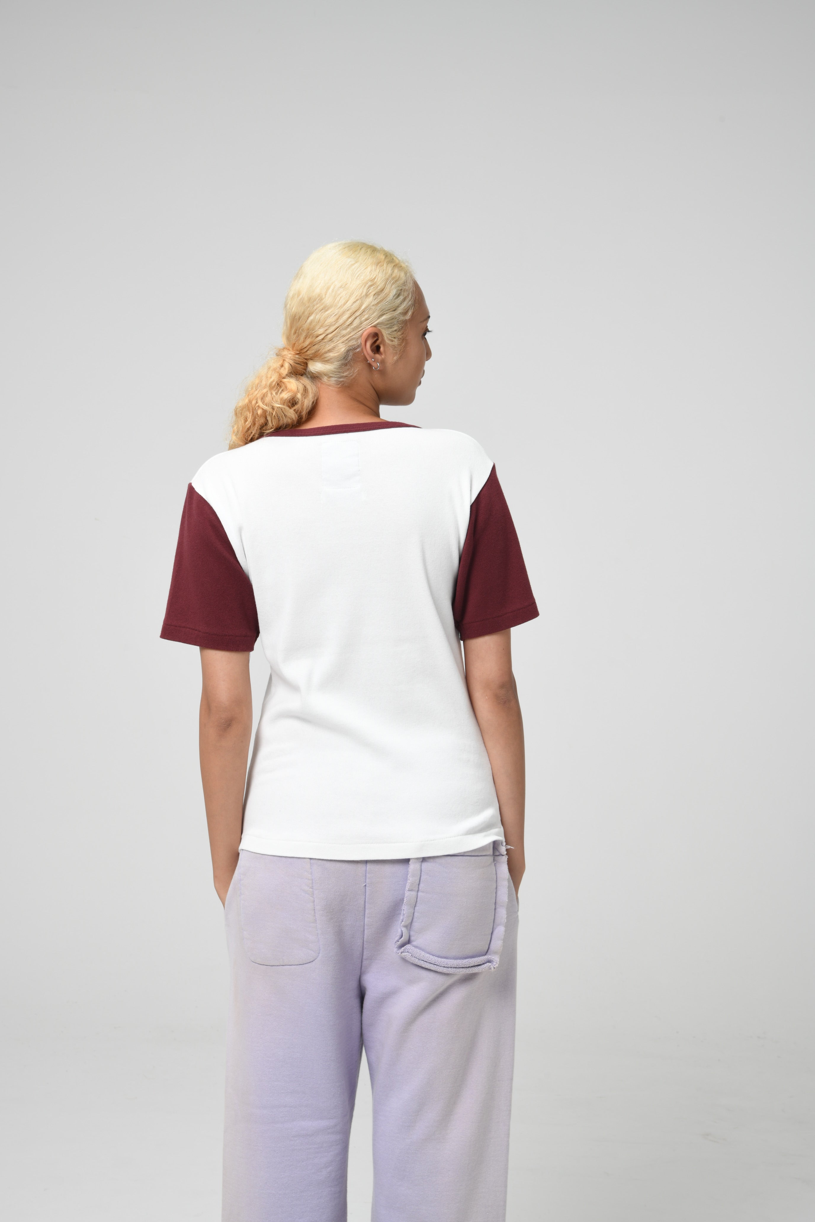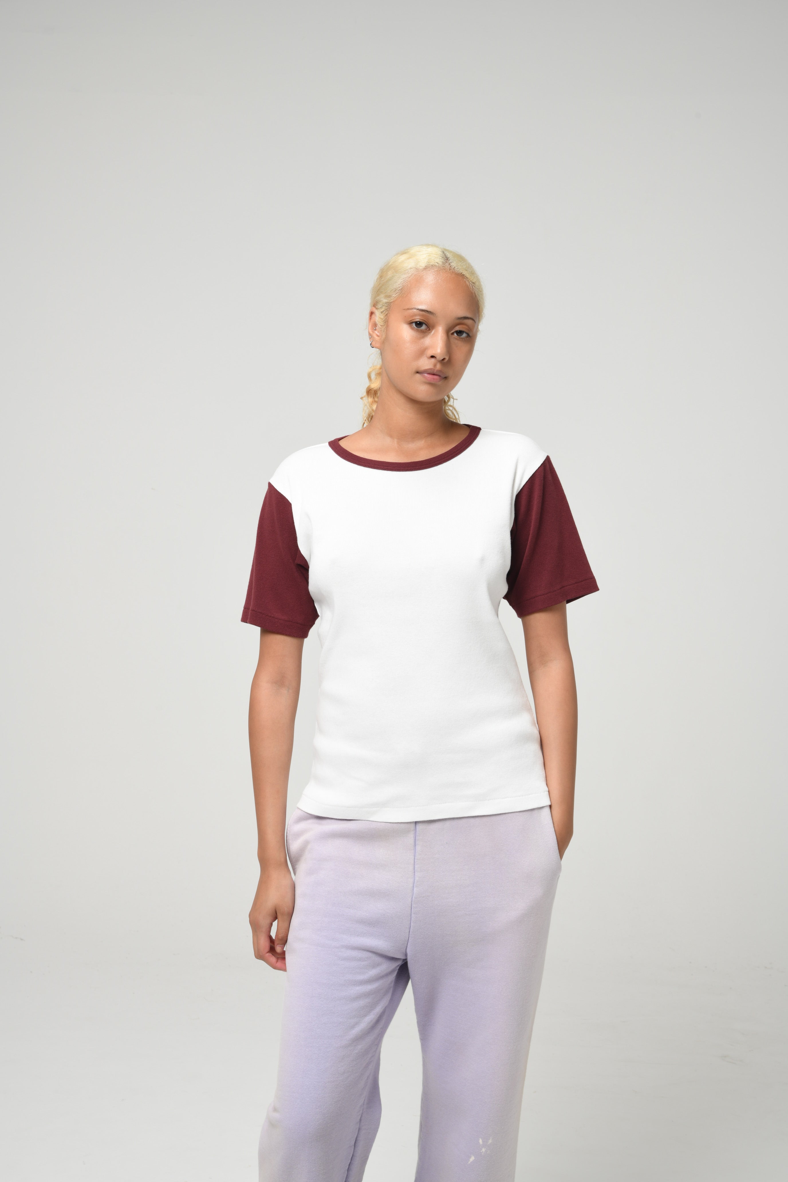A cut-and-sew piece made from an original rib knit developed from long-history underwear rib fabric, offering strong stretch and recovery so it fits the body without looking sloppy. Designed as a T-shirt with appropriate sizing and silhouette while respecting the functional roots of underwear. A two-tone layout inspired by sports underwear carries the innerwear-derived design directly into the piece.