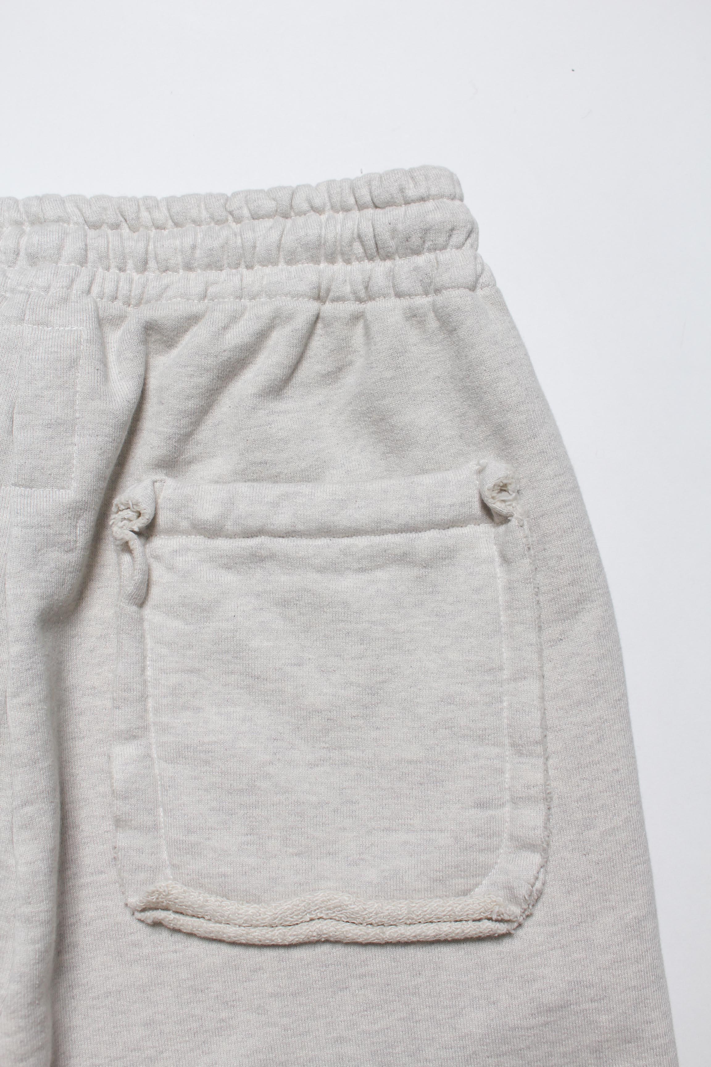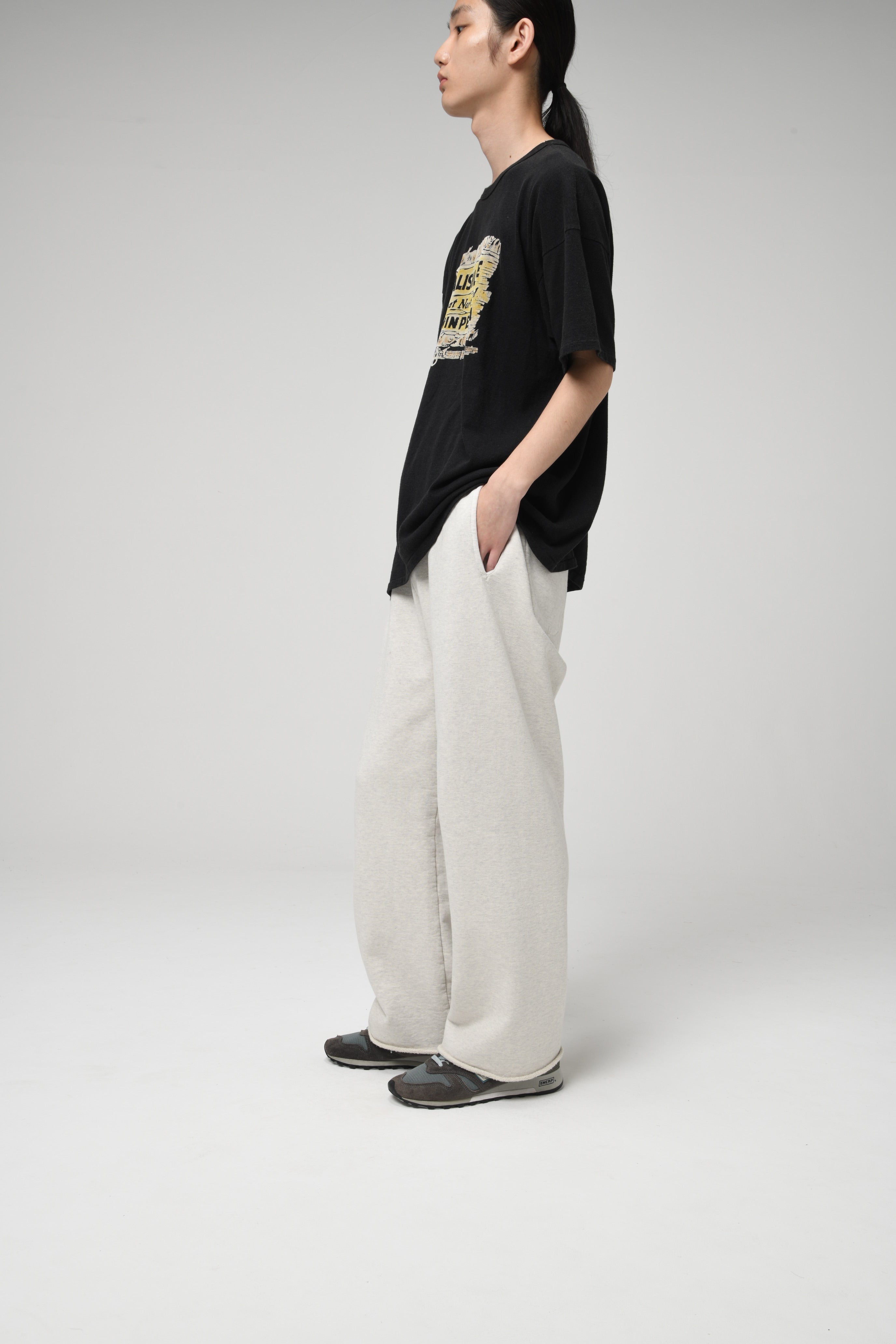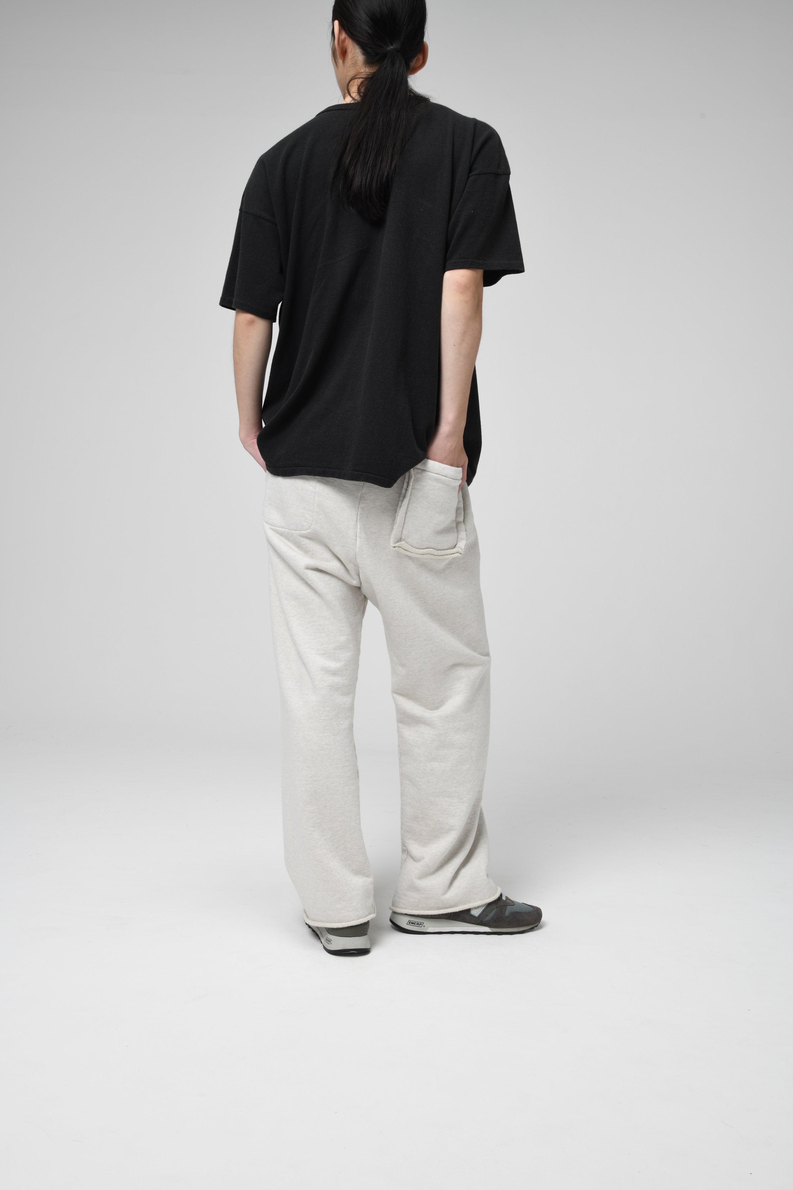 起毛無しのオールシーズン対応厚地裏毛を使用したスウェットパンツ。特別な編み機が生み出すヴィンテージの質感を活かし、ラフさの中に芯のある表情を残している。 股上を深く取り、スラックスのようなラインを意識したシルエットで設計。スウェットでありながら、だらしなく見えないバランスに仕上げている。 裾は切りっ放し仕様とし、未完成感と荒さをあえて残すことで、古いスウェット特有の空気感と違和感を表現している。
