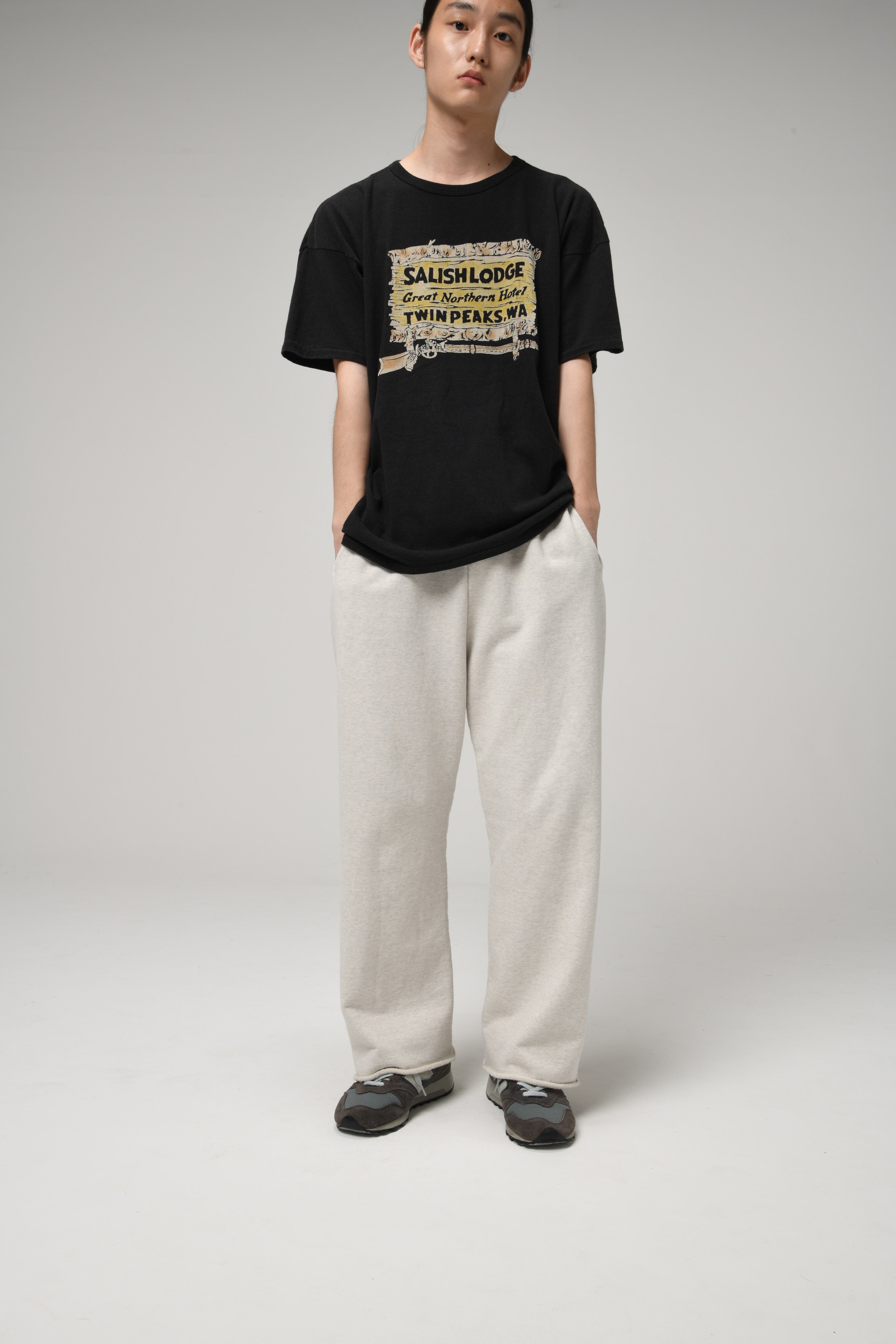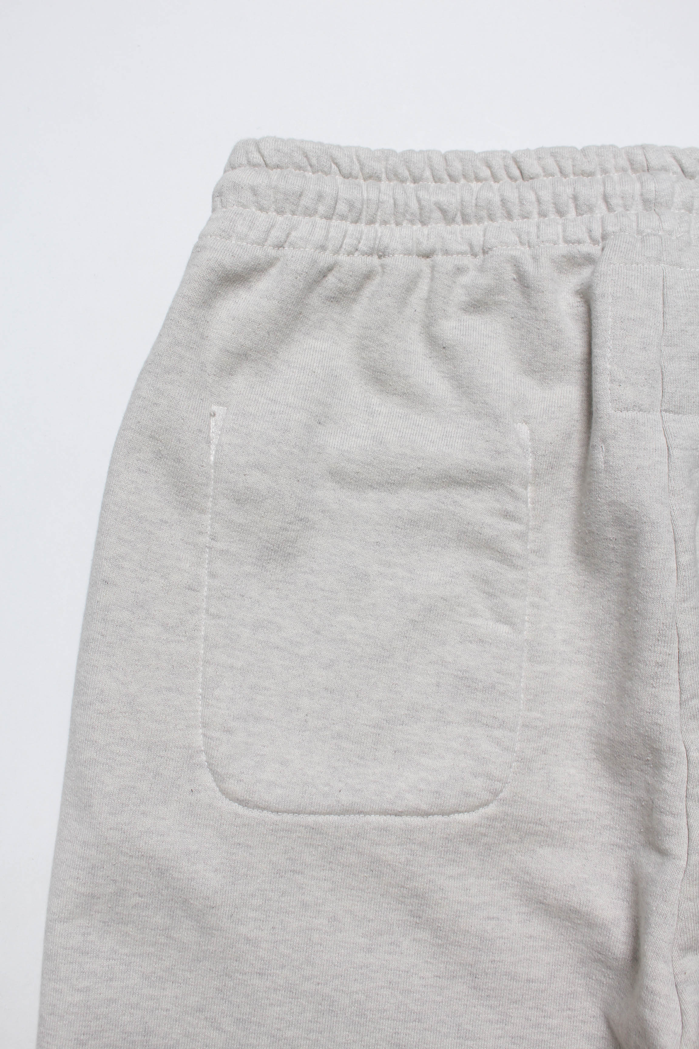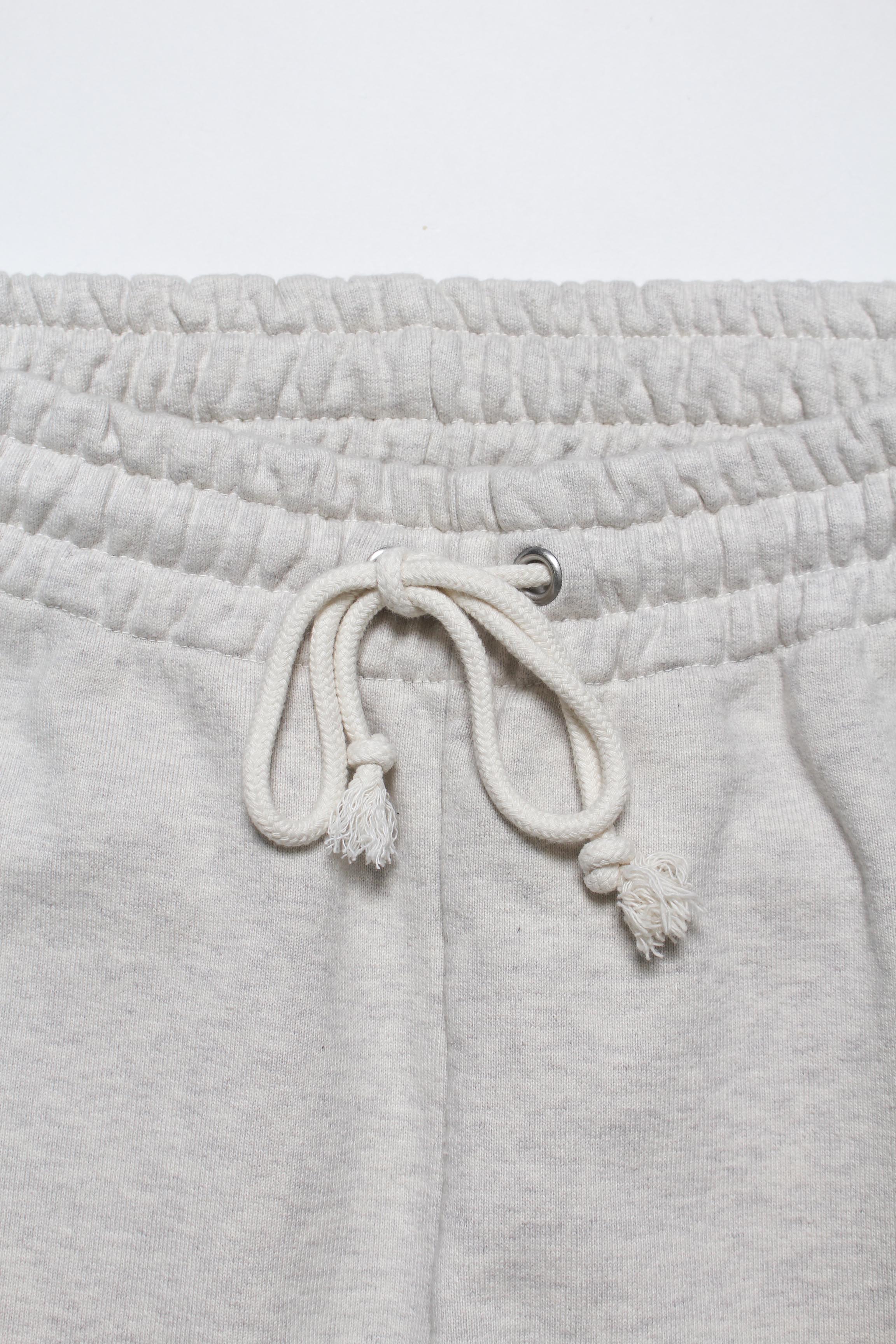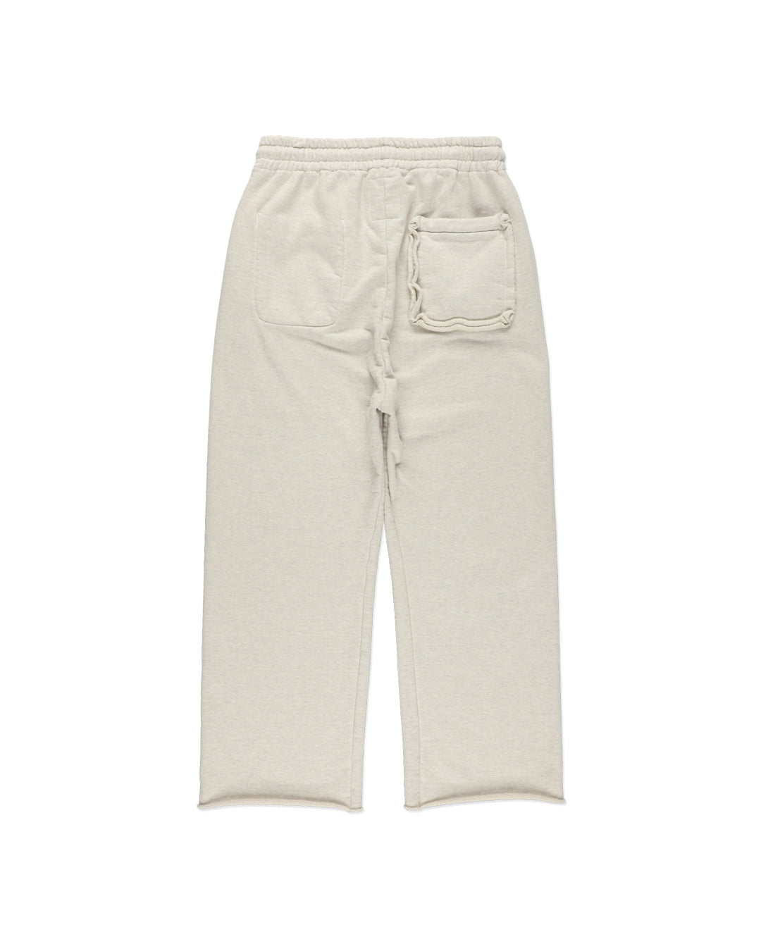 起毛無しのオールシーズン対応厚地裏毛を使用したスウェットパンツ。特別な編み機が生み出すヴィンテージの質感を活かし、ラフさの中に芯のある表情を残している。 股上を深く取り、スラックスのようなラインを意識したシルエットで設計。スウェットでありながら、だらしなく見えないバランスに仕上げている。 裾は切りっ放し仕様とし、未完成感と荒さをあえて残すことで、古いスウェット特有の空気感と違和感を表現している。
