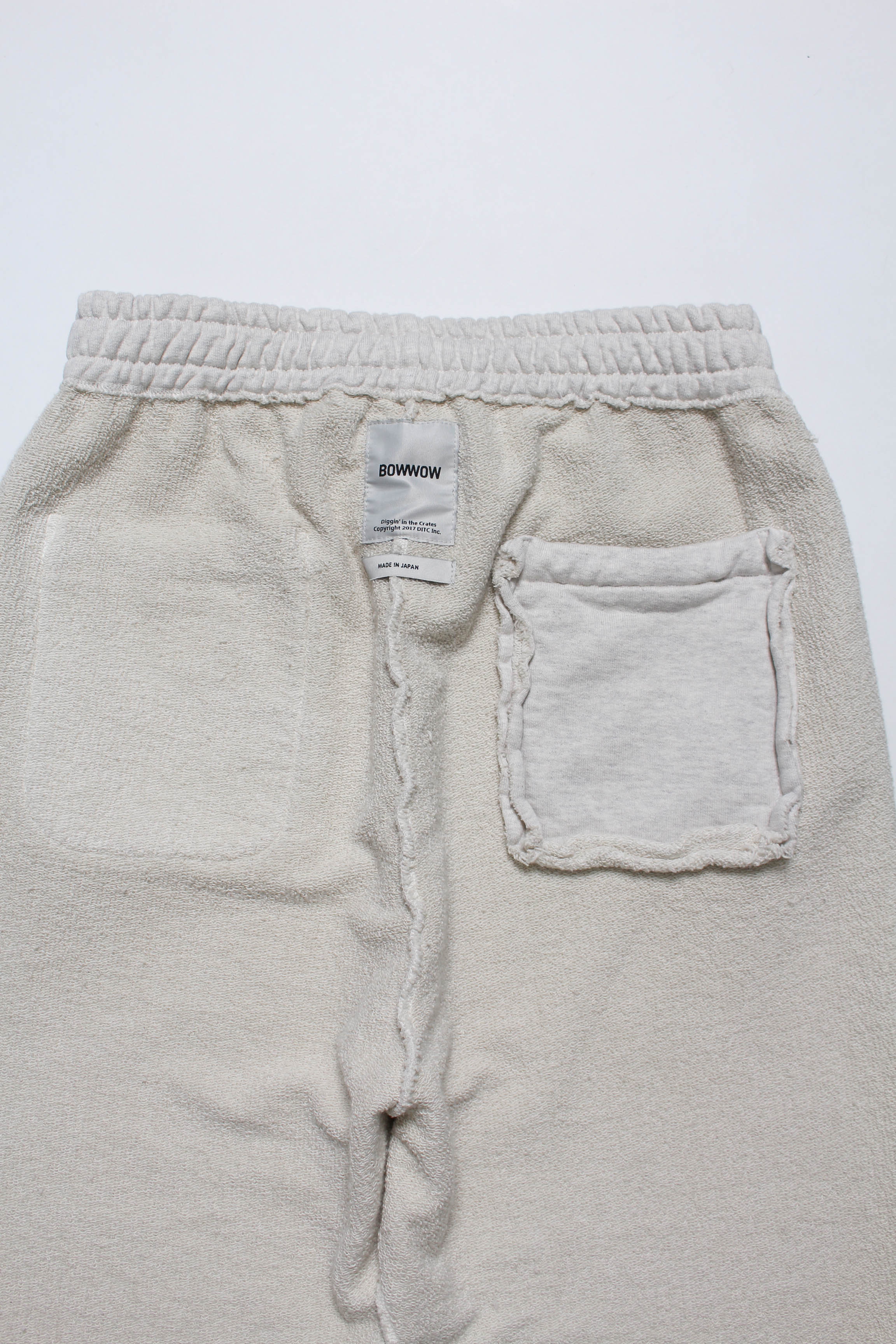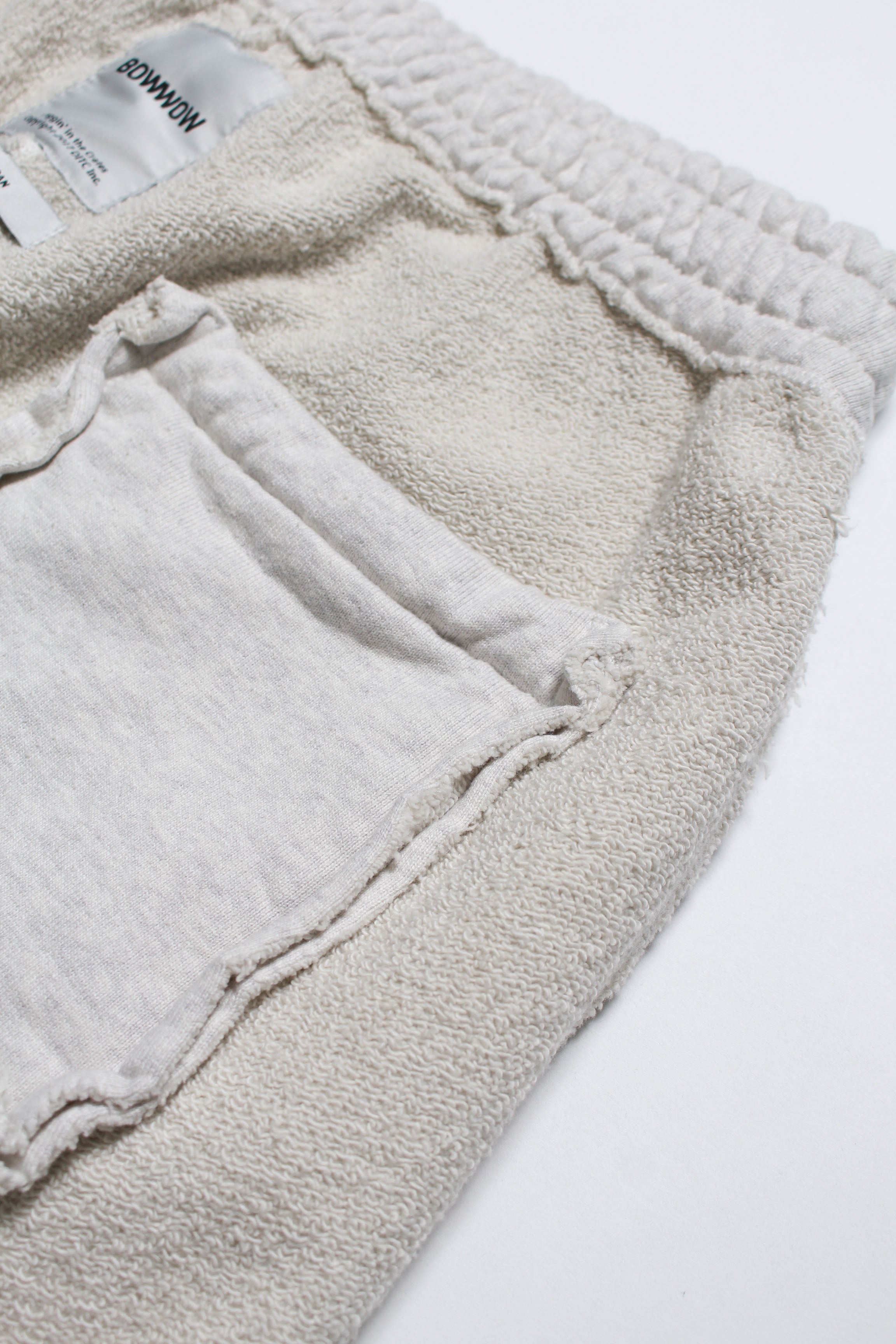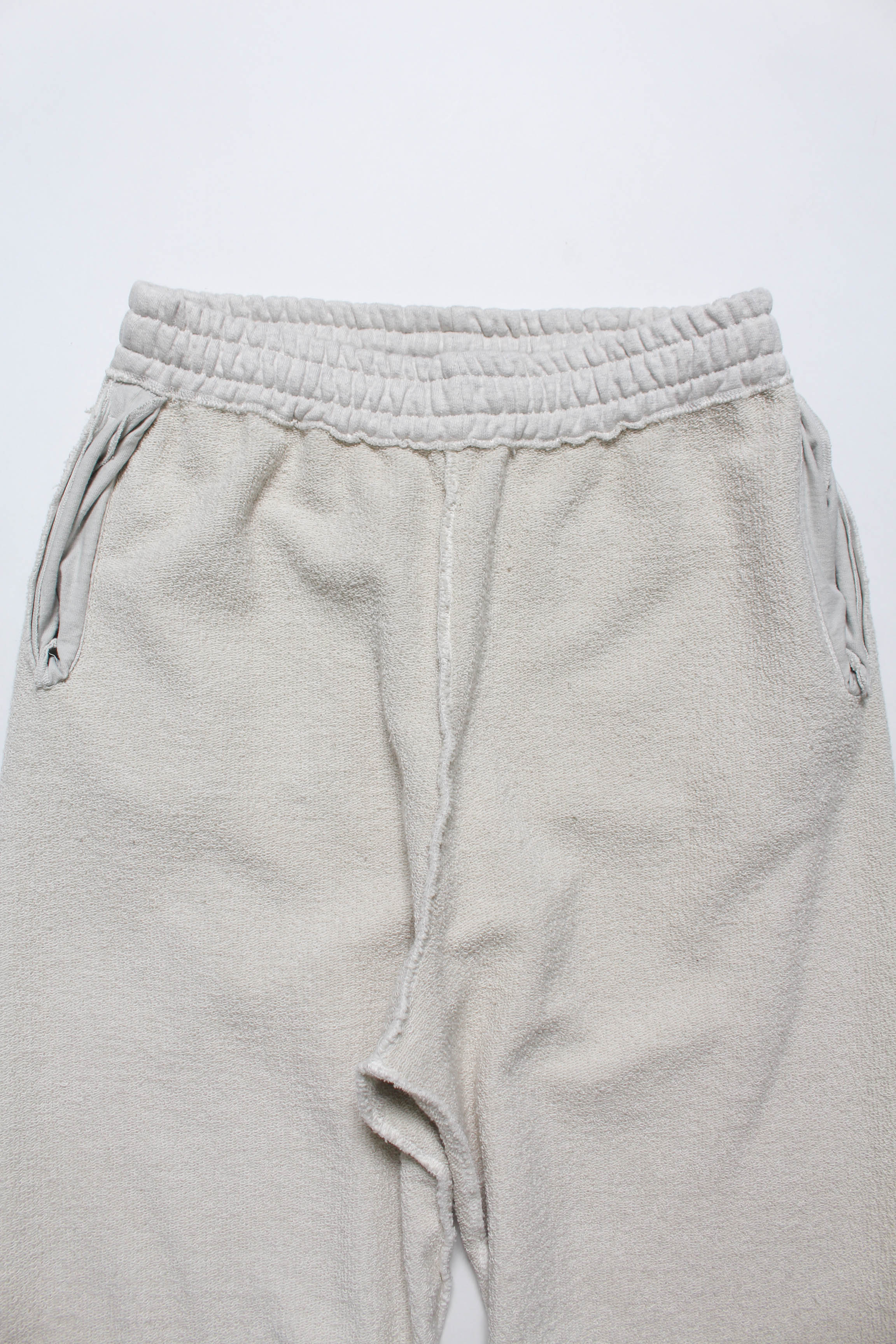 Sweat pants made from heavy, non-brushed, all-season French terry with a vintage-textured surface from a special knitting machine. Designed with a deep rise and a slacks-like line to avoid a sloppy look. Finished with raw-cut hems to intentionally leave a sense of roughness and “unfinished” vintage character.