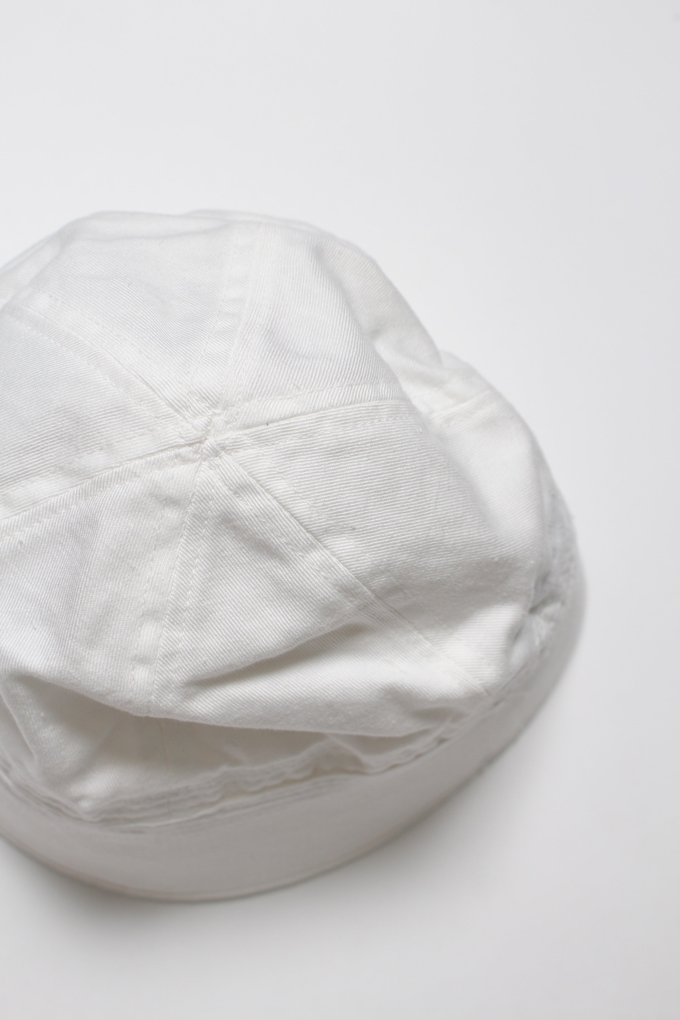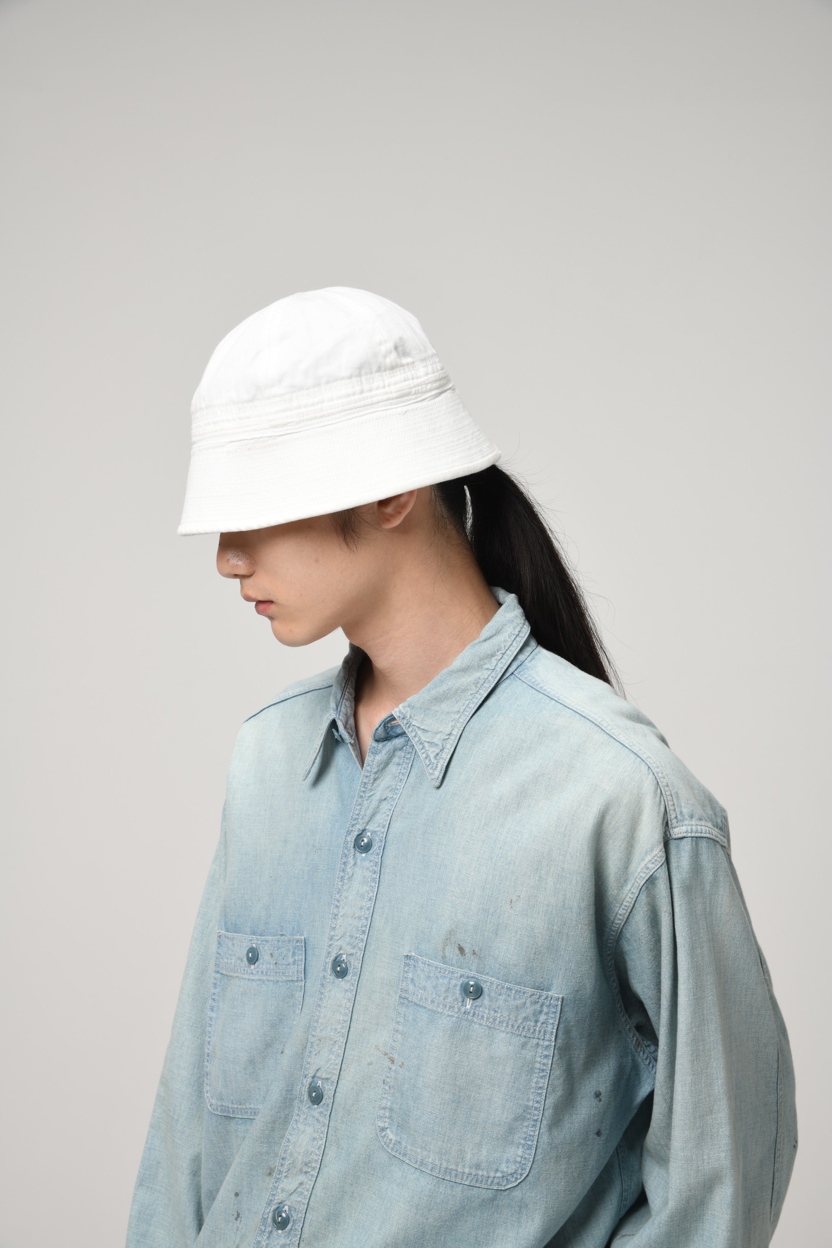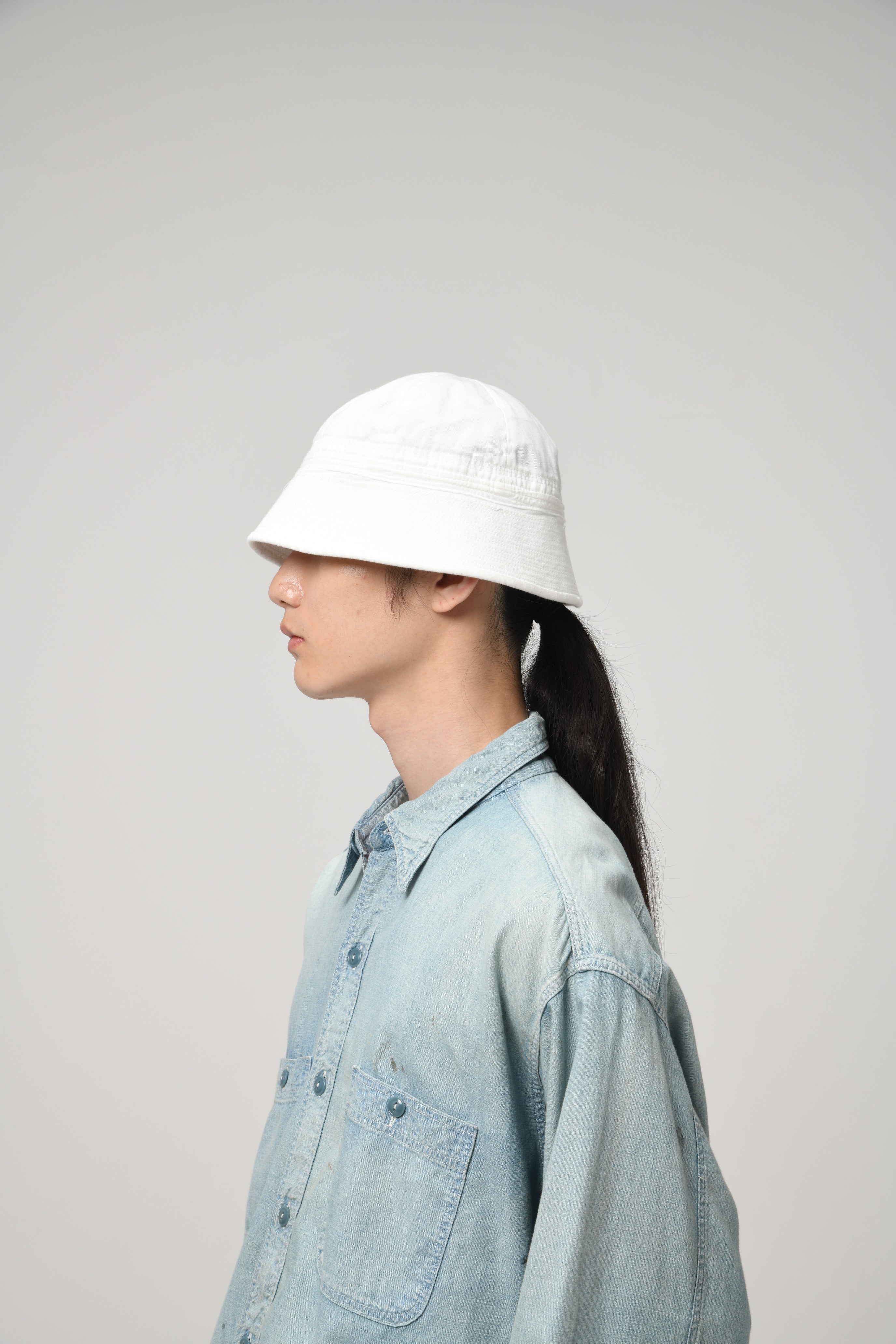 オフホワイトの状態で支給され、そのまま着用されていた40年代US NAVYセーラーハットを背景にした仕様。 甲板作業や屋外業務で使われることを前提とした作業用ヘッドギアならではの、軽さとラフさを残した佇まいが特徴。 日差しを避けるための実用品として使われていた当時の空気感を意識。素のままの表情を活かした仕上がり。
