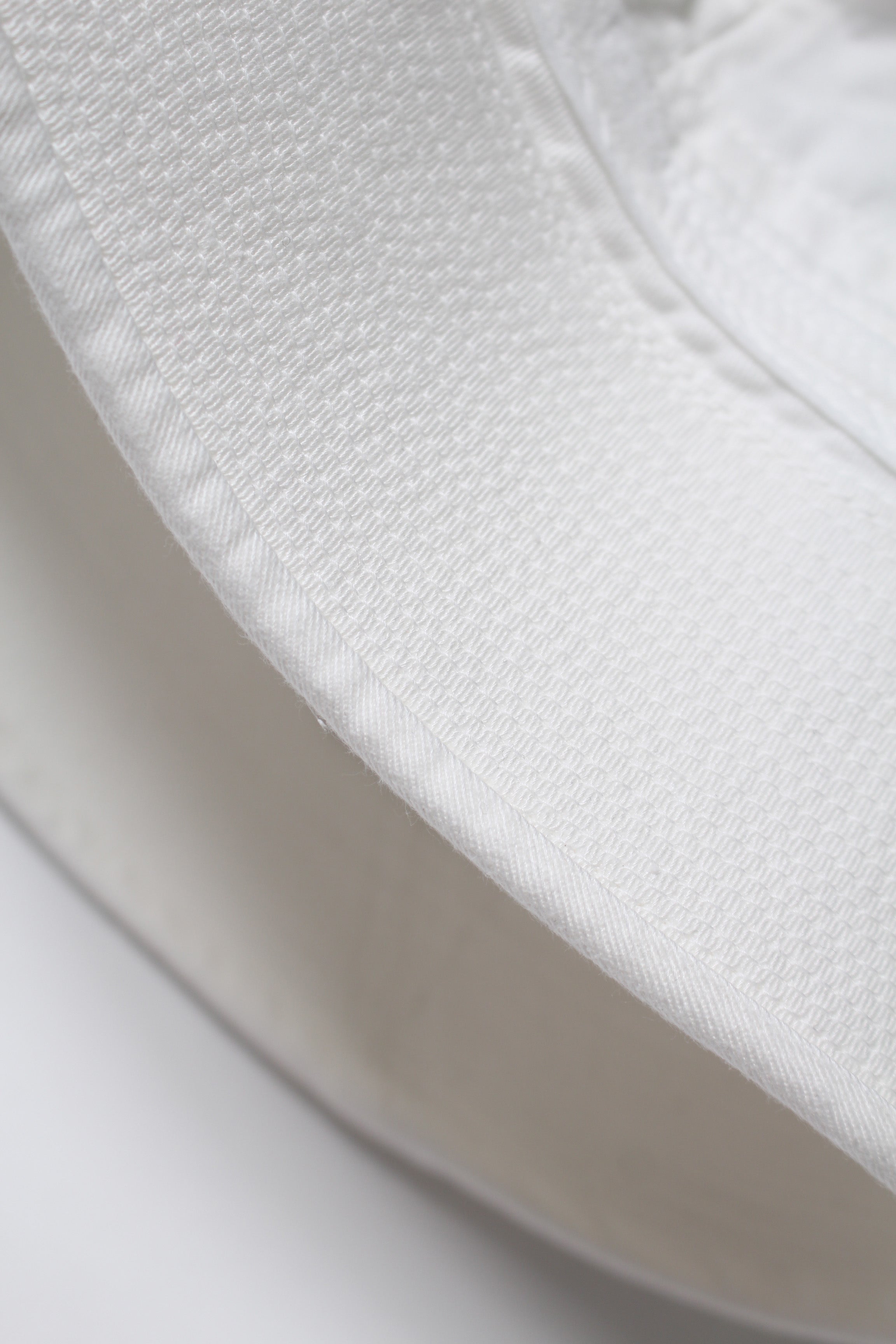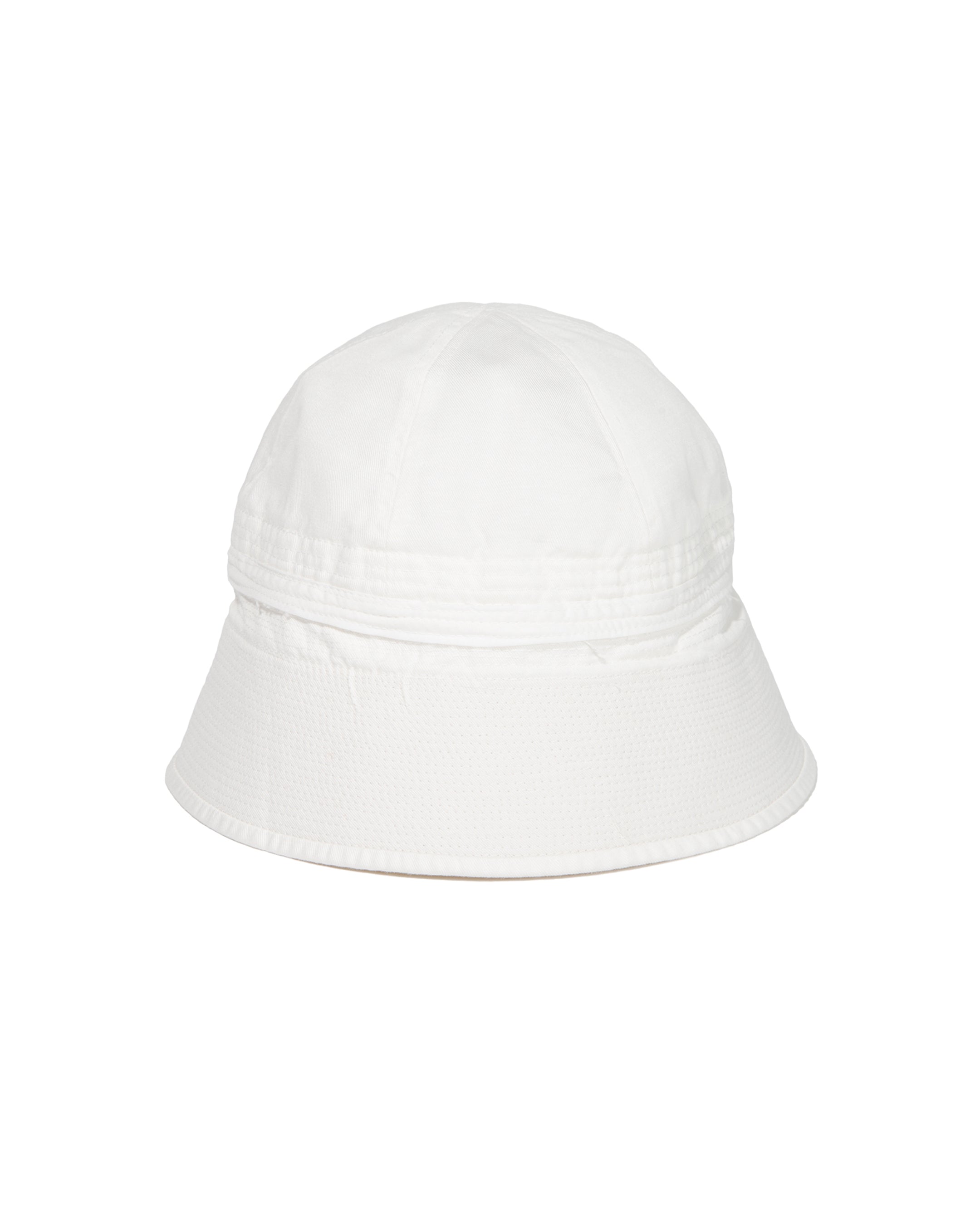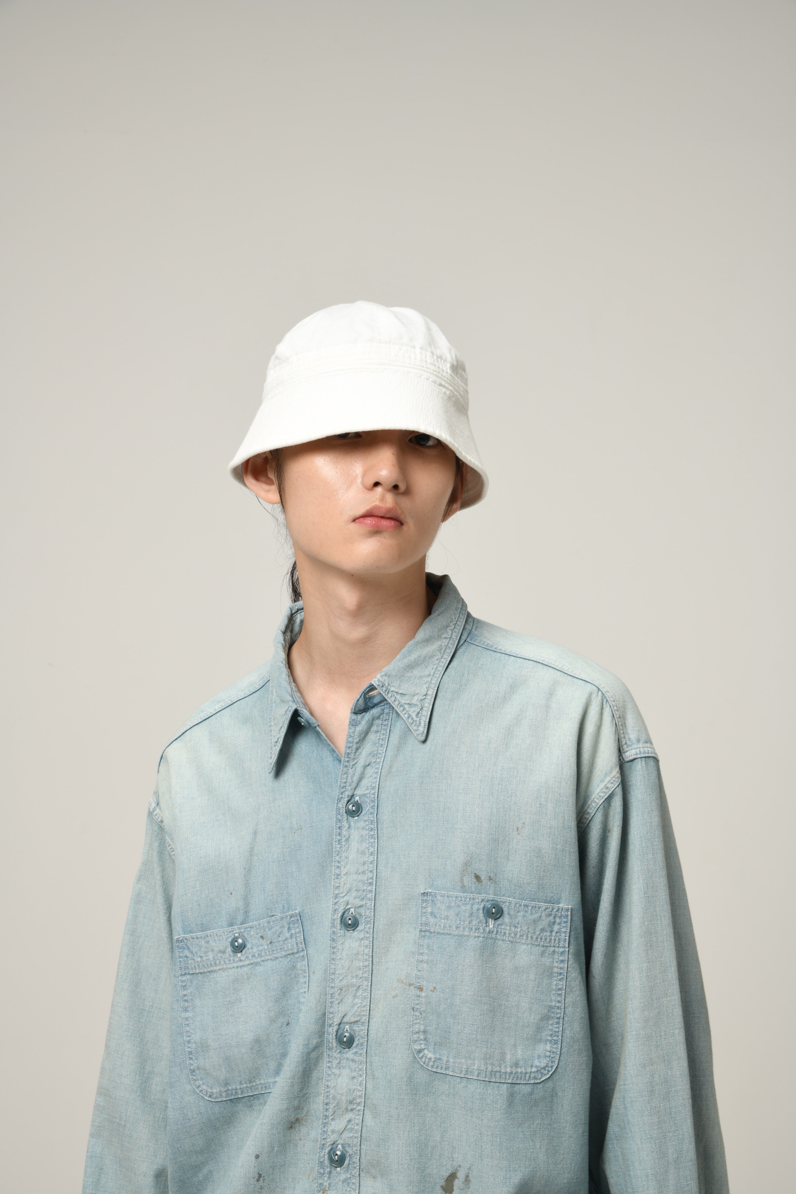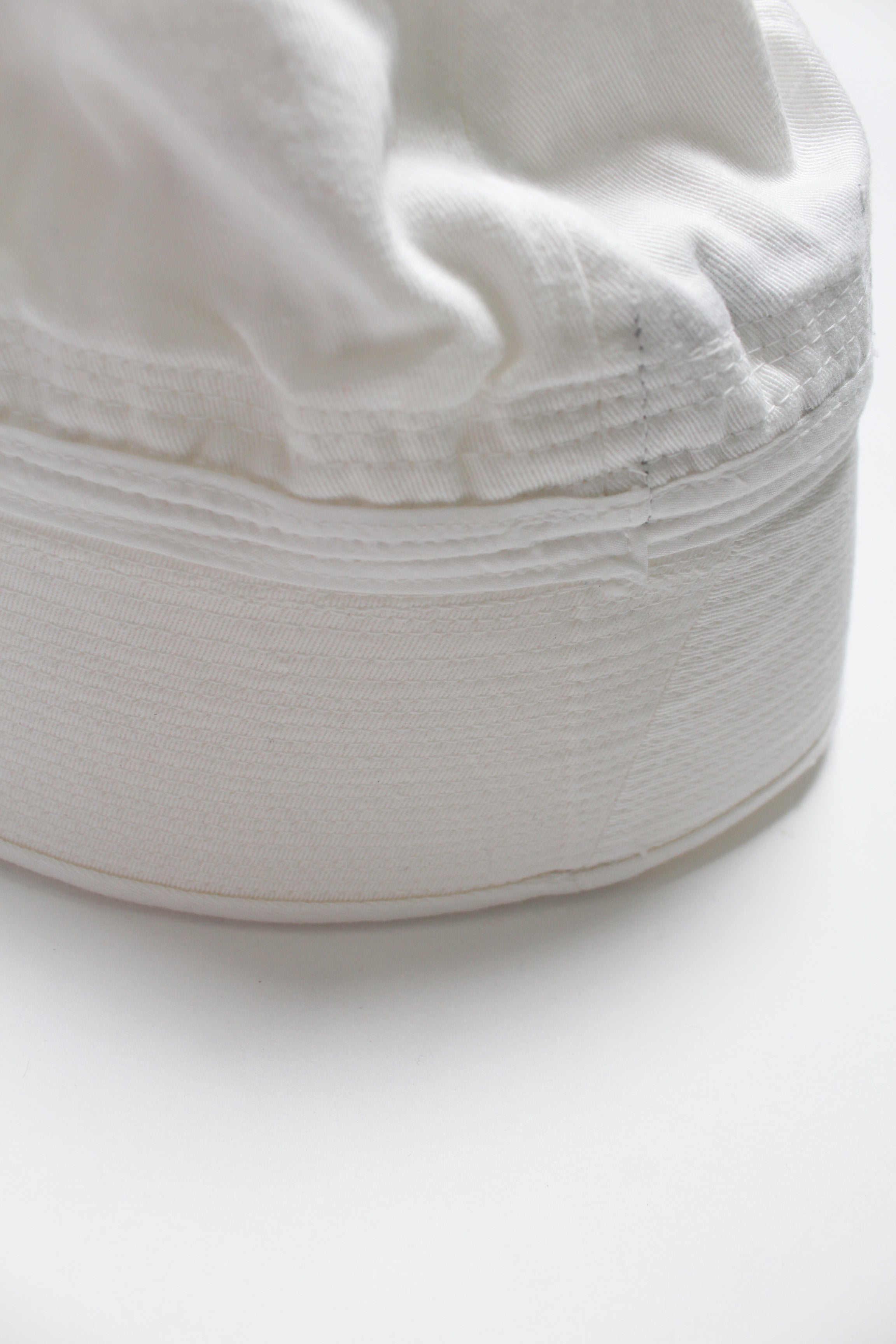 オフホワイトの状態で支給され、そのまま着用されていた40年代US NAVYセーラーハットを背景にした仕様。 甲板作業や屋外業務で使われることを前提とした作業用ヘッドギアならではの、軽さとラフさを残した佇まいが特徴。 日差しを避けるための実用品として使われていた当時の空気感を意識。素のままの表情を活かした仕上がり。