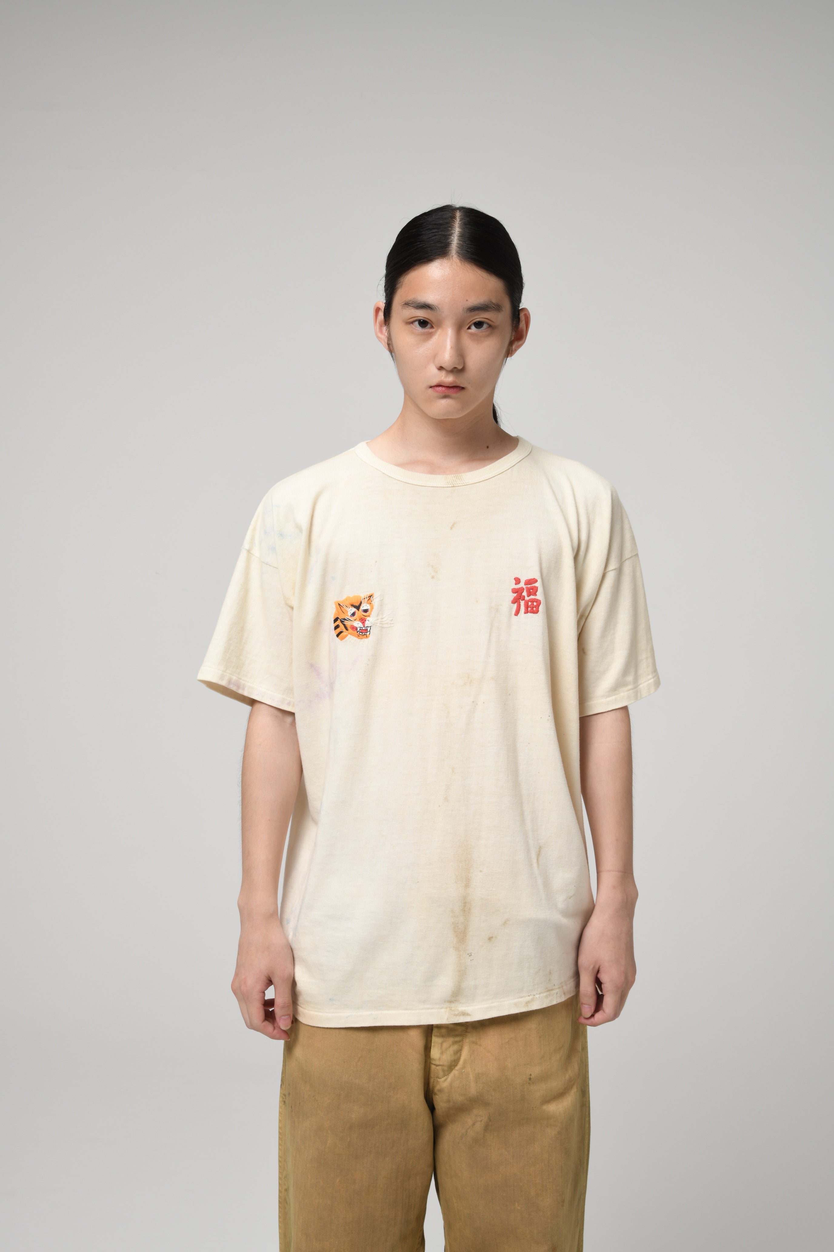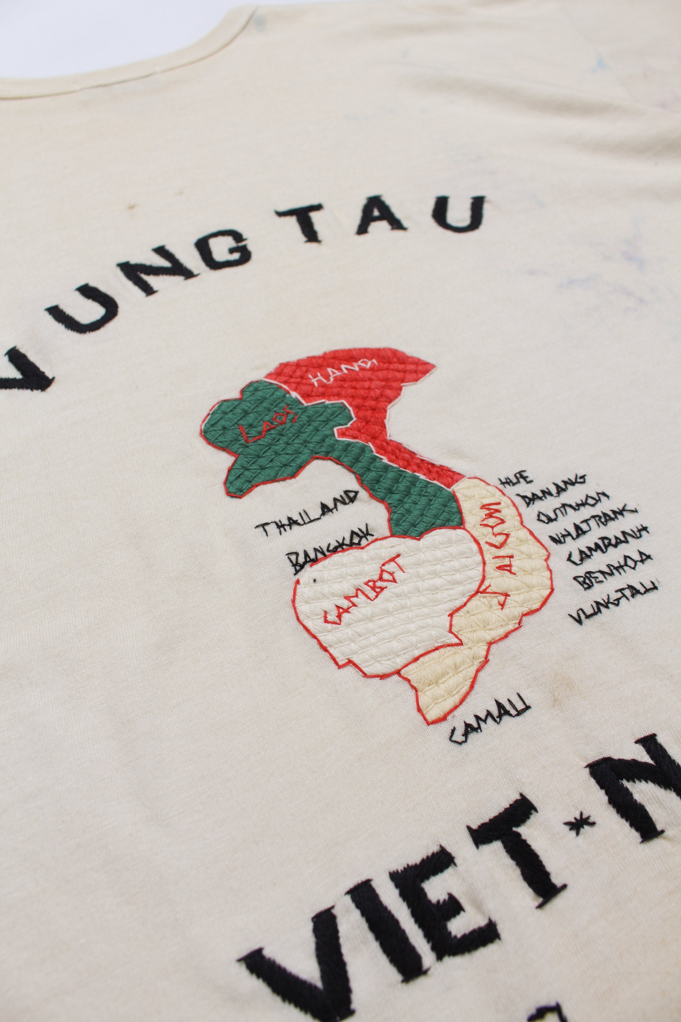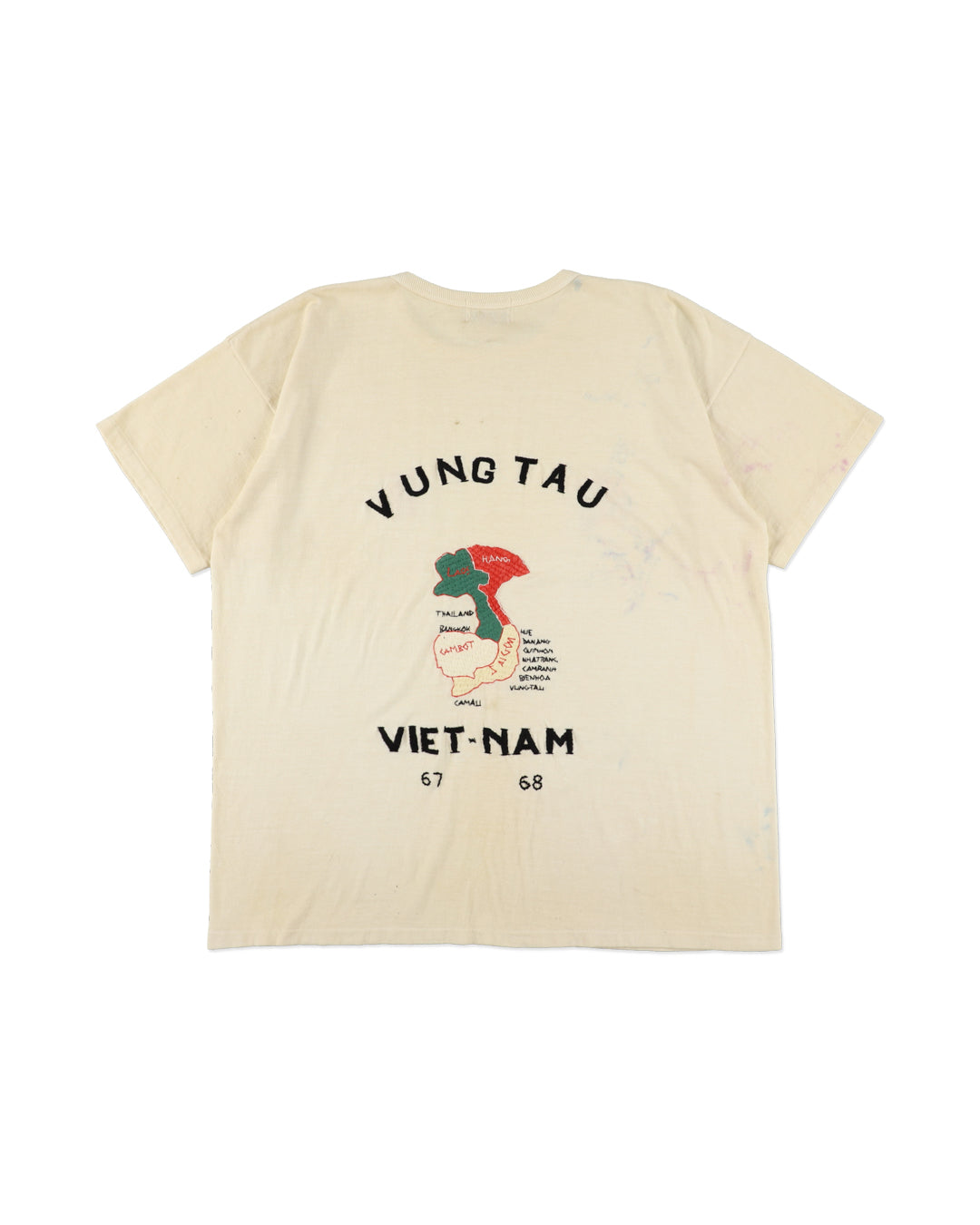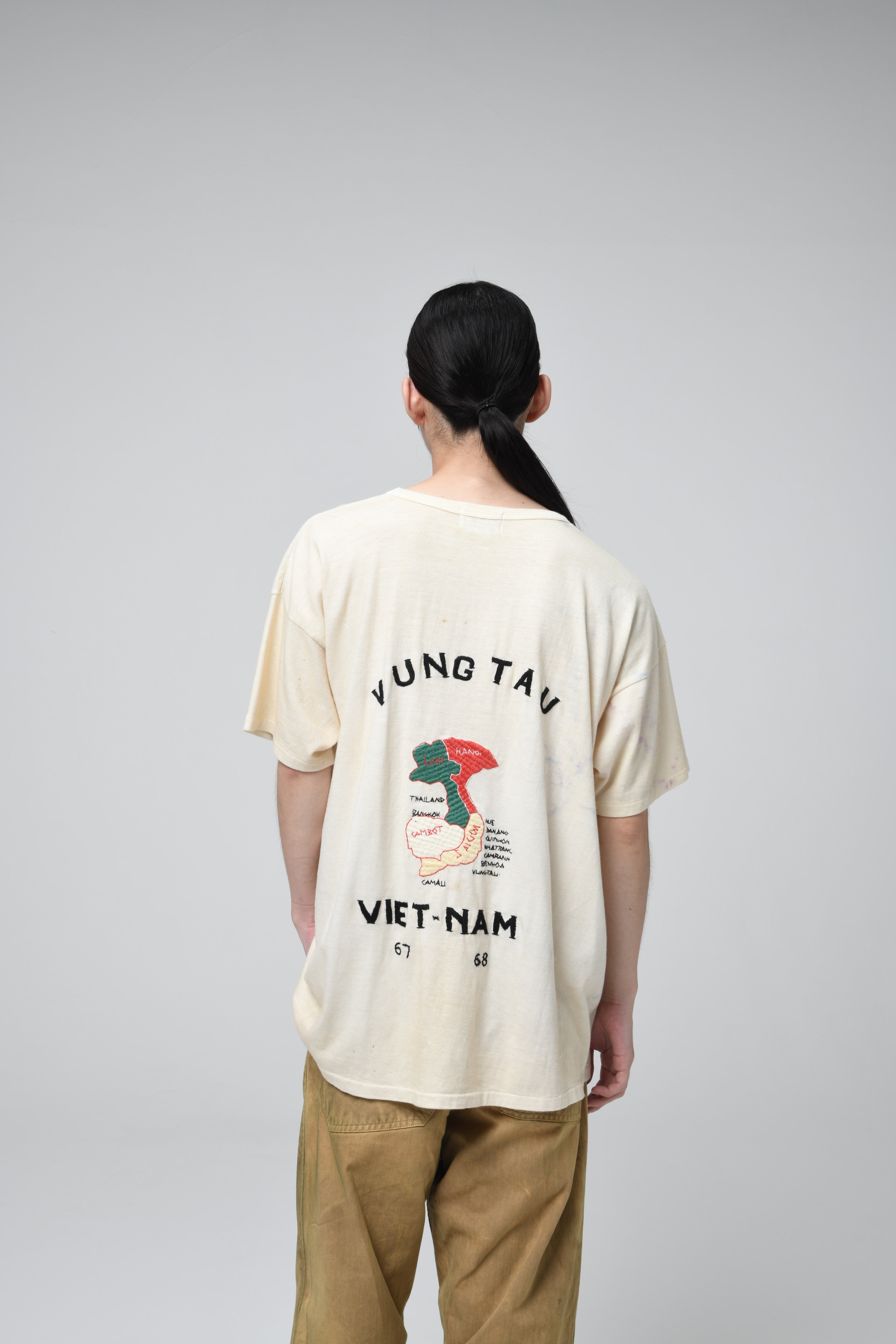 A T-shirt that translates the atmosphere of Vietnam War-era souvenir jackets—often embroidered by soldiers locally—into a wearable graphic form. The rough, imperfect embroidery carries not only pride and remembrance, but also unease and irony, preserving the raw realism of wartime souvenirs. Finished on a tubular body inspired by 1980s rayon-blend tees, balancing rugged embroidery character with comfortable wear.