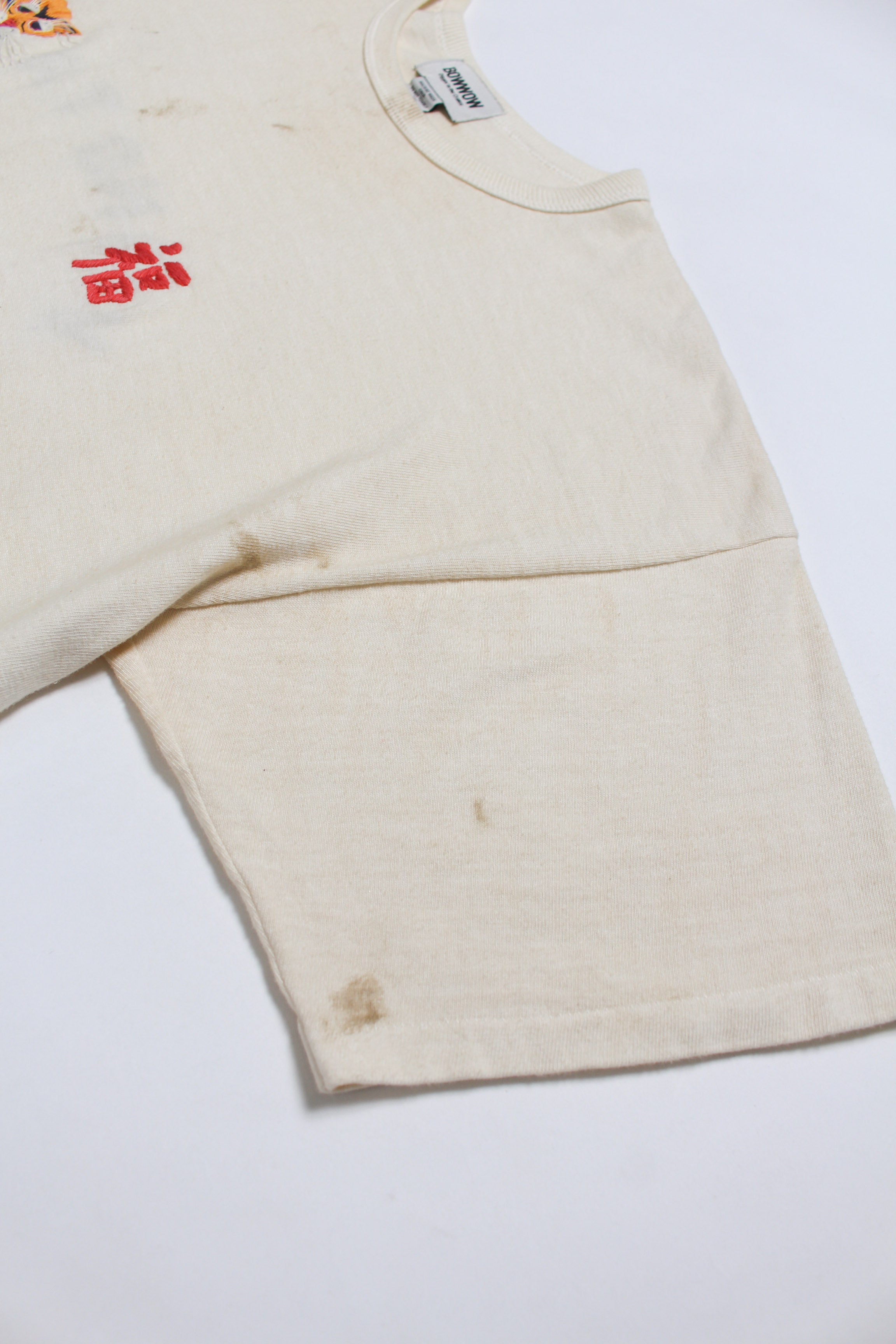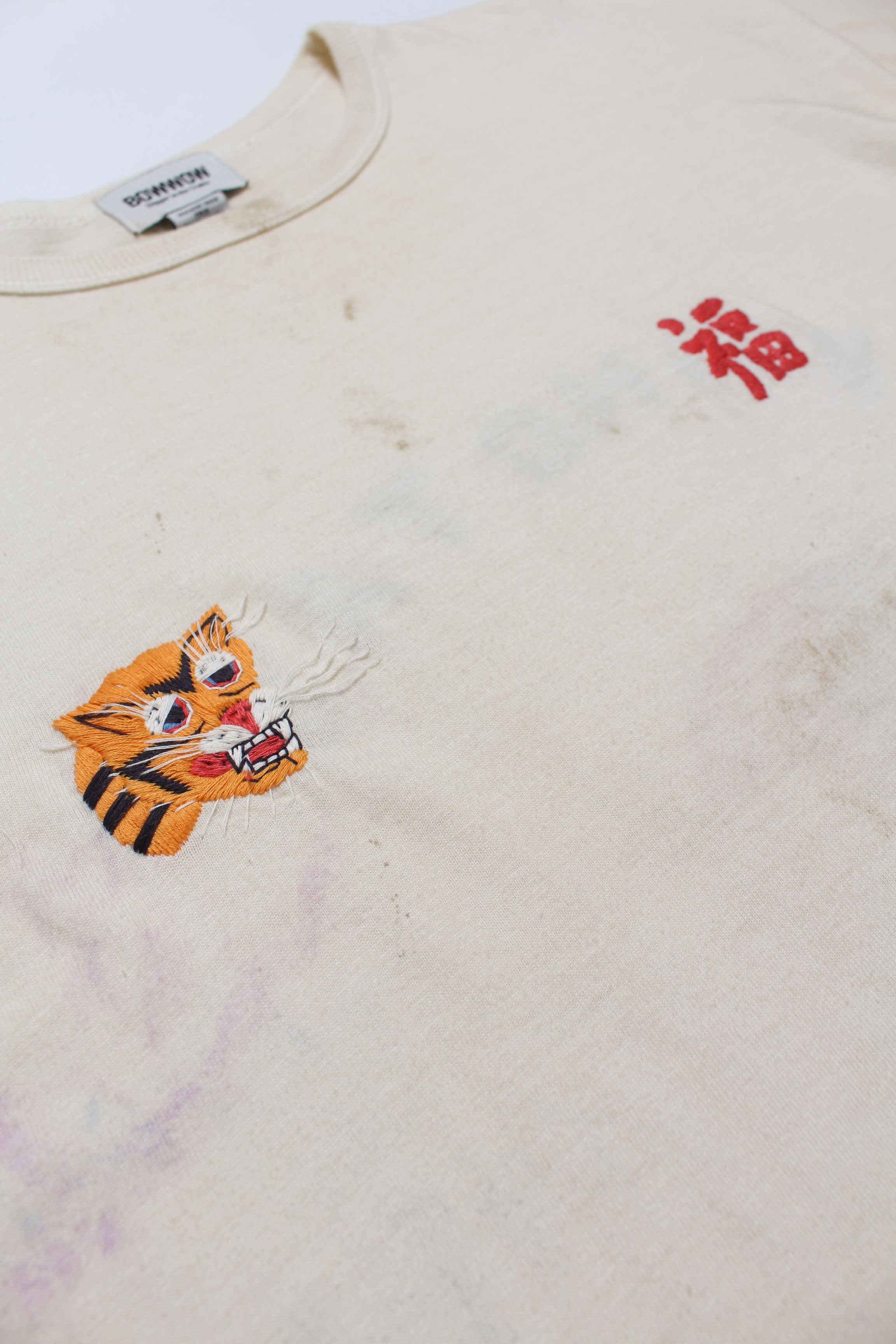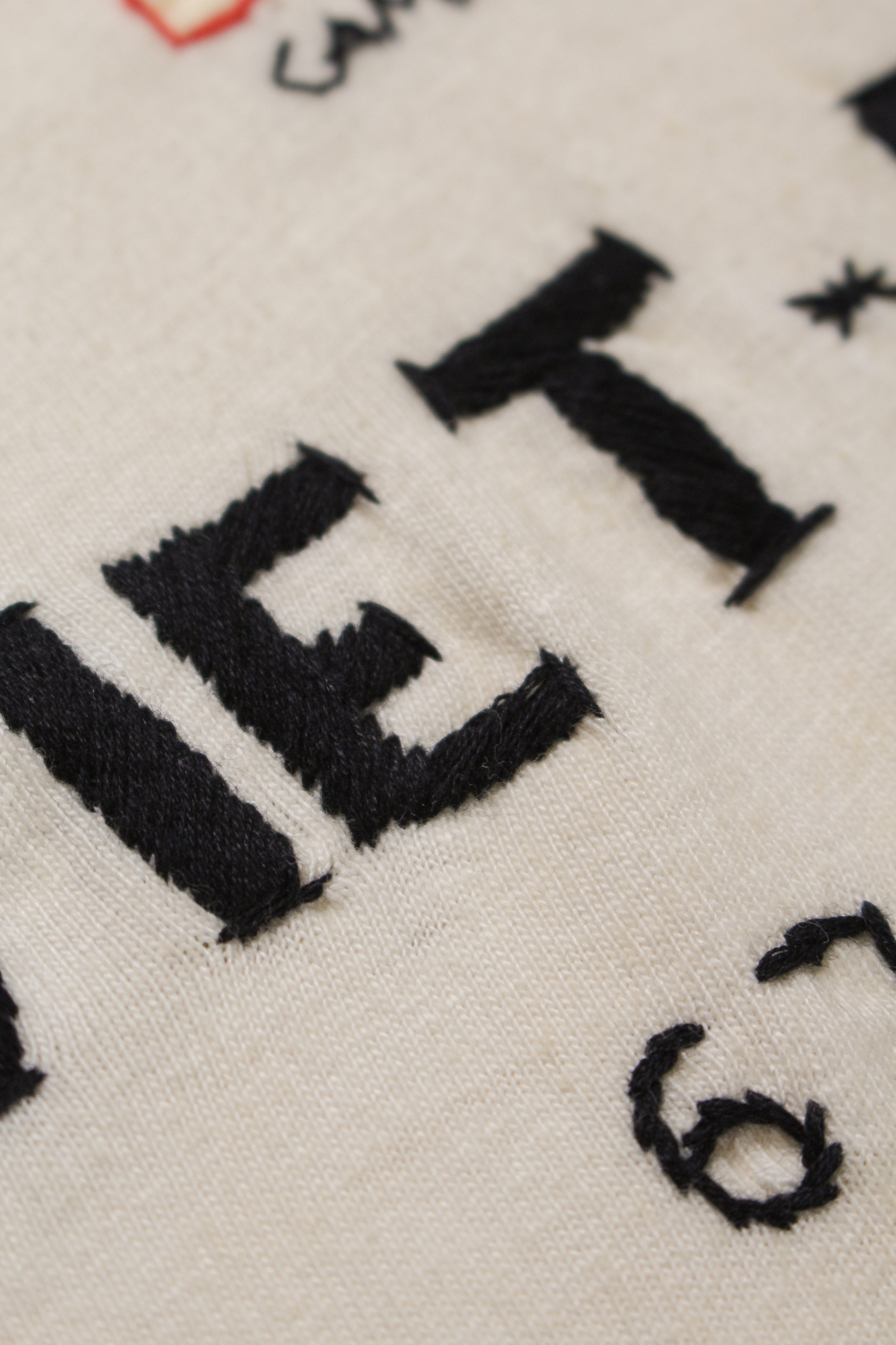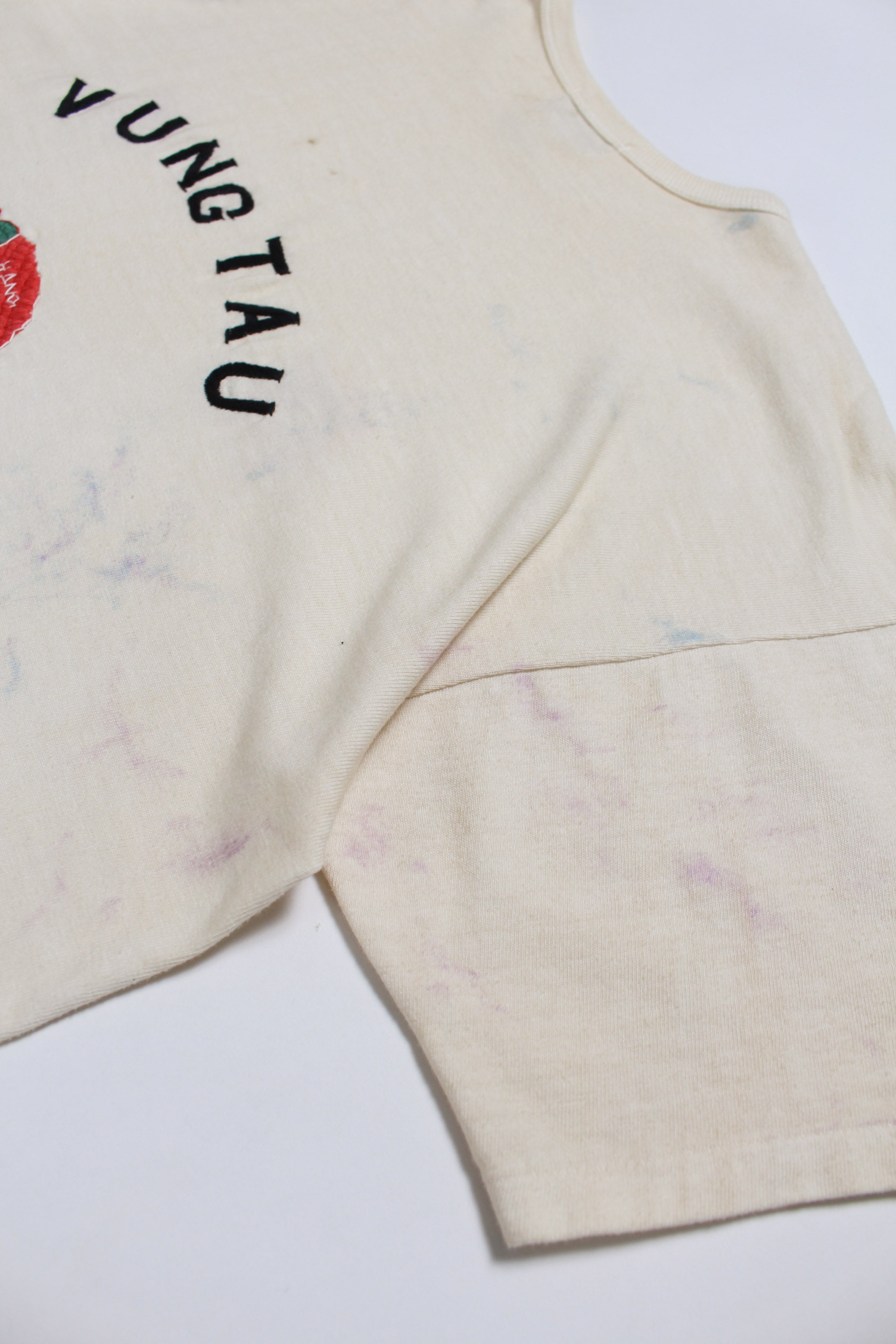 A T-shirt that translates the atmosphere of Vietnam War-era souvenir jackets—often embroidered by soldiers locally—into a wearable graphic form. The rough, imperfect embroidery carries not only pride and remembrance, but also unease and irony, preserving the raw realism of wartime souvenirs. Finished on a tubular body inspired by 1980s rayon-blend tees, balancing rugged embroidery character with comfortable wear.