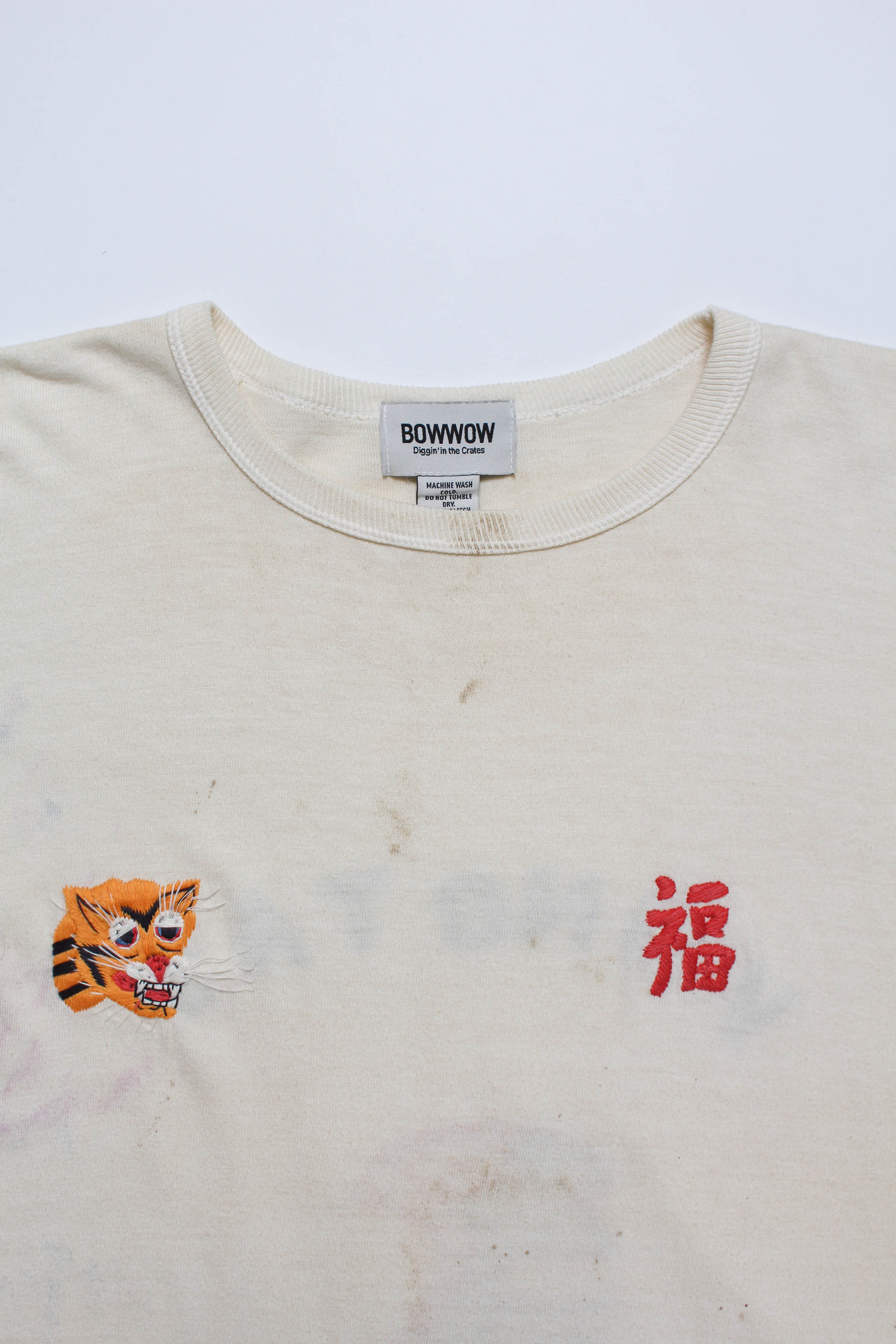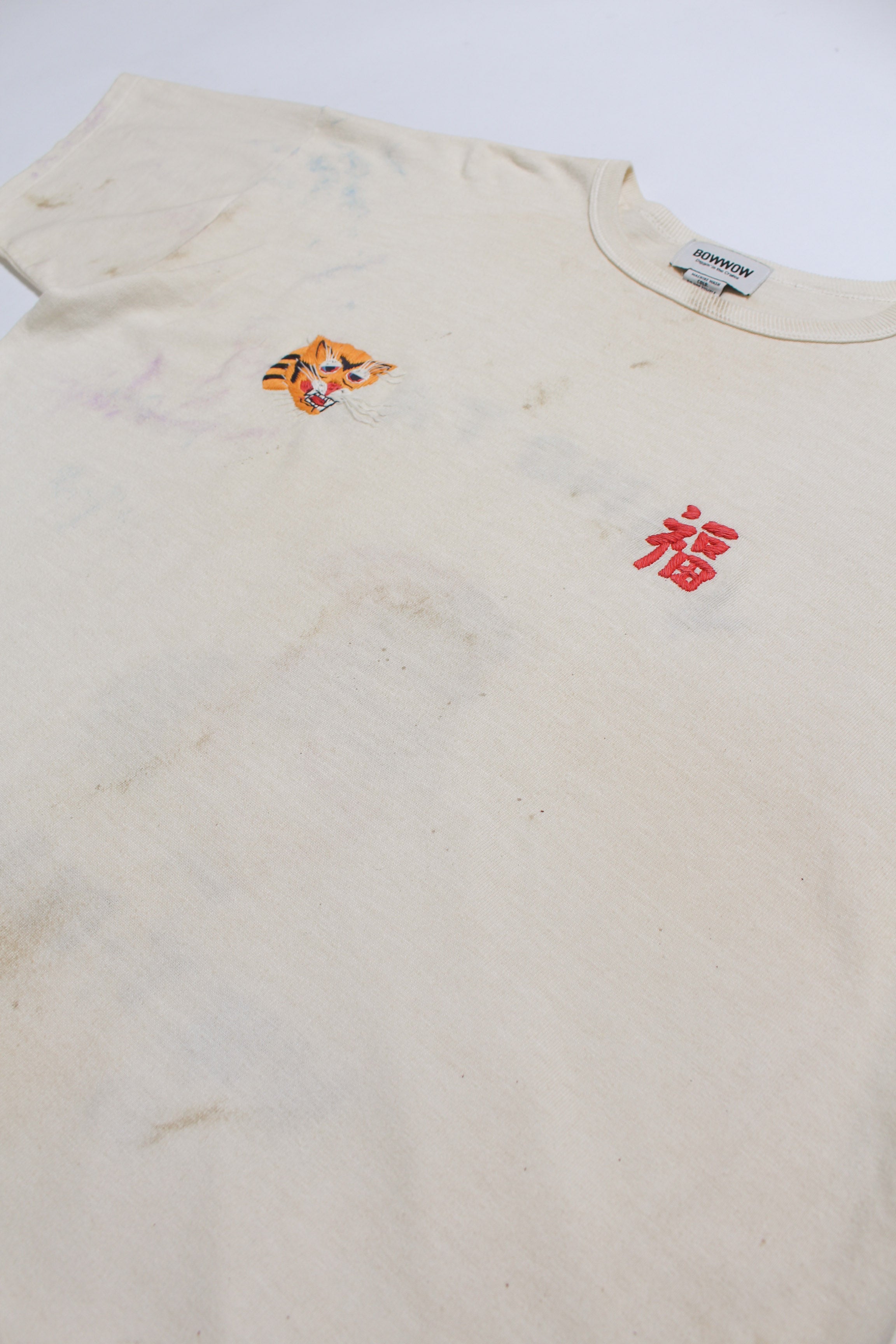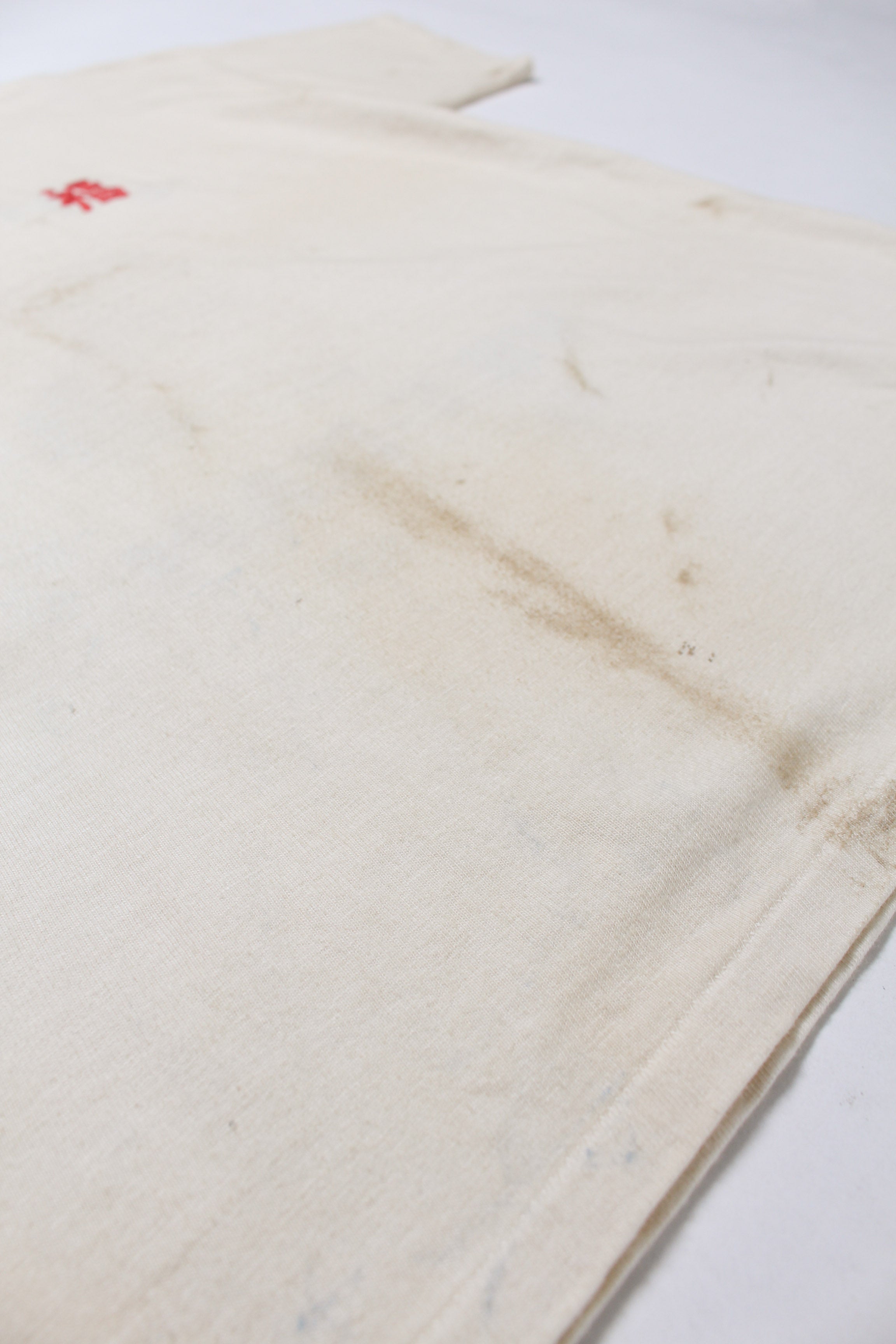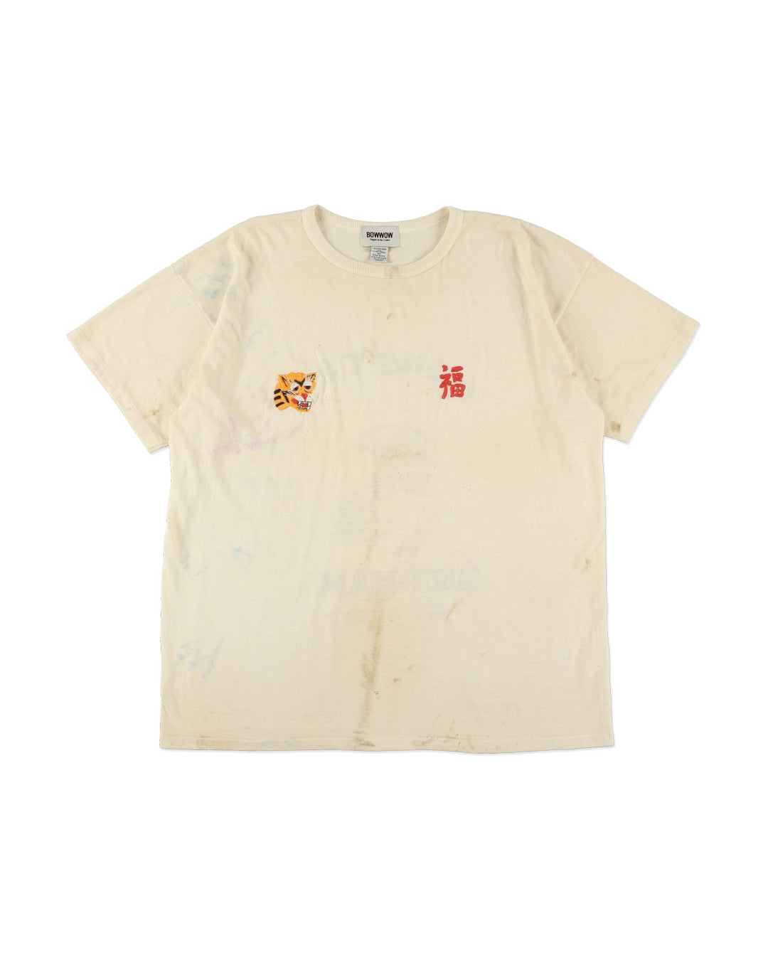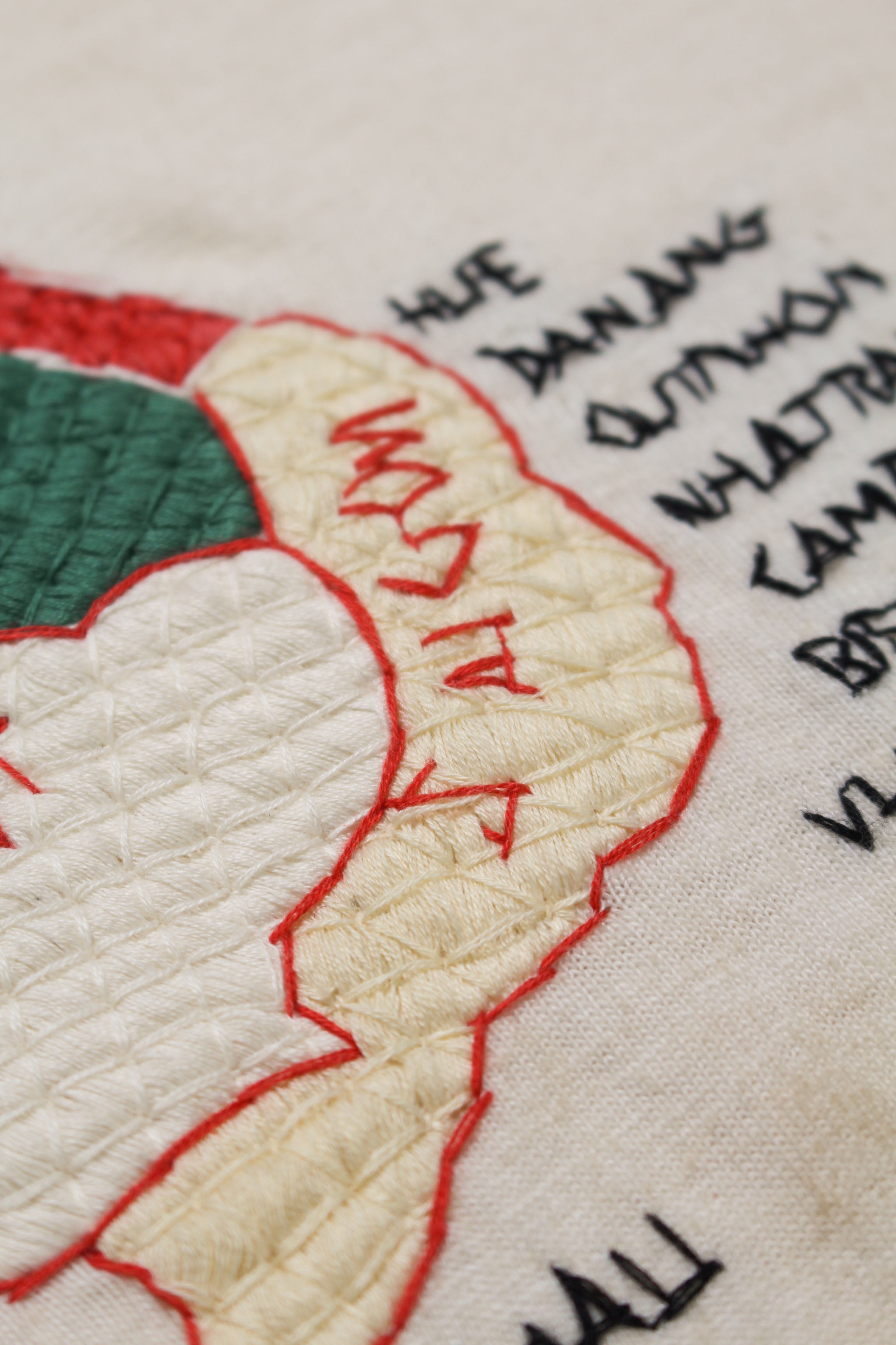 A T-shirt that translates the atmosphere of Vietnam War-era souvenir jackets—often embroidered by soldiers locally—into a wearable graphic form. The rough, imperfect embroidery carries not only pride and remembrance, but also unease and irony, preserving the raw realism of wartime souvenirs. Finished on a tubular body inspired by 1980s rayon-blend tees, balancing rugged embroidery character with comfortable wear.