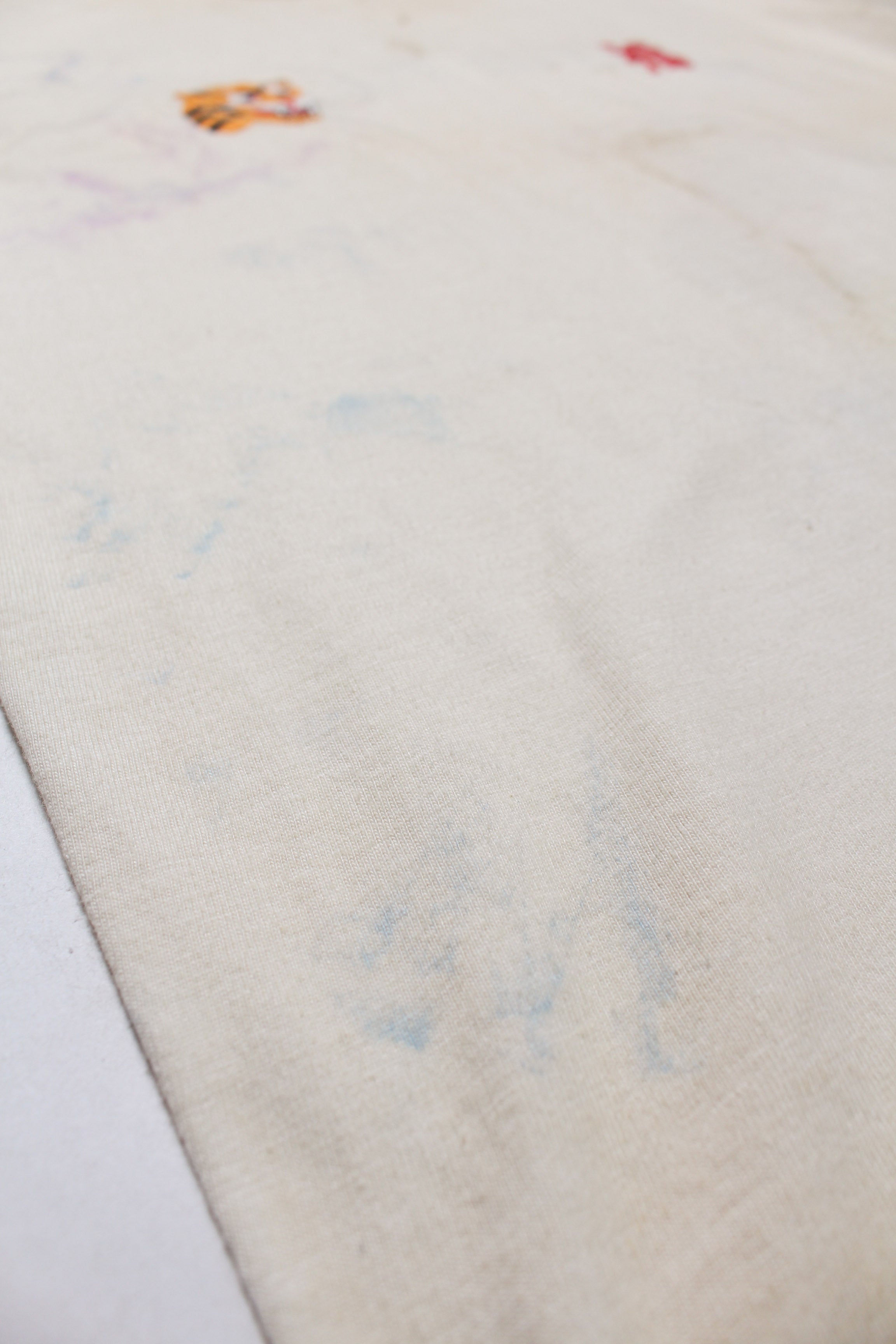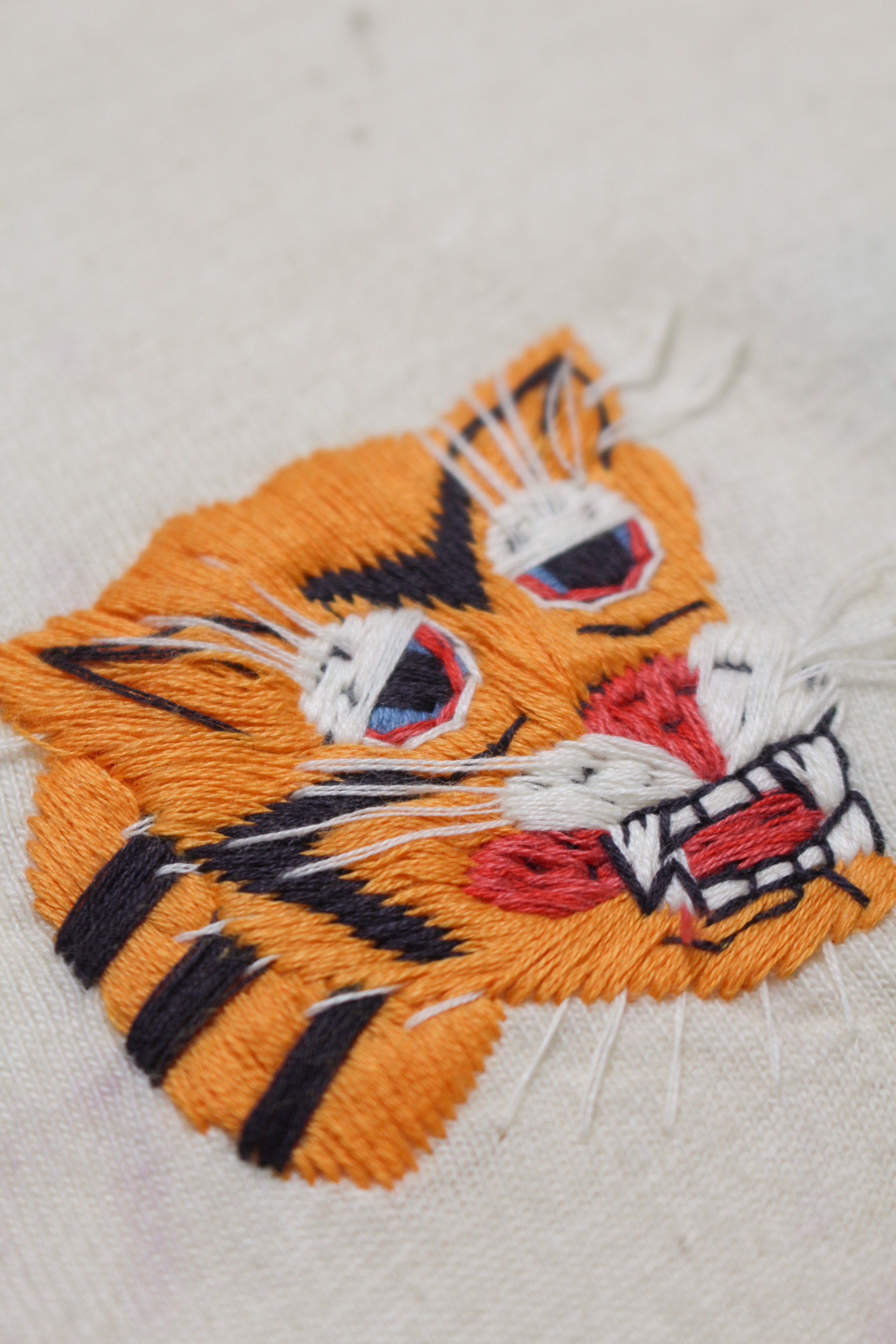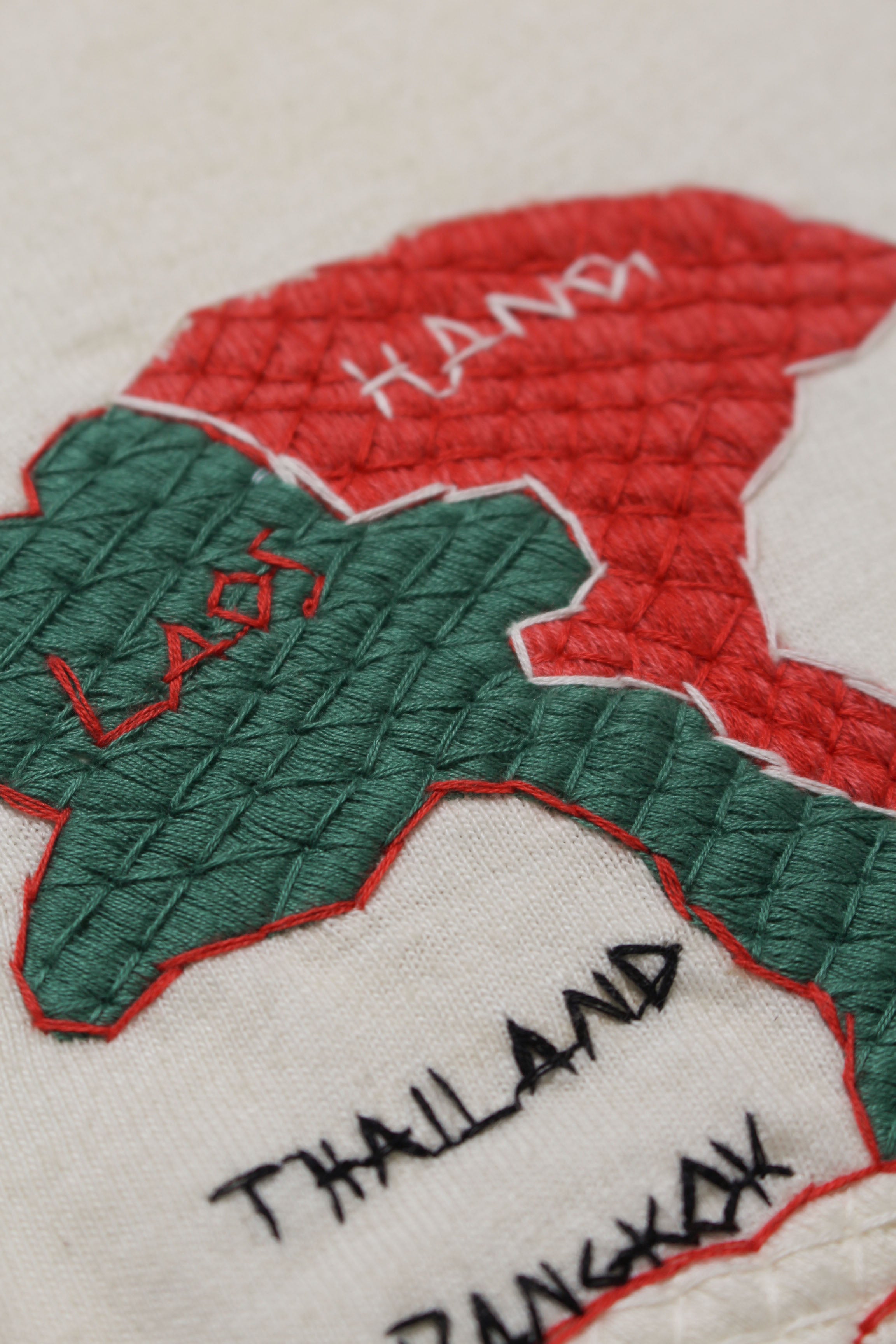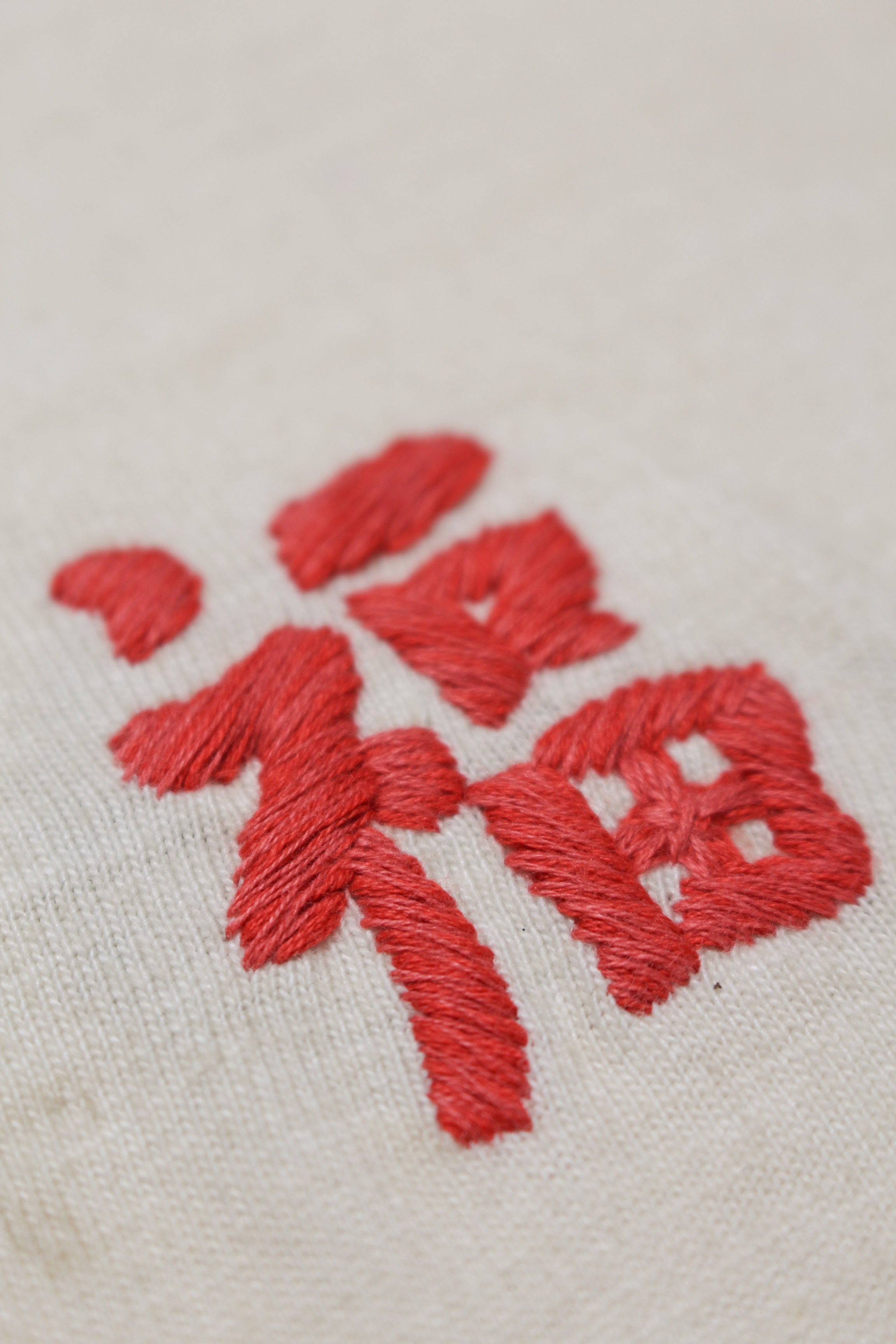 A T-shirt that translates the atmosphere of Vietnam War-era souvenir jackets—often embroidered by soldiers locally—into a wearable graphic form. The rough, imperfect embroidery carries not only pride and remembrance, but also unease and irony, preserving the raw realism of wartime souvenirs. Finished on a tubular body inspired by 1980s rayon-blend tees, balancing rugged embroidery character with comfortable wear.