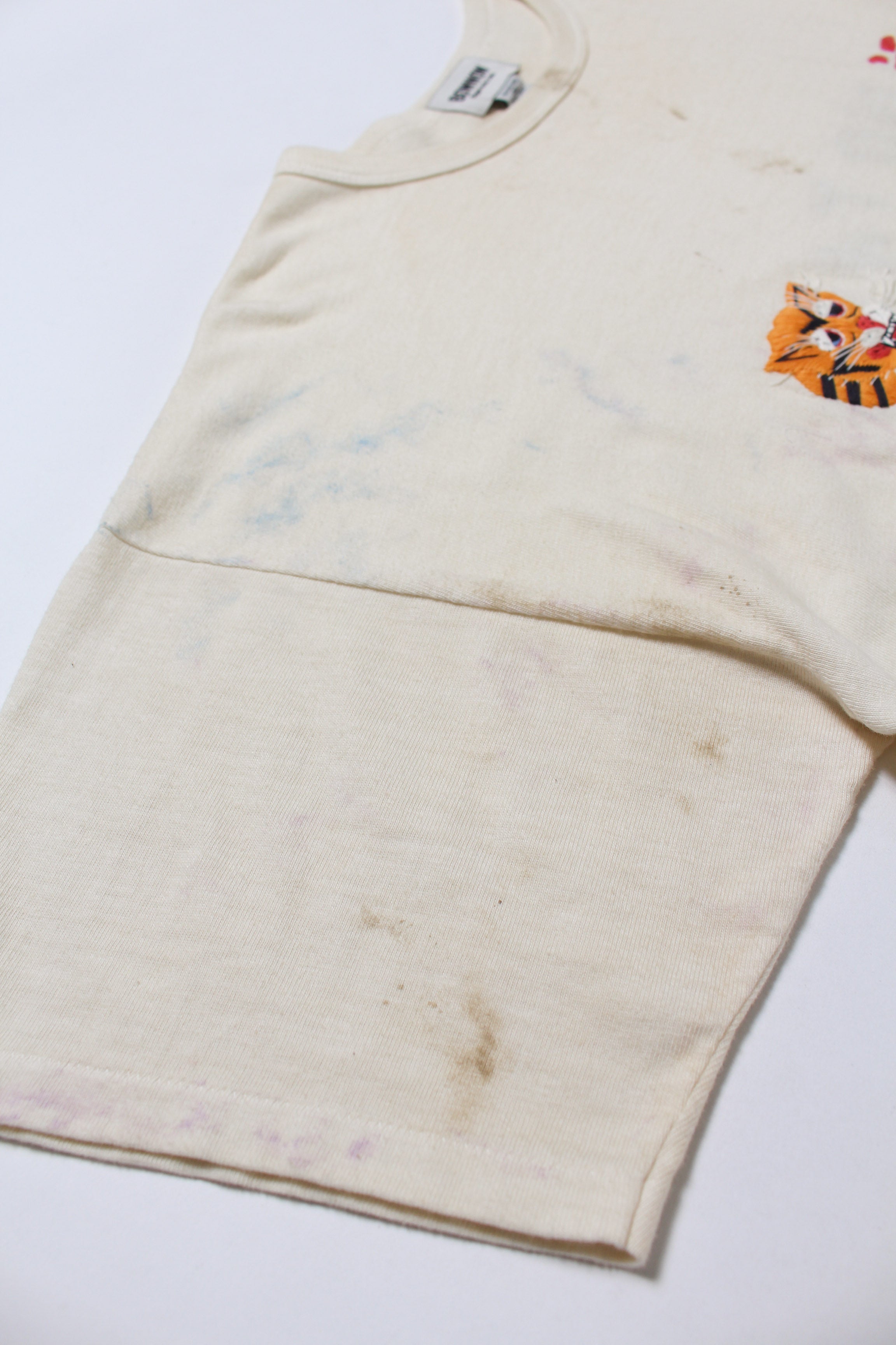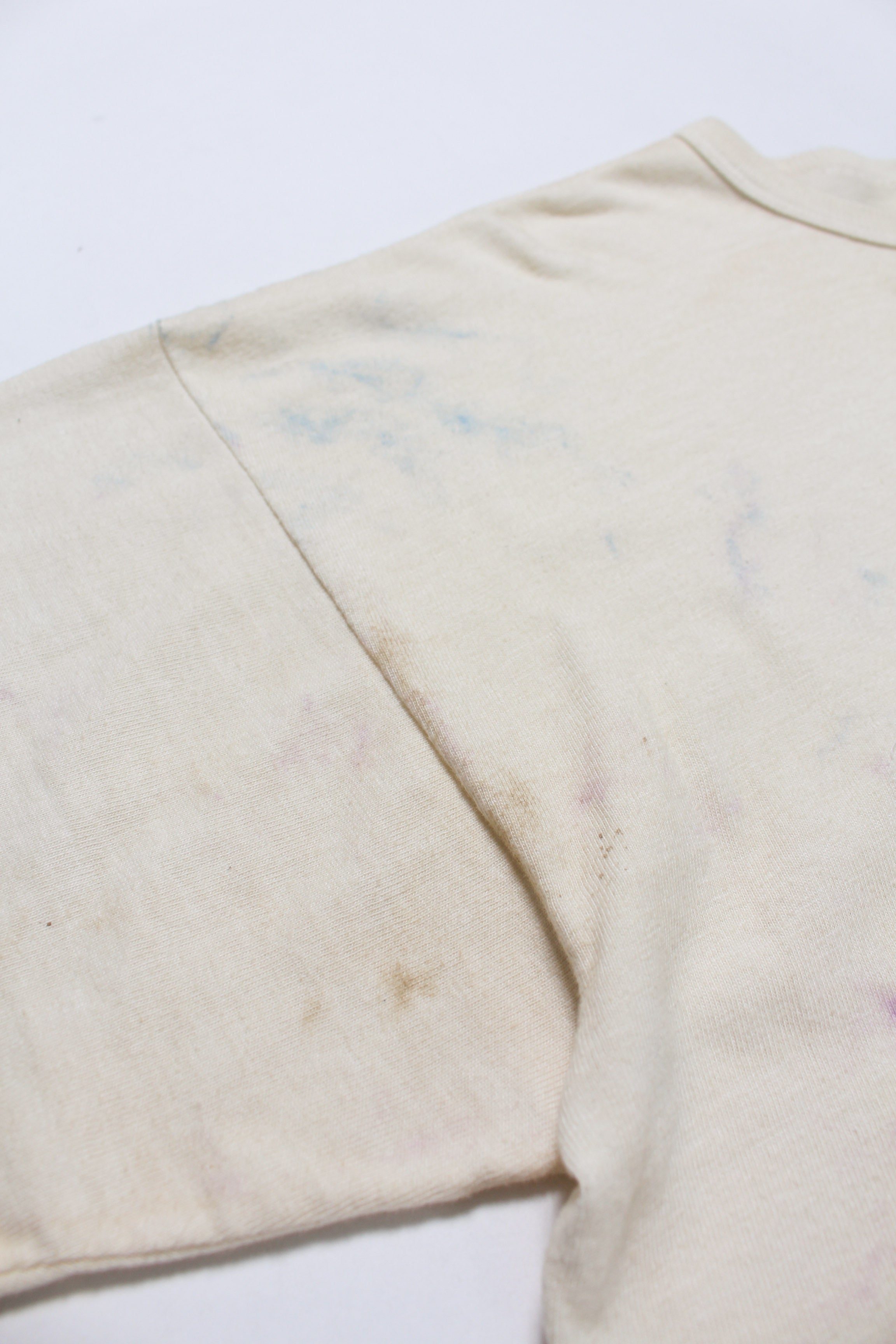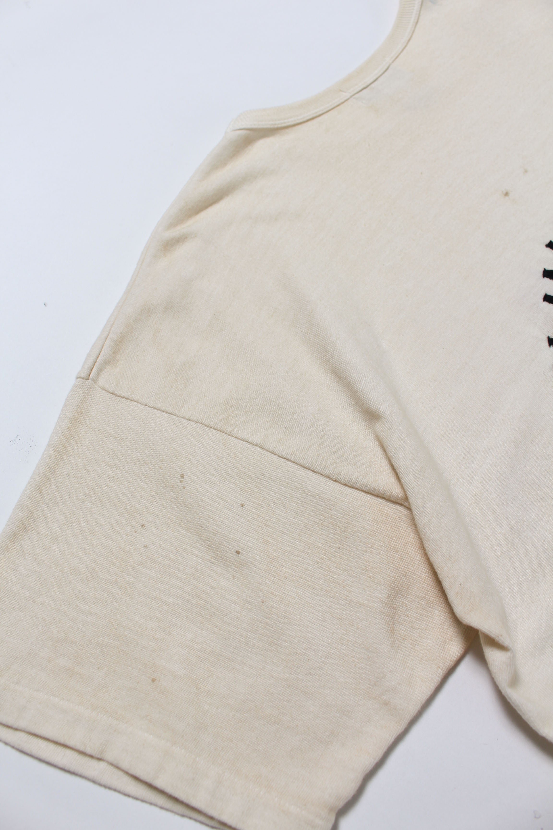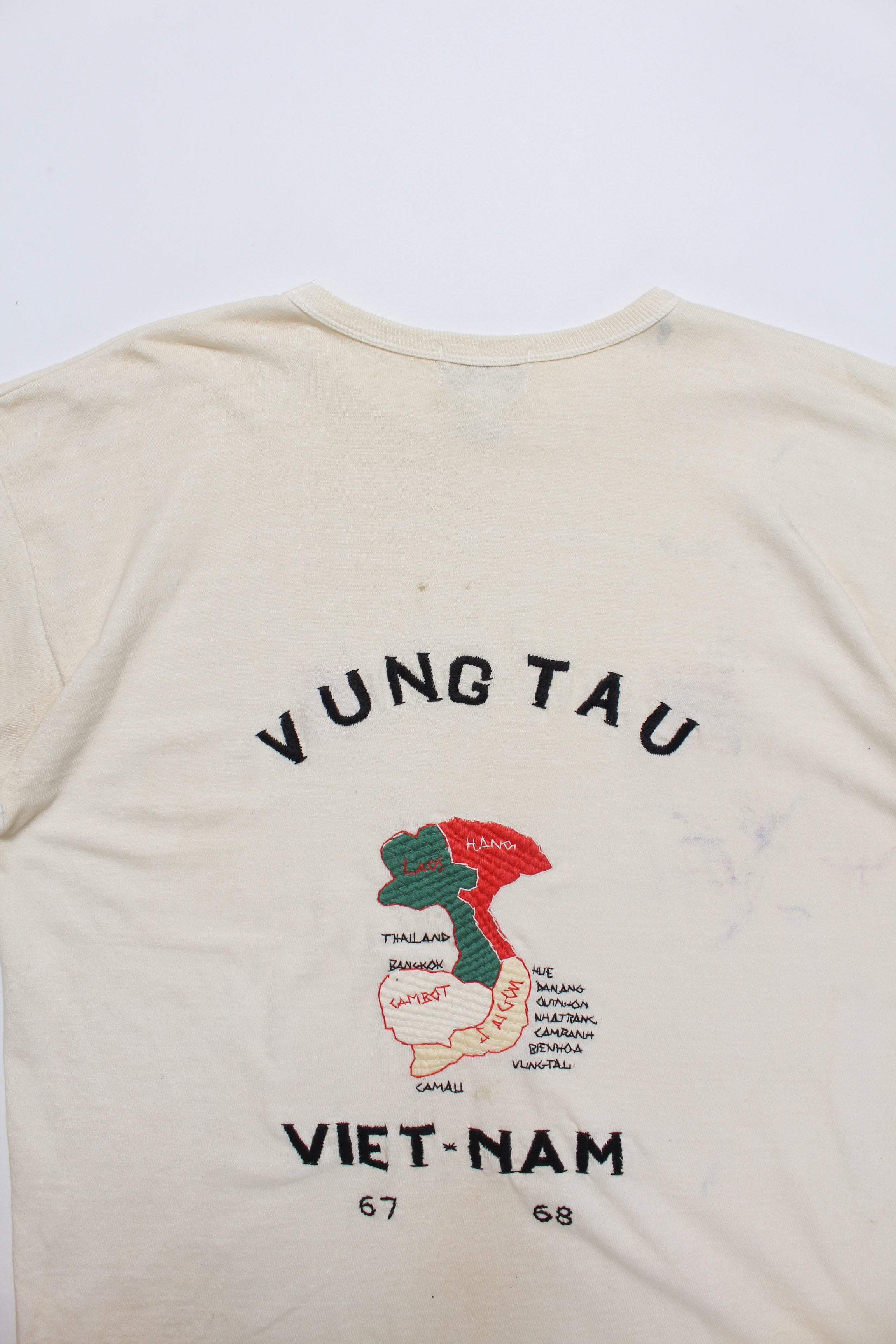 ベトナム戦争期、現地で兵士自身が刺繍を入れたスーベニアジャケットの空気感を、そのままTシャツに落とし込んだデザイン。基地の外でオーダーし、任務の合間に受け取って着ていた私物の延長線をイメージしている。 ラフで歪みのある刺繍表現には、記念や誇りだけでなく、不安や皮肉といった感情の揺れも含ませ、戦地で生まれたスーベニアならではの生々しさを残している。 ボディには80年代のレーヨン混Tシャツの空気感を意識した丸胴仕様を採用し、刺繍の持つ荒さと、着心地の良さが共存するバランスに仕上げている。